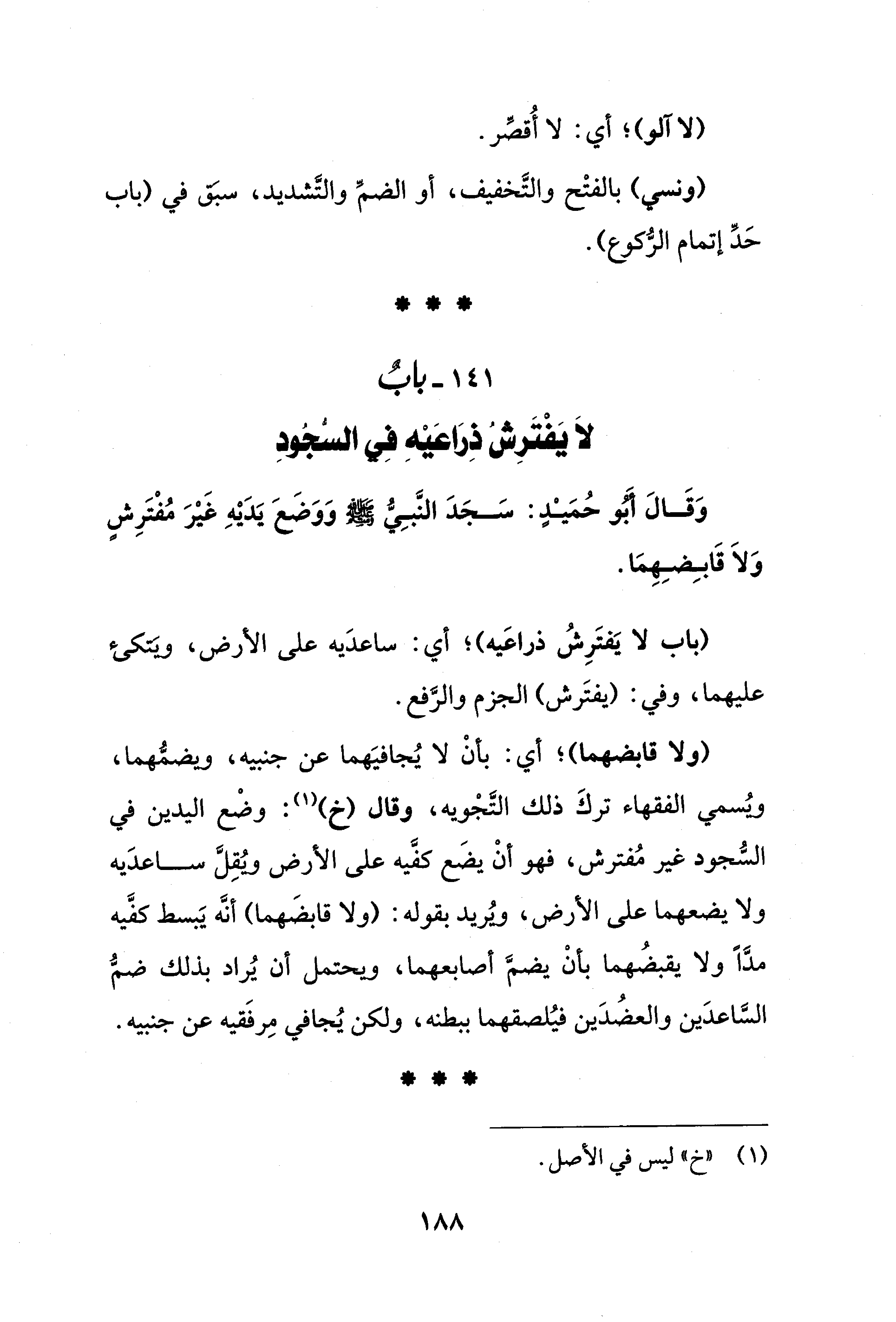 141 - بابٌ لَا يَفْتَرِش ذِرَاعَيْهِ فِي السُّجُودِ