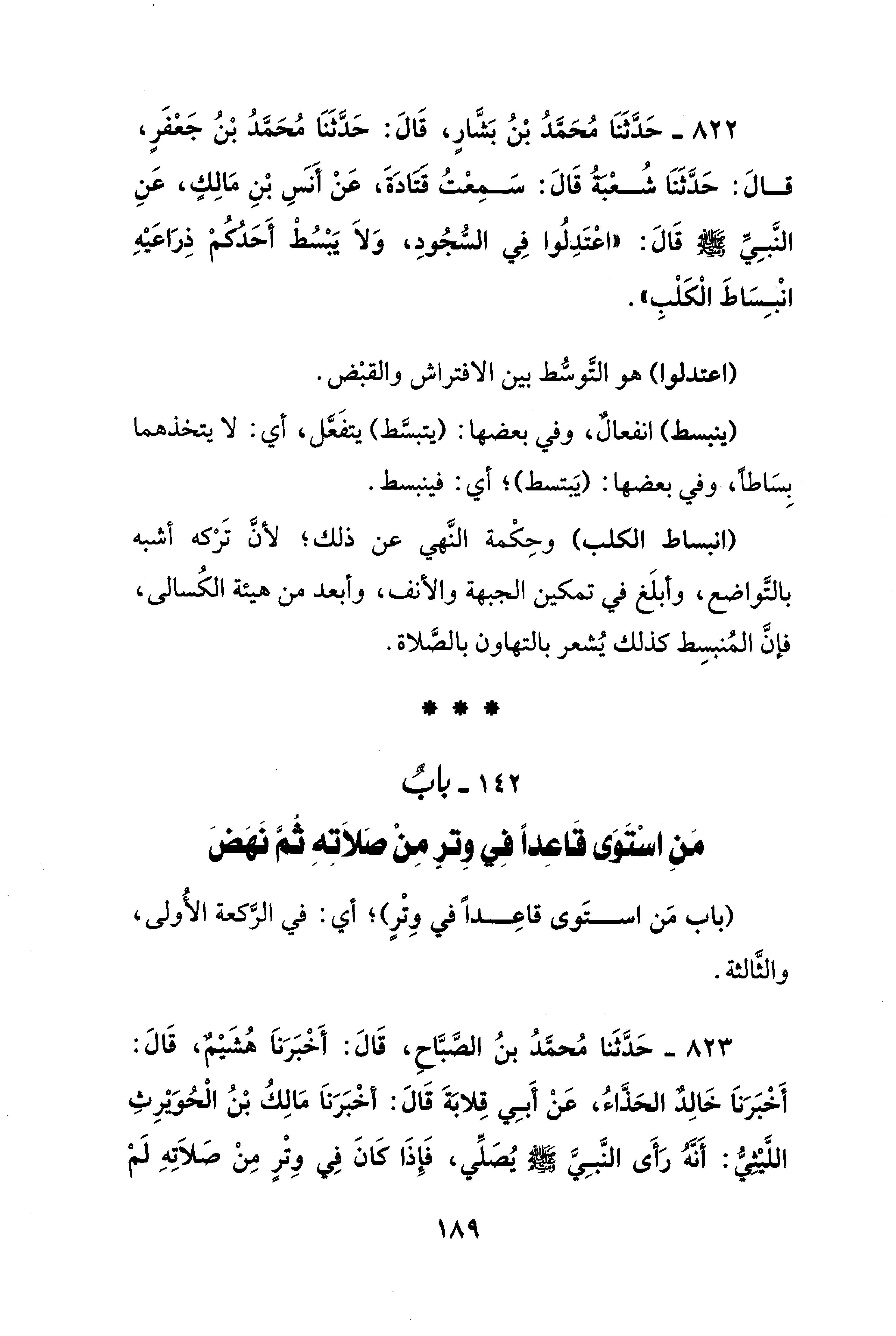 822 - حَدَّثَنَا مُحَمَّدُ بْنُ بَشَّارٍ، قَالَ: حَدَّثَنَا مُحَمَّدُ بْنُ جَعْفَرٍ، قَالَ: حَدَّثَنَا شُعْبَةُ، قَالَ: سَمِعْتُ قَتَادَةَ، عَنْ أَنَسِ بْنِ مَالِكٍ، عَنِ النَّبِيِّ - صلى الله عليه وسلم - قَالَ: "اعْتَدِلُوا فِي السُّجُودِ، وَلَا يَبْسُطْ أَحَدُكُمْ ذِرَاعَيْهِ انْبِسَاطَ الكَلْبِ".