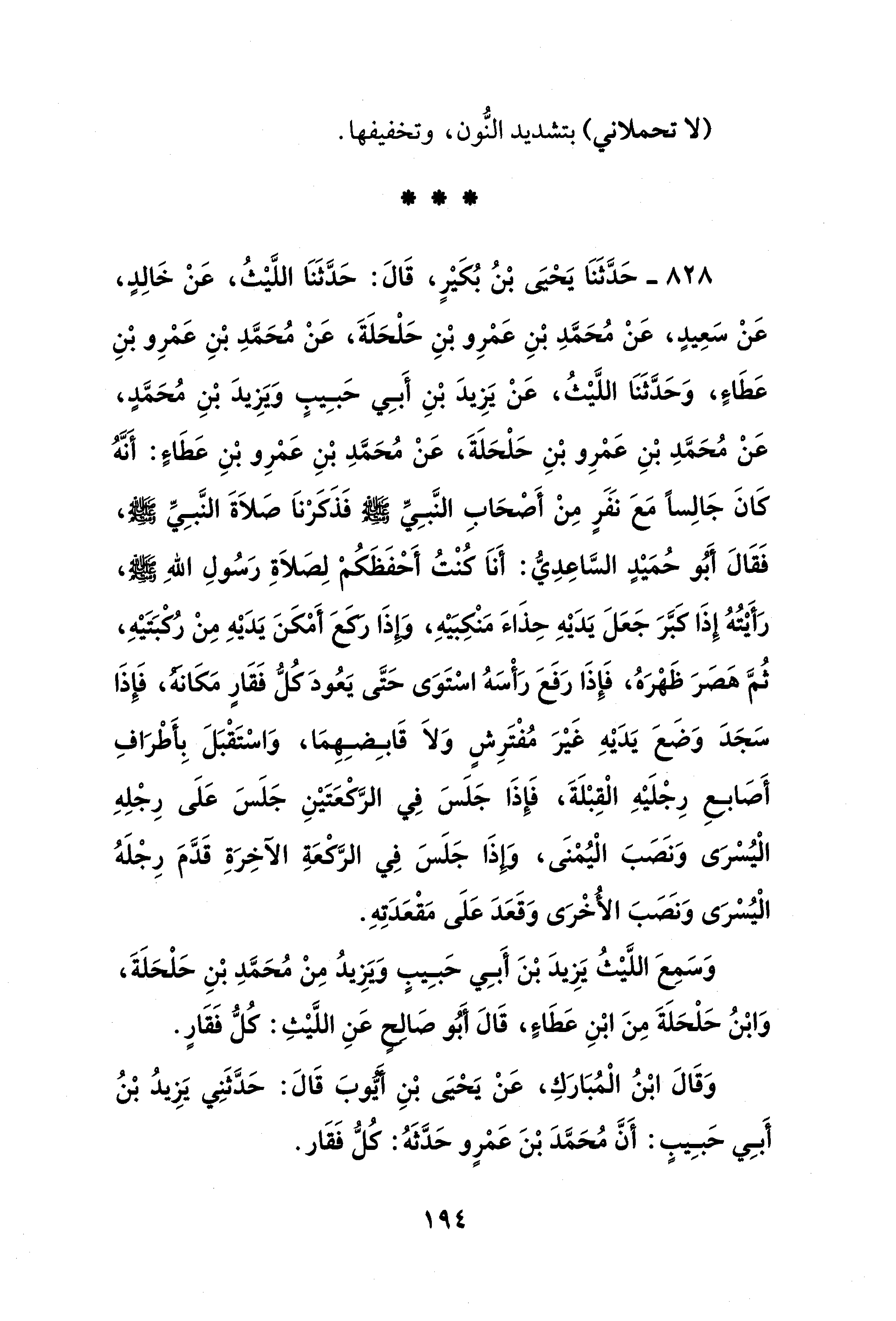 828 - حَدَّثَنَا يَحْيَى بْنُ بُكَيْرٍ، قَالَ: حَدَّثَنَا اللَّيْثُ، عَنْ خَالِدٍ، عَنْ سَعِيدٍ، عَنْ مُحَمَّدِ بْنِ عَمْرِو بْنِ حَلْحَلَةَ، عَنْ مُحَمَّدِ بْنِ عَمْرِو بْنِ عَطَاءٍ، وَحَدَّثَنَا اللَّيْثُ، عَنْ يَزِيدَ بْنِ أَبِي حَبِيبٍ وَيَزِيدَ بْنِ مُحَمَّدٍ، عَنْ مُحَمَّدِ بْنِ عَمْرِو بْنِ حَلْحَلَةَ، عَنْ مُحَمَّدِ بْنِ عَمْرِو بْنِ عَطَاءٍ، أَنَّهُ كَانَ جَالِسًا مَعَ نَفَرٍ مِنْ أَصْحَابِ النَّبِيِّ - صلى الله عليه وسلم -، فَذَكَرْنَا صَلاَةَ النَّبِيِّ - صلى الله عليه وسلم -، فَقَالَ أَبُو حُمَيْدٍ السَّاعِدِيُّ: أَنَا كُنْتُ أَحْفَظَكُمْ لِصَلاَةِ رَسُولِ اللَّهِ - صلى الله عليه وسلم -، رَأَيْتُهُ إِذَا كَبَّرَ جَعَلَ يَدَيْهِ حِذَاءَ مَنْكِبَيْهِ، وَإِذَا رَكَعَ أَمْكَنَ يَدَيْهِ مِنْ رُكْبَتَيْهِ، ثُمَّ هَصَرَ ظَهْرَهُ، فَإِذَا رَفَعَ رَأْسَهُ اسْتَوَى حَتَّى يَعُودَ كُلُّ فَقَارٍ مَكَانَهُ، فَإِذَا سَجَدَ وَضَعَ يَدَيْهِ غَيْرَ مُفْتَرِشٍ وَلاَ قَابِضِهِمَا، وَاسْتَقْبَلَ بِأَطْرَافِ أَصَابِعِ رِجْلَيْهِ القِبْلَةَ، فَإِذَا جَلَسَ فِي الرَّكْعَتَيْنِ جَلَسَ عَلَى رِجْلِهِ اليُسْرَى، وَنَصَبَ اليُمْنَى، وَإِذَا جَلَسَ فِي الرَّكْعَةِ الآخِرَةِ قَدَّمَ رِجْلَهُ اليُسْرَى، وَنَصَبَ الأُخْرَى وَقَعَدَ عَلَى مَقْعَدَتِهِ.