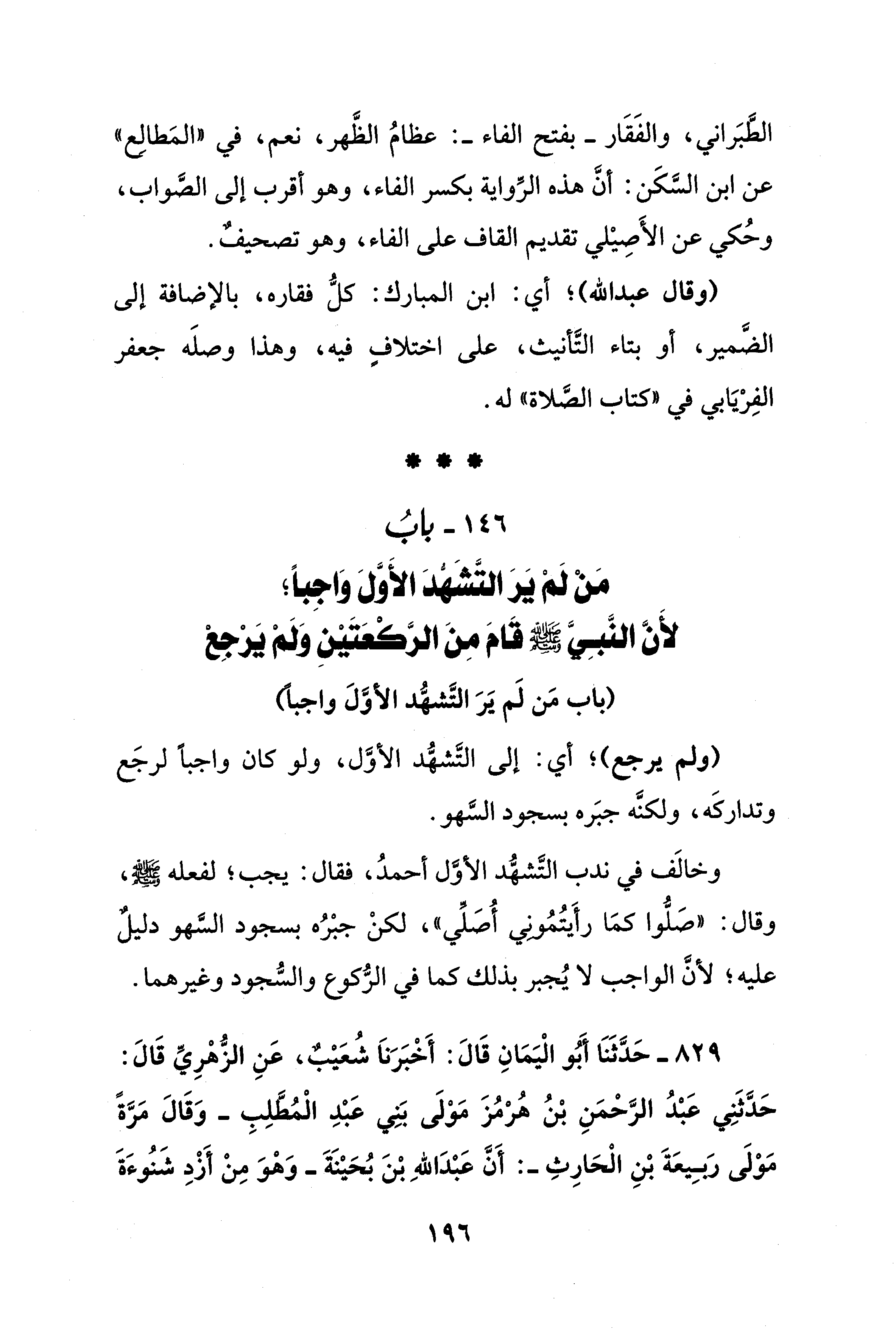 146 - بابُ مَنْ لَمْ يَرَ التَّشَهُّدَ الأَوَّلَ وَاجِبًا؛ لأَنَّ النَّبِيَّ - صلى الله عليه وسلم - قَامَ مِنَ الرَّكعَتَيْنِ وَلَمْ يَرْجِعْ