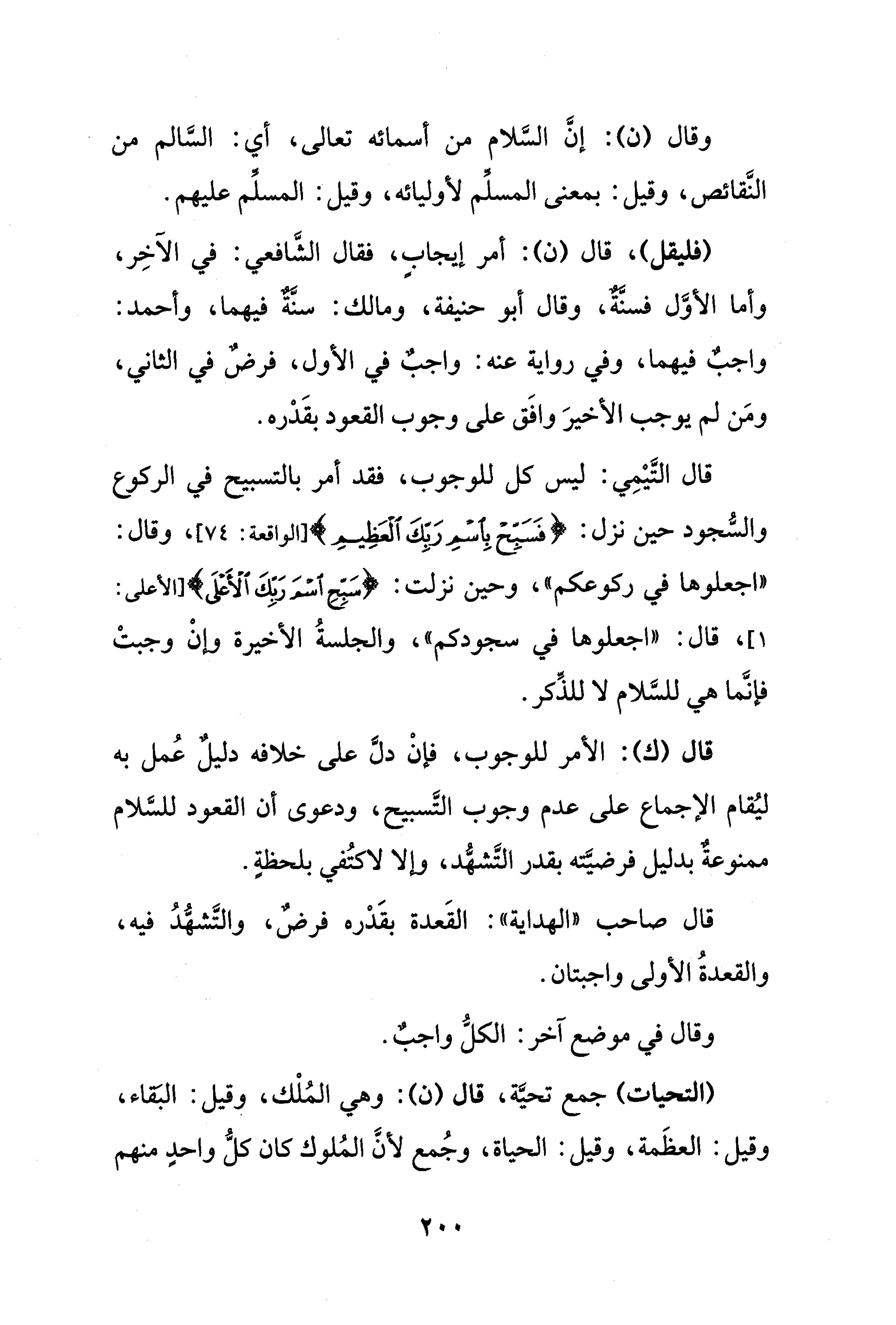 قال التَّيْمِي: ليس كل للوجوب، فقد أمر بالتسبيح في الركوع والسُّجود حين نزل: {فَسَبِّحْ بِاسْمِ رَبِّكَ الْعَظِيمِ} [الواقعة: 74]، وقال: "اجعلوها في ركوعكم"، وحين نزلت: {سَبِّحِ اسْمَ رَبِّكَ الْأَعْلَى} [الأعلى:1]، قال: "اجعلوها في سجودكم"، والجلسةُ الأخيرة وإنْ وجبتْ فإنَّما هي للسَّلام لا للذِّكر.