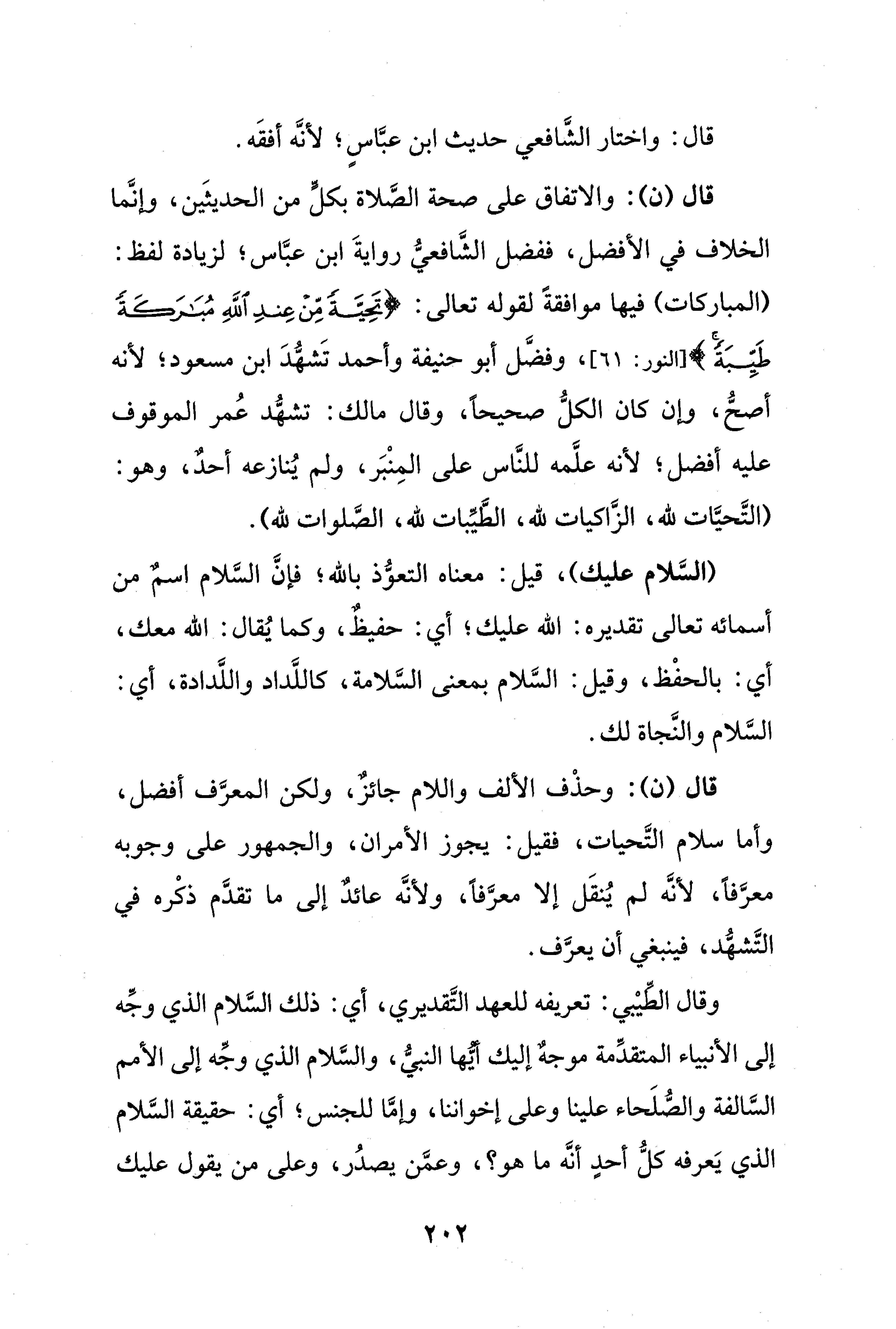 قال (ن): وحذْف الألف واللام جائزٌ، ولكن المعرَّف أفضل، وأما سلام التَّحيات، فقيل: يجوز الأمران، والجمهور على وجوبه معرَّفًا، لأنَّه لم يُنقَل إلا معرَّفًا، ولأنَّه عائدٌ إلى ما تقدَّم ذكْره في التَّشهُّد، فينبغي أن يعرَّف.