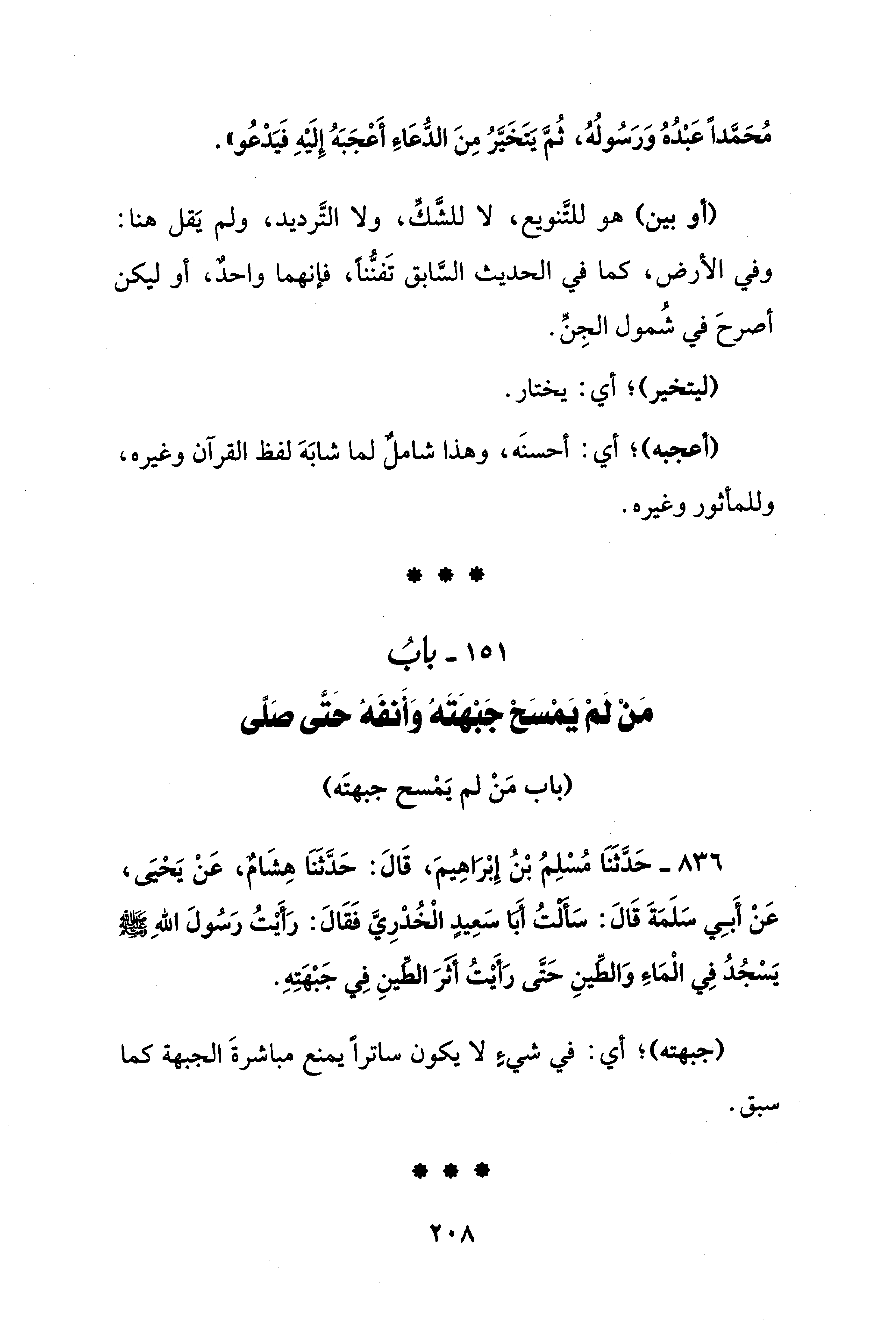 836 - حَدَّثَنَا مُسْلِمُ بْنُ إِبْرَاهِيمَ، قَالَ: حَدَّثَنَا هِشَامٌ، عَنْ يَحْيَى، عَنْ أَبِي سَلَمَةَ، قَالَ: سَأَلْتُ أَبَا سَعِيدٍ الخُدْرِيَّ فَقَالَ: رَأَيْتُ رَسُولَ اللَّهِ -صَلَّى اللهُ عَلَيْهِ وَسَلَّمَ- يَسْجُدُ فِي المَاءِ وَالطِّينِ حَتَّى رَأَيْتُ أَثَرَ الطِّينِ فِي جَبْهَتِهِ.