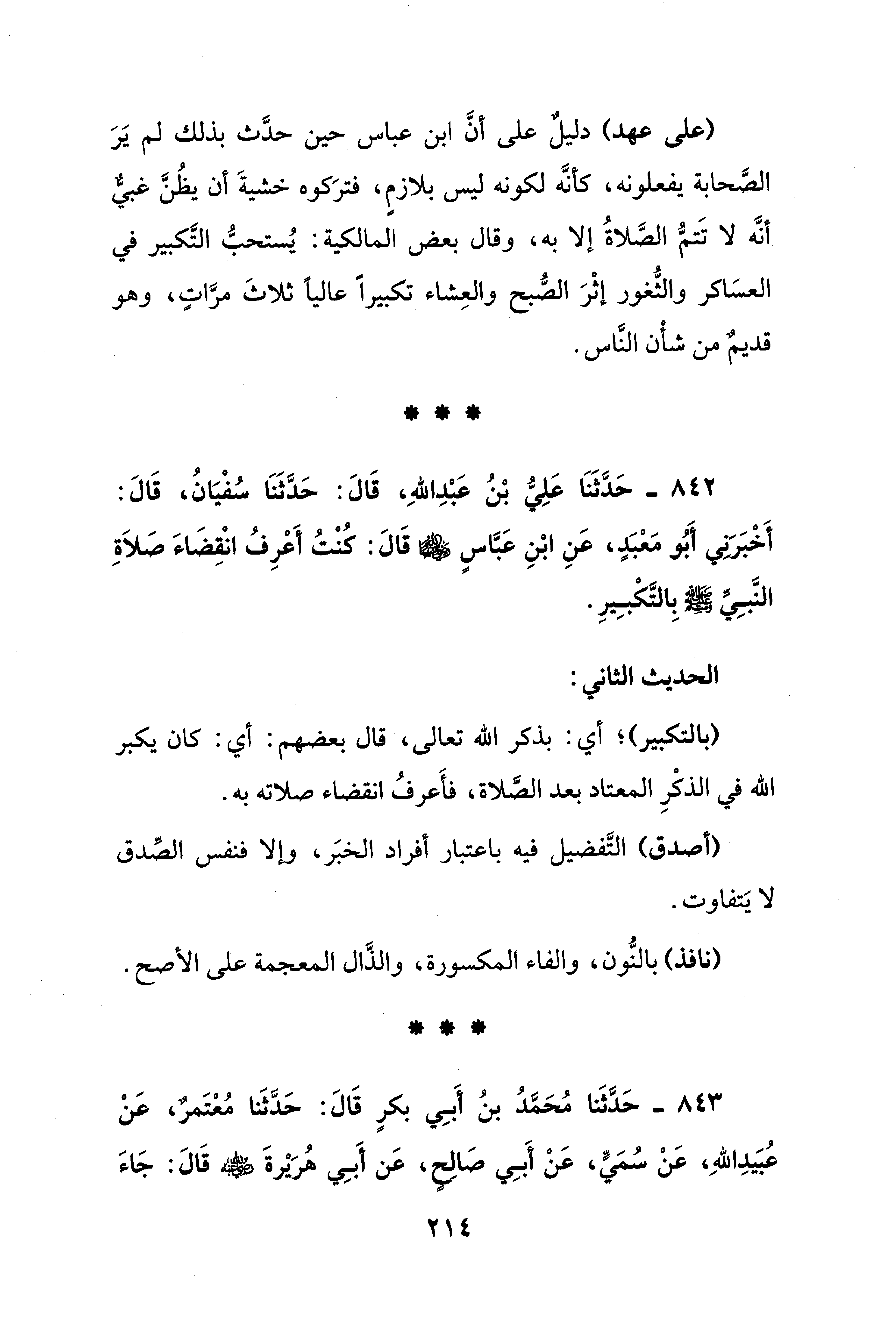 842 - حَدَّثَنَا عَلِيُّ بْنُ عَبْدِ اللَّهِ، قَالَ: حَدَّثَنَا سُفْيَانُ، قَالَ: أَخْبَرَنِي أَبُو مَعْبَدٍ، عَنِ ابْنِ عَبَّاسٍ -رَضِيَ اللَّهُ عَنْهُمَا- قَالَ: كُنْتُ أَعْرِفُ انْقِضَاءَ صَلاَةِ النَّبِيِّ -صَلَّى اللهُ عَلَيْهِ وَسَلَّمَ- بِالتَّكْبِيرِ.