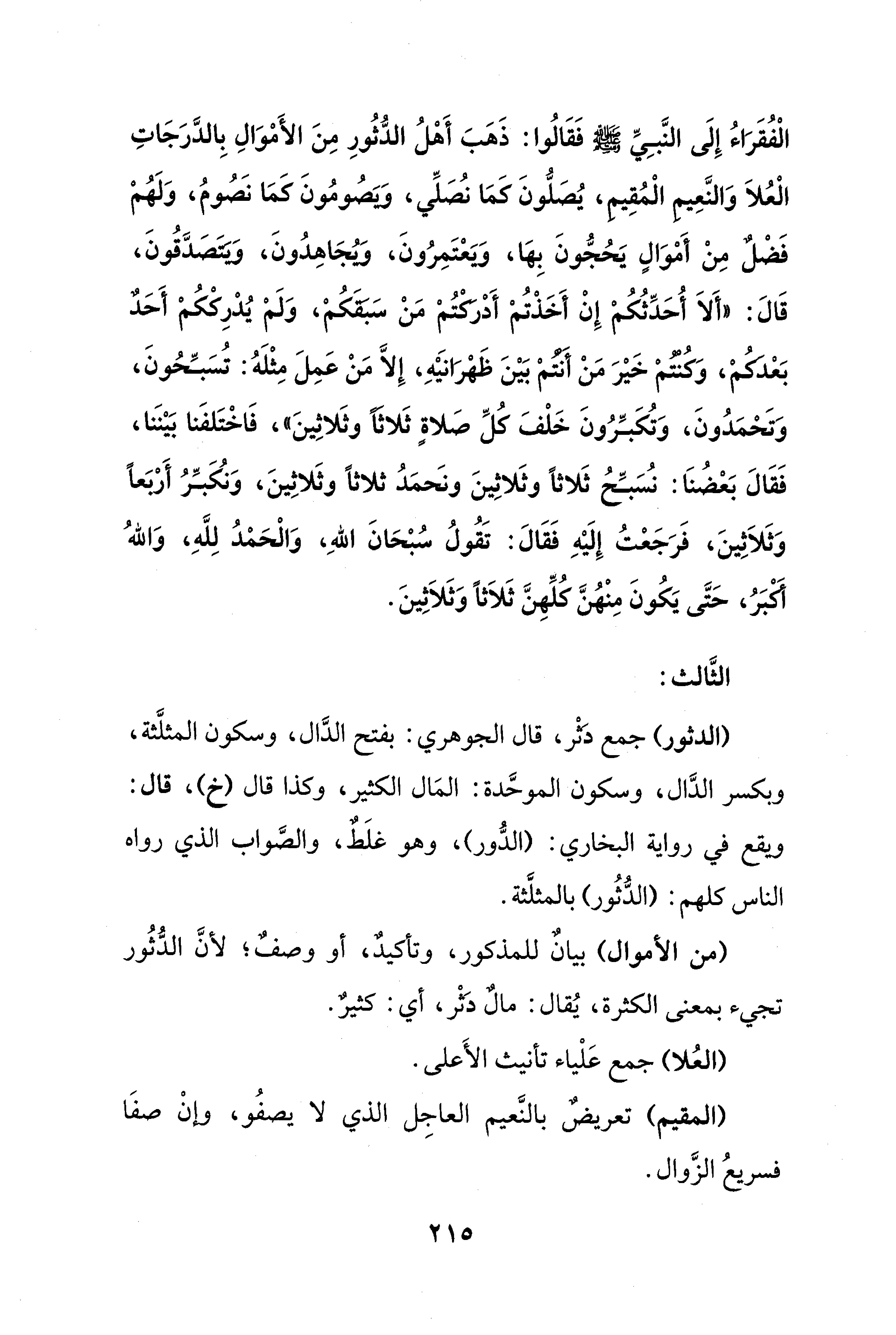 الفُقَرَاءُ إِلَى النَّبِيِّ -صَلَّى اللهُ عَلَيْهِ وَسَلَّمَ- فَقَالُوا: ذَهَبَ أَهْلُ الدُّثُورِ مِنَ الأَمْوَالِ بِالدَّرَجَاتِ العُلا وَالنَّعِيمِ المُقِيمِ، يُصَلُّونَ كَمَا نُصَلِّي، وَيَصُومُونَ كَمَا نَصُومُ، وَلَهُمْ فَضْلٌ مِنْ أَمْوَالٍ يَحُجُّونَ بِهَا، وَيَعْتَمِرُونَ، وَيُجَاهِدُونَ، وَيَتَصَدَّقُونَ، قَالَ: "أَلا أُحَدِّثُكُمْ إِنْ أَخَذْتُمْ أَدْرَكْتُمْ مَنْ سَبَقَكُمْ وَلَمْ يُدْرِكْكُمْ أَحَدٌ بَعْدَكُمْ، وَكُنْتُمْ خَيْرَ مَنْ أَنْتُمْ بَيْنَ ظَهْرَانَيْهِ إلا مَنْ عَمِلَ مِثْلَهُ: تُسَبِّحُونَ، وَتَحْمَدُونَ، وَتُكَبِّرُونَ خَلْفَ كُلِّ صَلاَةٍ ثَلاَثًا وَثَلاَثِينَ"، فَاخْتَلَفْنَا بَيْنَنَا، فَقَالَ بَعْضُنَا: نُسَبِّحُ ثَلاَثًا وَثَلاَثِينَ وَنَحْمَدُ ثَلاَثًا وَثَلاثِينَ، وَنُكَبِّرُ أَرْبَعًا وَثَلاثِينَ، فَرَجَعْتُ إِلَيْهِ فَقَالَ: تَقُولُ: سُبْحَانَ اللَّهِ، وَالحَمْدُ لِلَّهِ، وَاللَّهُ أَكْبَرُ، حَتَّى يَكُونَ مِنْهُنَّ كُلِّهِنَّ ثَلاثًا وَثَلاثِينَ.