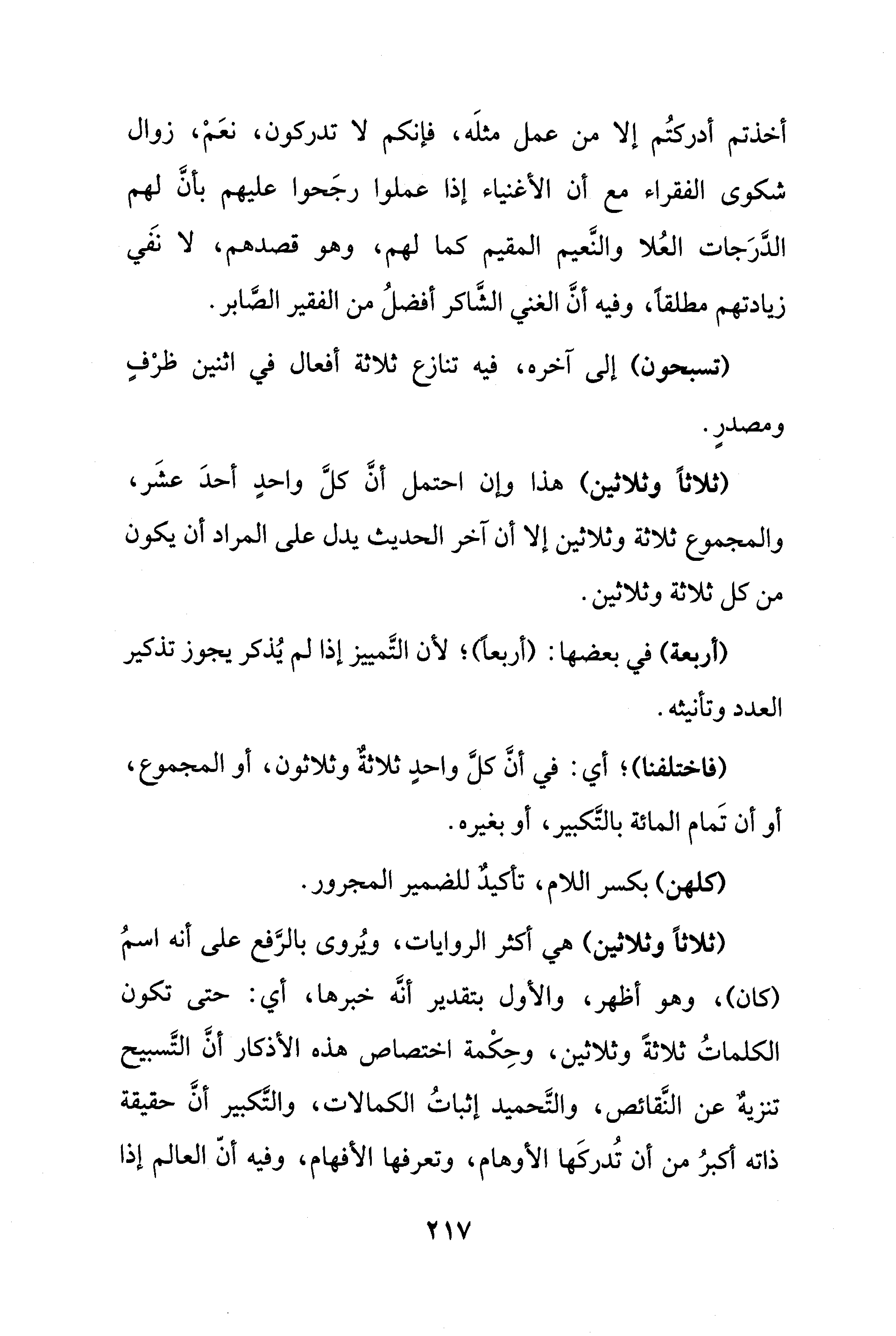 (ثلاثًا وثلاثين) هي أكثر الروايات، ويُروى بالرَّفع على أنه اسمُ (كان)، وهو أظهر، والأول بتقدير أنَّه خبرها، أي: حتى تكون الكلماتُ ثلاثةً وثلاثين، وحِكْمة اختصاص هذه الأذكار أنَّ التَّسبيح تنزيهٌ عن النَّقائص، والتَّحميد إثباتُ الكمالات، والتَّكبير أنَّ حقيقة ذاته أكبرُ من أن تُدركَها الأوهام، وتعرفها الأفهام، وفيه أنَّ العالم إذا