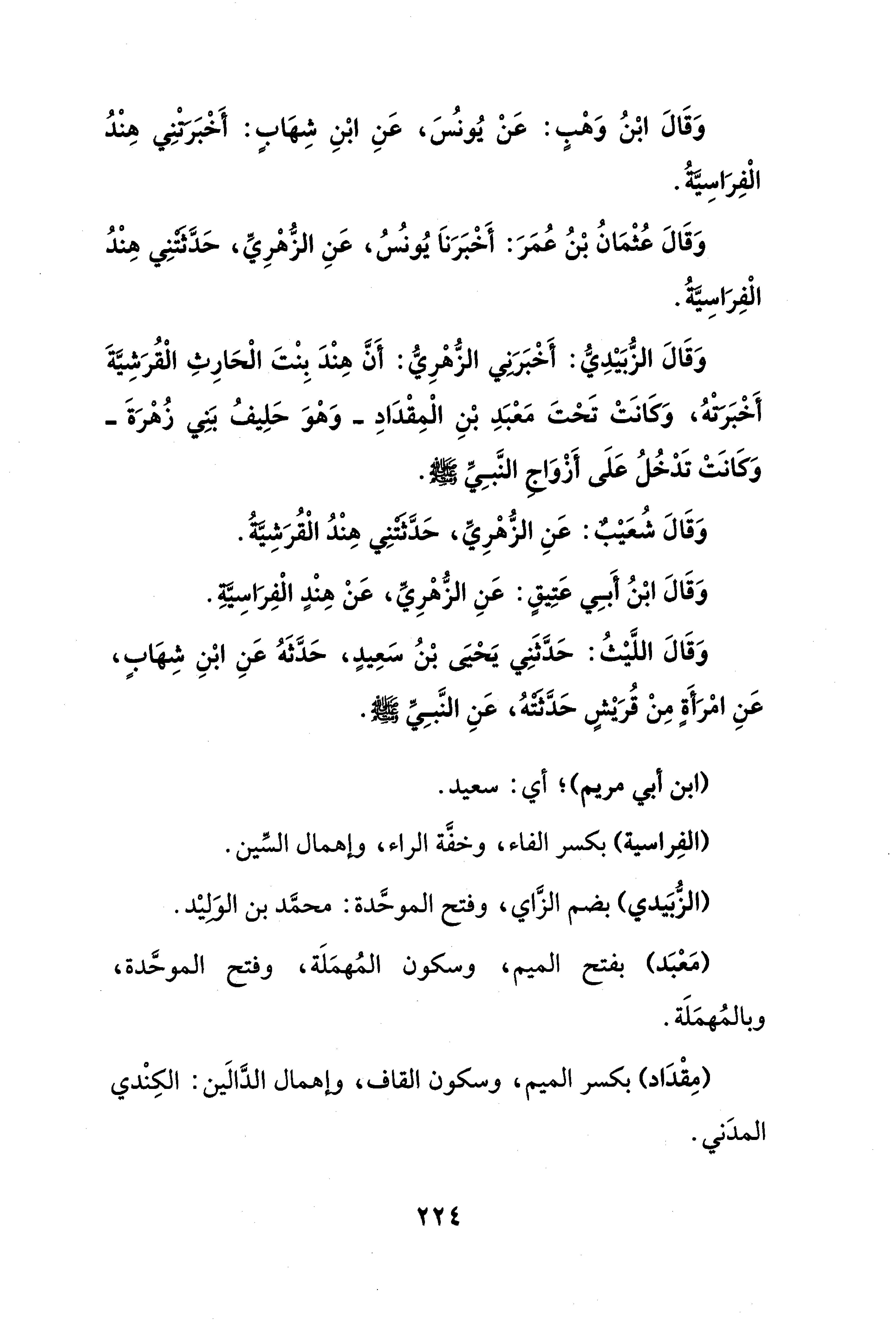 وَقَالَ عُثْمَانُ بْنُ عُمَرَ: أَخْبَرَنَا يُونُسُ، عَنِ الزُّهْرِيِّ، حَدَّثَتْنِي هِنْدُ الفِرَاسِيَّةُ.