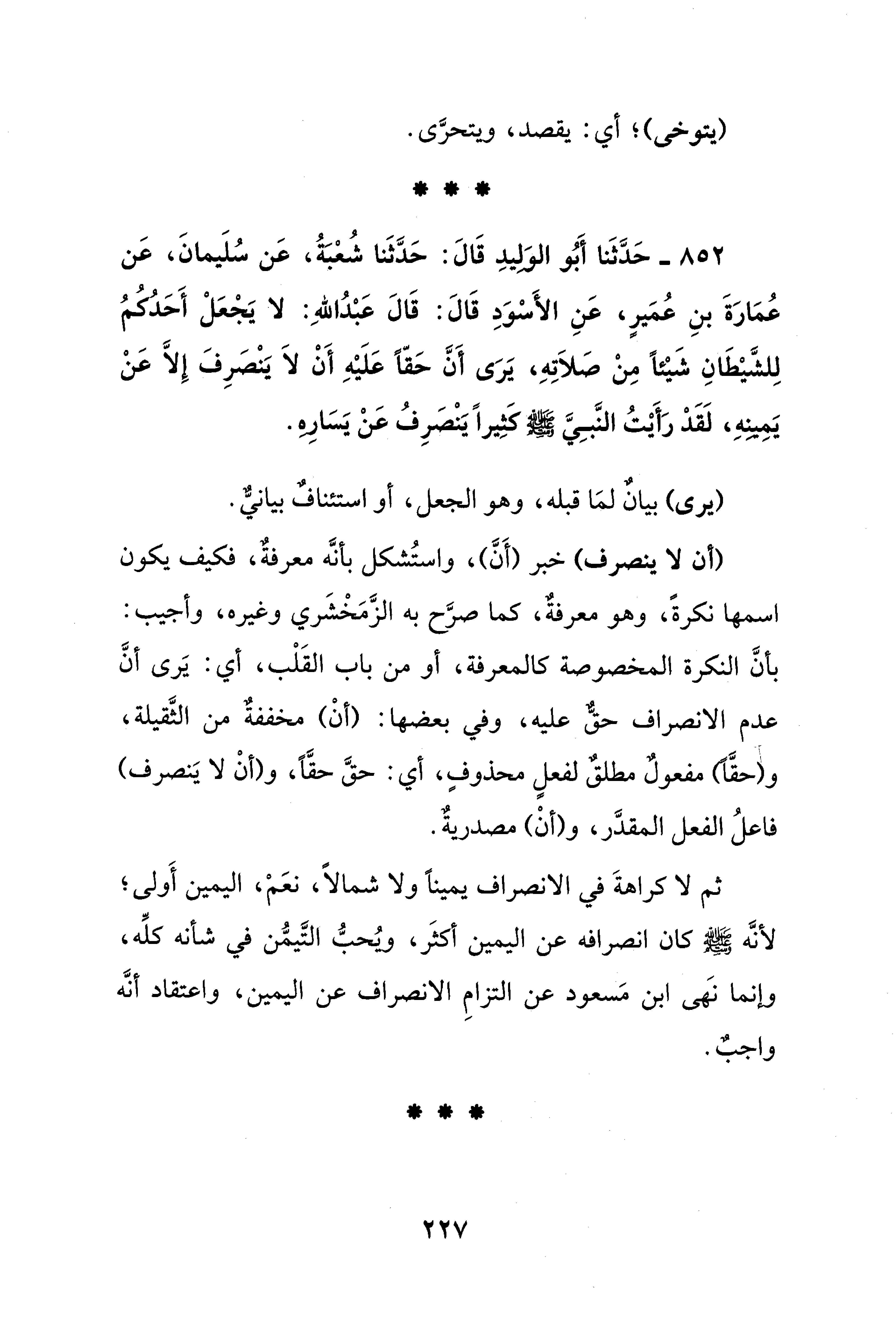 852 - حَدَّثَنَا أَبُو الوَلِيدِ قَالَ: حَدَّثَنَا شُعْبَةُ، عَنْ سُلَيْمَانَ، عَنْ عُمَارَةَ بْنِ عُمَيْرٍ، عَنِ الأَسْوَدِ قَالَ: قَالَ عَبْدُ اللَّهِ: لَا يَجْعَلْ أَحَدُكُمْ لِلشَّيْطَانِ شَيْئًا مِنْ صَلَاتِهِ، يَرَى أَنَّ حَقًّا عَلَيْهِ أَنْ لَا يَنْصَرِفَ إلا عَنْ يَمِينِهِ، لَقَدْ رَأَيْتُ النَّبِيَّ -صَلَّى اللهُ عَلَيْهِ وَسَلَّمَ- كَثِيرًا يَنْصَرِفُ عَنْ يَسَارِهِ.