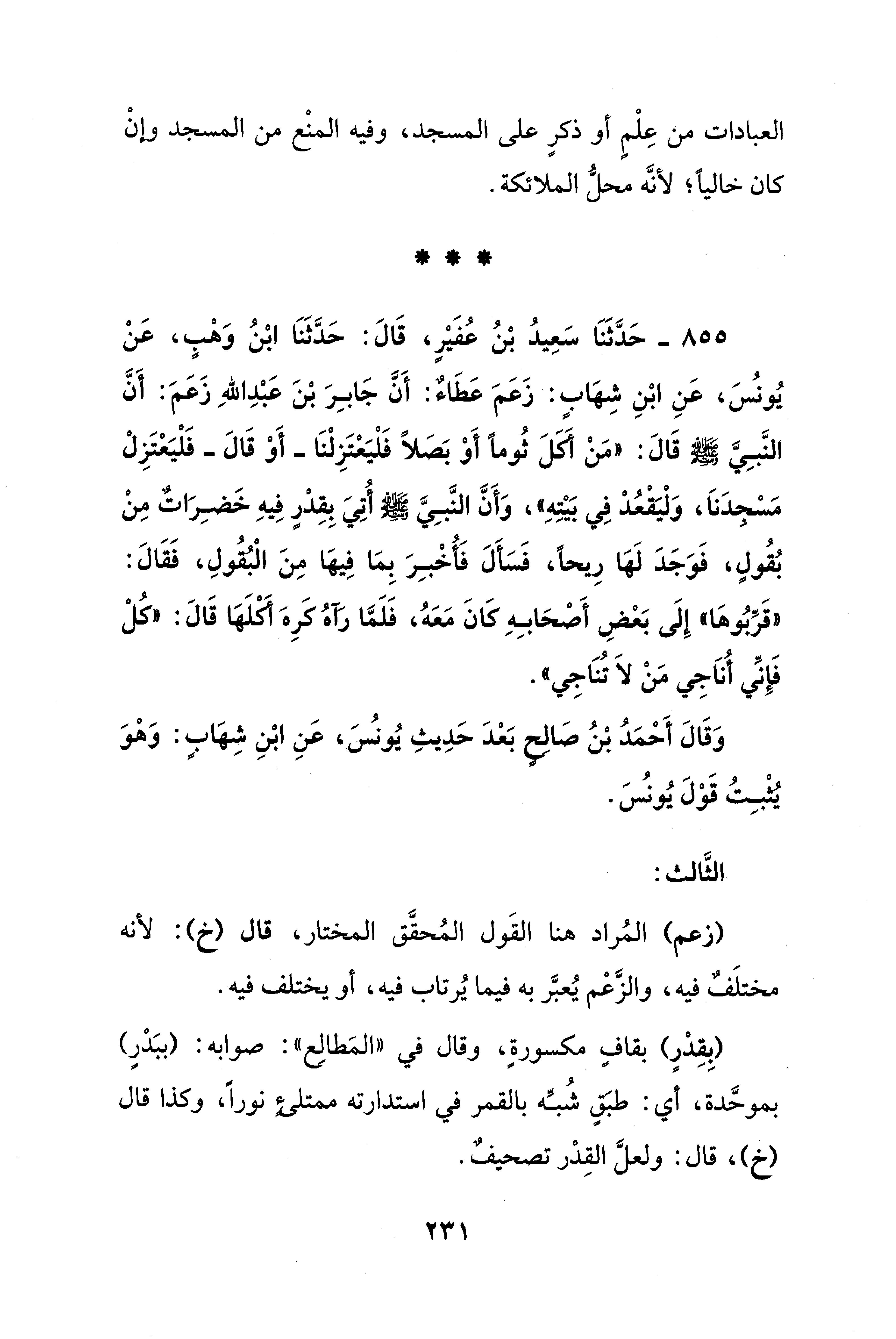 855 - حَدَّثَنَا سَعِيدُ بْنُ عُفَيْرٍ، قَالَ: حَدَّثَنَا ابْنُ وَهْبٍ، عَنْ يُونسُ، عَنِ ابْنِ شِهَابٍ: زَعَمَ عَطَاءٌ: أَنَّ جَابِرَ بْنَ عَبْدِ اللهِ زَعَمَ: أَنَّ النَّبِيَّ - صلى الله عليه وسلم - قَالَ: "مَنْ أكلَ ثُومًا أَوْ بَصَلًا فَلْيَعْتَزِلْنَا -أَوْ قَالَ- فَلْيَعْتَزِلْ مَسْجدَناَ، وَلْيَقْعُدْ فِي بَيْتِهِ"، وَأَنَّ النَّبِيَّ - صلى الله عليه وسلم - أُتِيَ بِقِدْرٍ فِيهِ خَضِرَاتٌ مِنْ بُقُولٍ، فَوَجَدَ لَهَا رِيحًا، فَسَأَلَ فَأُخْبِرَ بِمَا فِيهَا مِنَ الْبقولِ، فَقَالَ: "قَرِّبُوهَا" إِلَى بَعْضِ أَصْحَابِهِ كَانَ مَعَهُ، فَلَمَّا رَآهُ كَرِهَ أكلَهَا قَالَ: "كُلْ فَإِنِّي أنُاَجِي مَنْ لاَ تُنَاجِي".