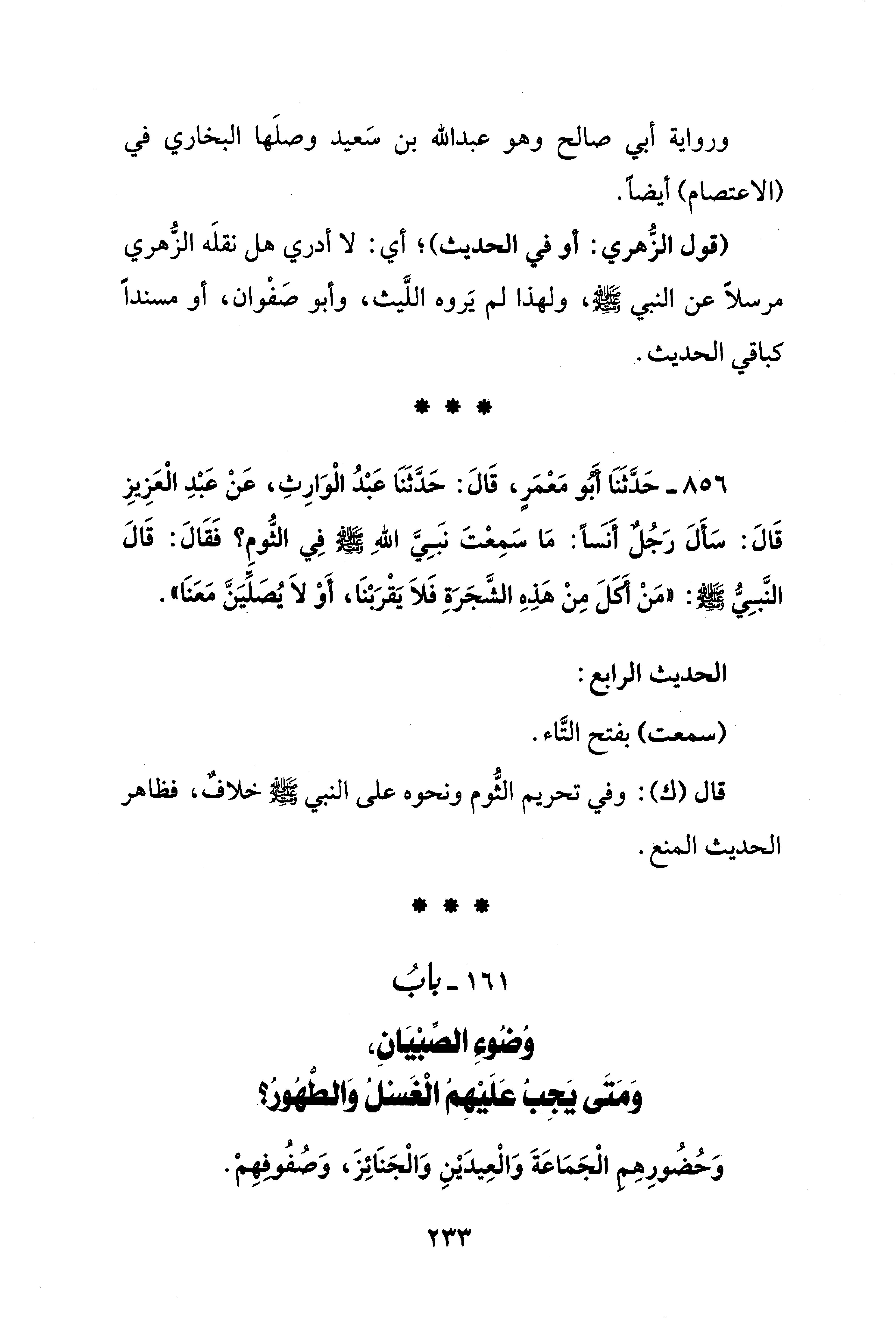 856 - حَدَّثَنَا أبو مَعْمَرٍ، قَالَ: حَدَّثَنَا عَبْدُ الْوَارِثِ، عَنْ عَبْدِ الْعَزِيزِ قَالَ: سَألَ رَجُلٌ أَنَسًا: مَا سَمِعْتَ نبَيَّ اللهِ - صلى الله عليه وسلم - فِي الثُّومِ؟ فَقَالَ: قَالَ النَّبِيُّ - صلى الله عليه وسلم -: "مَنْ أكل مِنْ هَذِهِ الشَّجَرَةِ فَلاَ يَقْرَبْنَا، أَوْ لاَ يُصَلِّيَنَّ مَعَنَا".