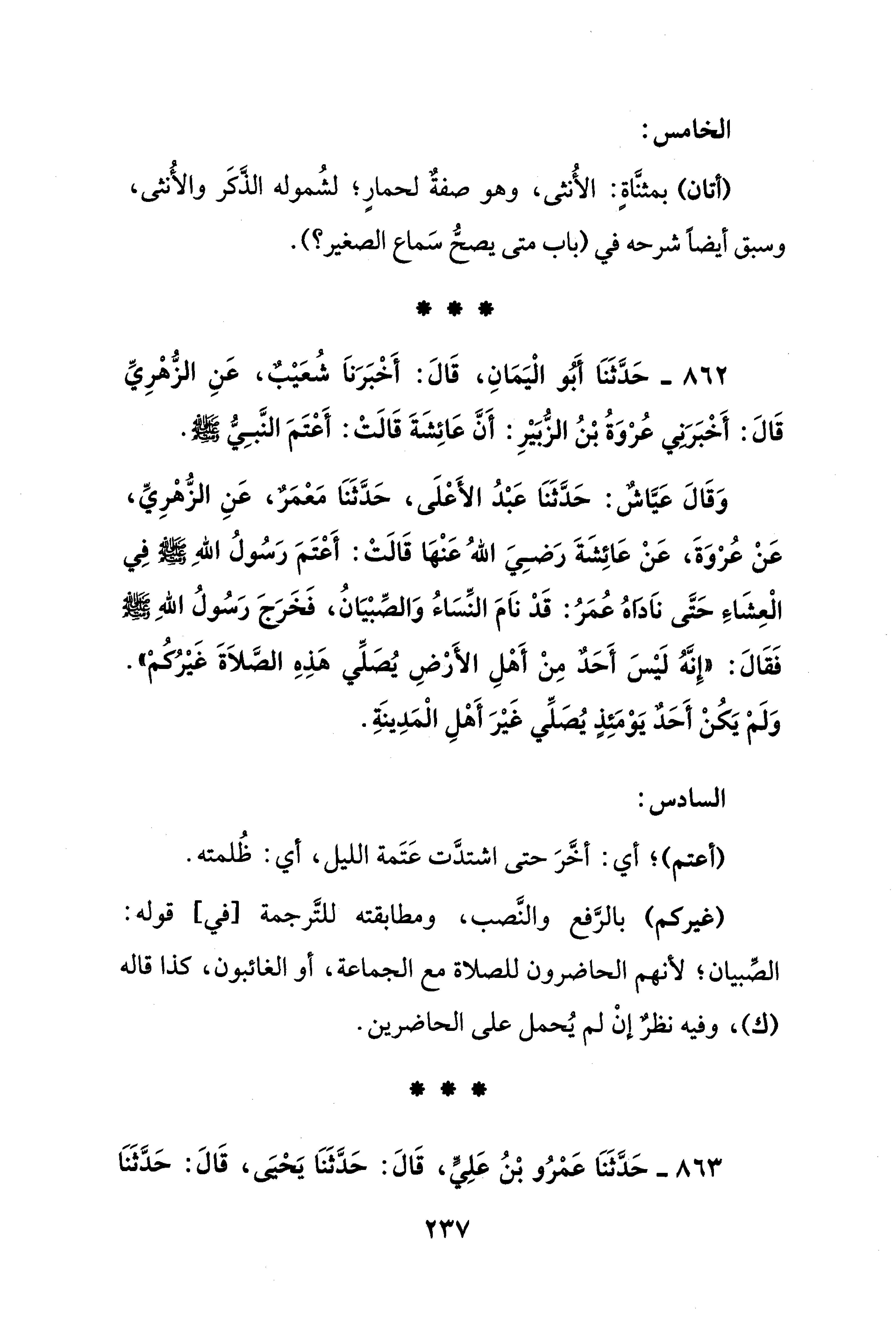 862 - حَدَّثَنَا أَبُو الْيَمَانِ، قَالَ: أَخْبَرَناَ شُعَيْبٌ، عَنِ الزُّهْرِيِّ قَالَ: أَخْبَرَني عُرْوَةُ بْنُ الزُّبَيْرِ: أَنَّ عَائِشَةَ قَالَتْ: أَعْتَمَ النَّبِيُّ - صلى الله عليه وسلم -.