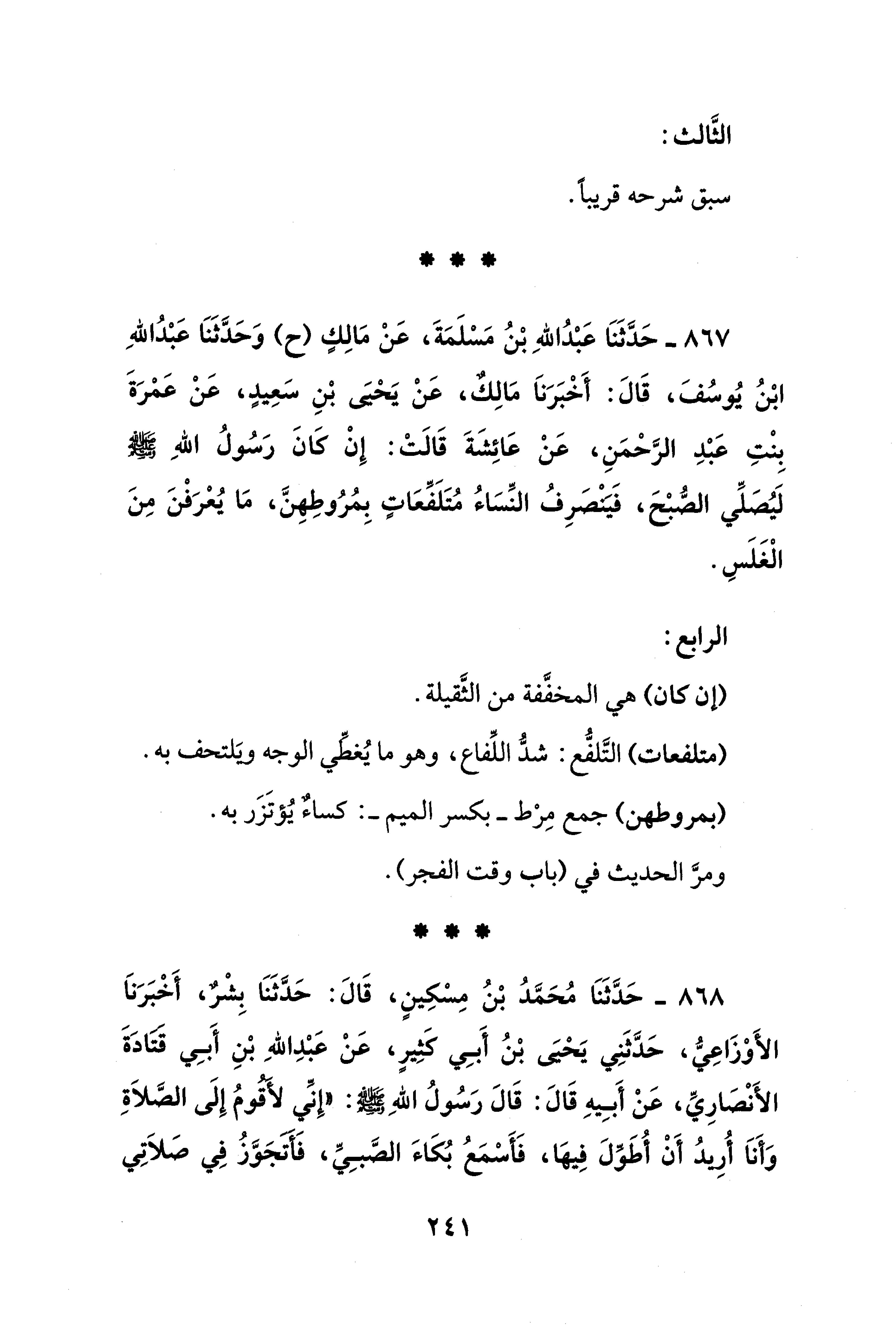 867 - حَدَّثَنَا عَبْدُ اللهِ بْنُ مَسْلَمَةَ، عَنْ مَالِكٍ (ح) وَحَدَّثَنَا عَبْدُ اللهِ ابْنُ يُوسُفَ، قَالَ: أَخْبَرَناَ مَالِكٌ، عَنْ يَحْيَى بْنِ سَعِيدٍ، عَنْ عَمْرَةَ بِنْتِ عَبْدِ الرَّحْمَنِ، عَنْ عَائِشَةَ قَالَتْ: إِنْ كَانَ رَسُولُ اللهِ - صلى الله عليه وسلم - لَيُصَلِّي الصُّبْحَ، فَينصَرِفُ النِّسَاءُ مُتَلَفِّعَاتٍ بِمُرُوطِهِنَّ، مَا يُعْرَفْنَ مِنَ الْغَلَسِ.