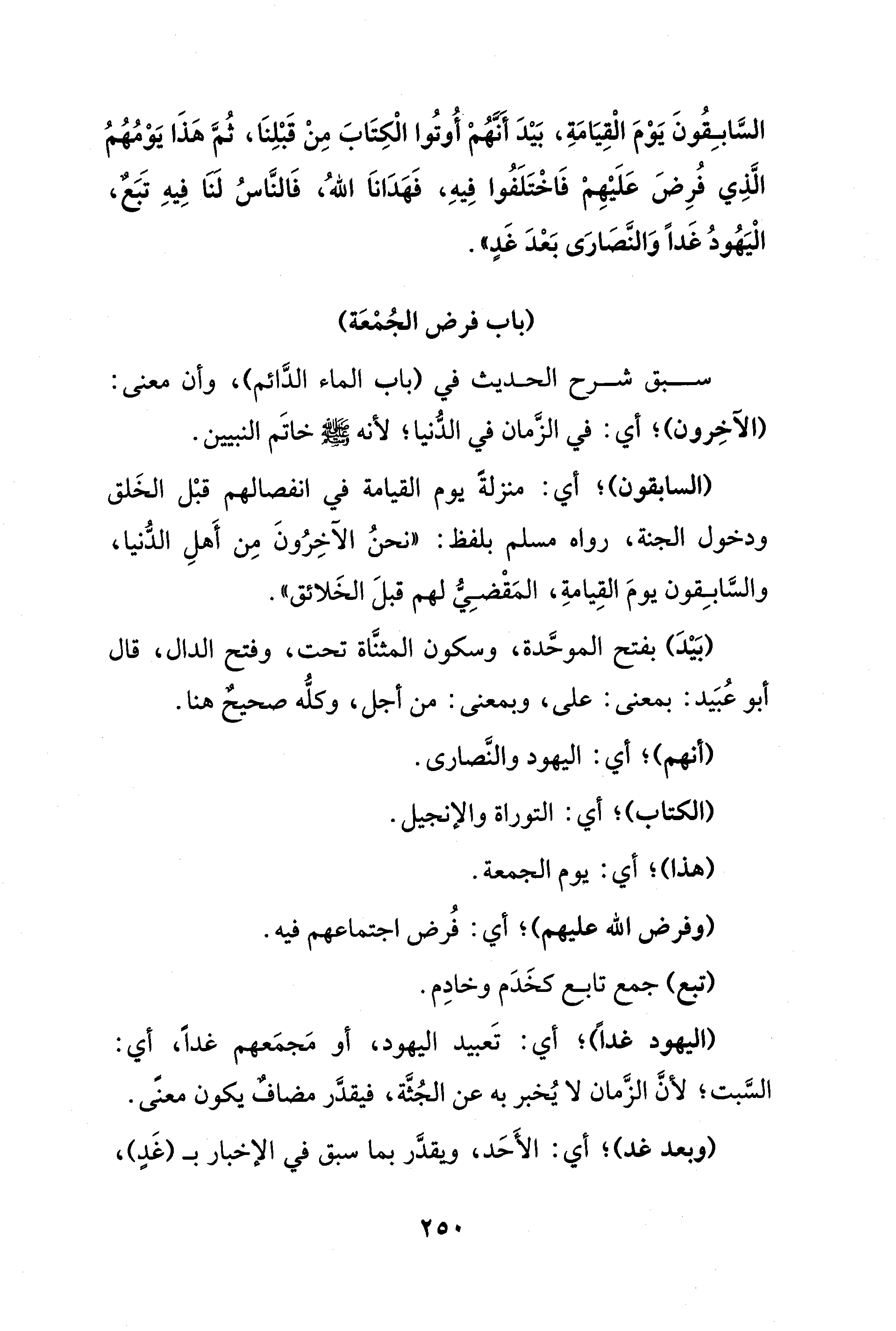 (بَيْدَ) بفتح الموحَّدة، وسكون المثنَّاة تحت، وفتح الدال، قال أبو عُبَيد: بمعنى: على، وبمعنى: من أجل، وكلُّه صحيحٌ هنا.
