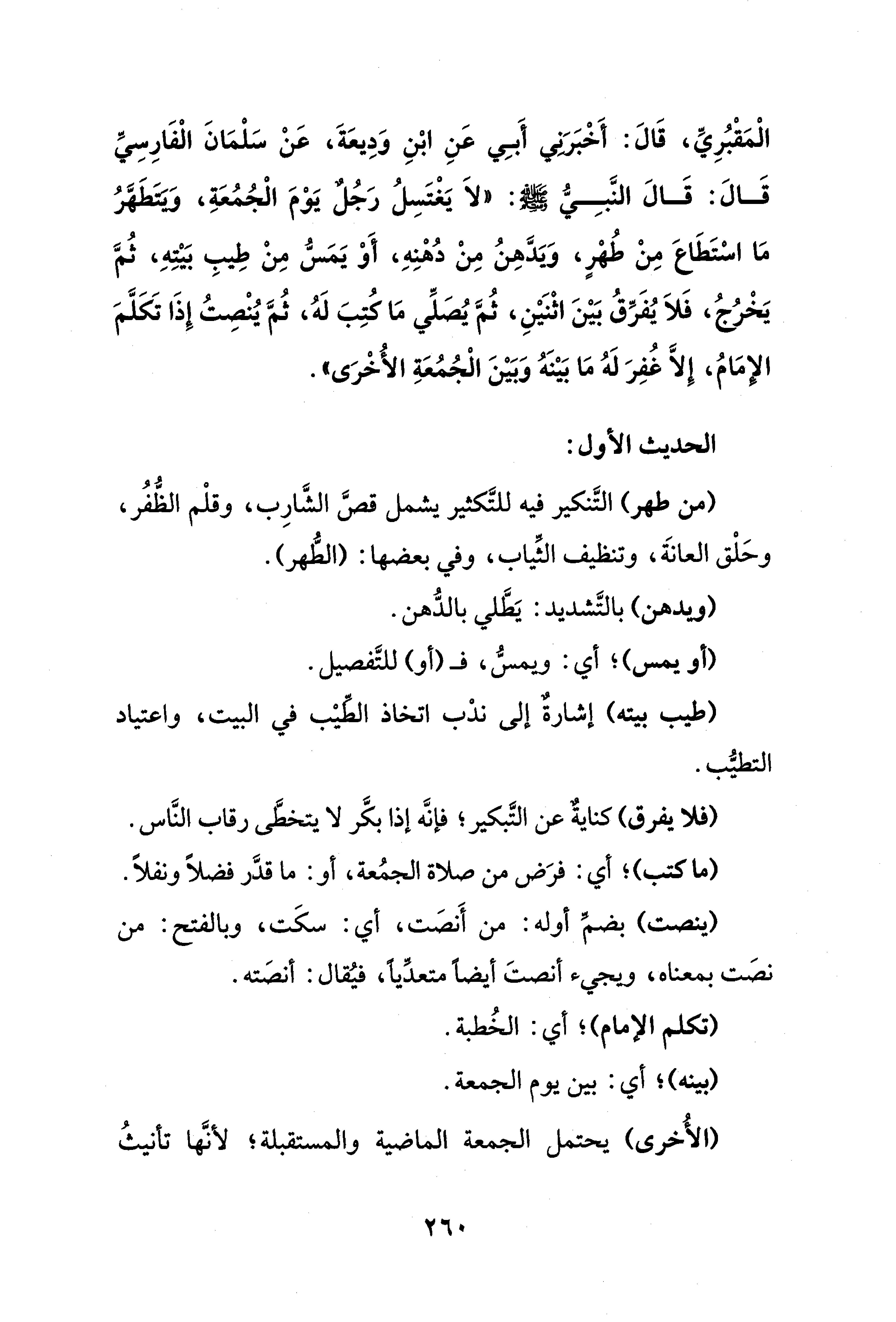 الْمَقْبُرِيِّ، قَالَ: أَخْبَرَني أَبِي عَنِ ابْنِ وَدِيعَةَ، عَنْ سَلْمَانَ الْفَارِسِيِّ قَالَ: قَالَ النَّبِي - صلى الله عليه وسلم -: "لاَ يَغْتَسِلُ رَجلٌ يَوْمَ الْجُمُعَةِ، ويَتطَهَّرُ مَا اسْتَطَاعَ مِنْ طُهْرٍ، وَيَدَّهِنُ مِنْ دُهْنِهِ، أَوْ يَمسُّ مِنْ طِيبِ بَيْتِهِ، ثُمَّ يَخْرجُ، فَلاَ يفَرِّقُ بَينَ اثْنَينِ، ثُمَ يصَلِّي مَا كُتِبَ لَهُ، ثُمَ ينْصِتُ إِذَا تَكَلَّمَ الإمَامُ، إلَّا غُفِرَ لَهُ مَا بَيْنَهُ وَبَيْنَ الْجُمُعَةِ الأخرَى".