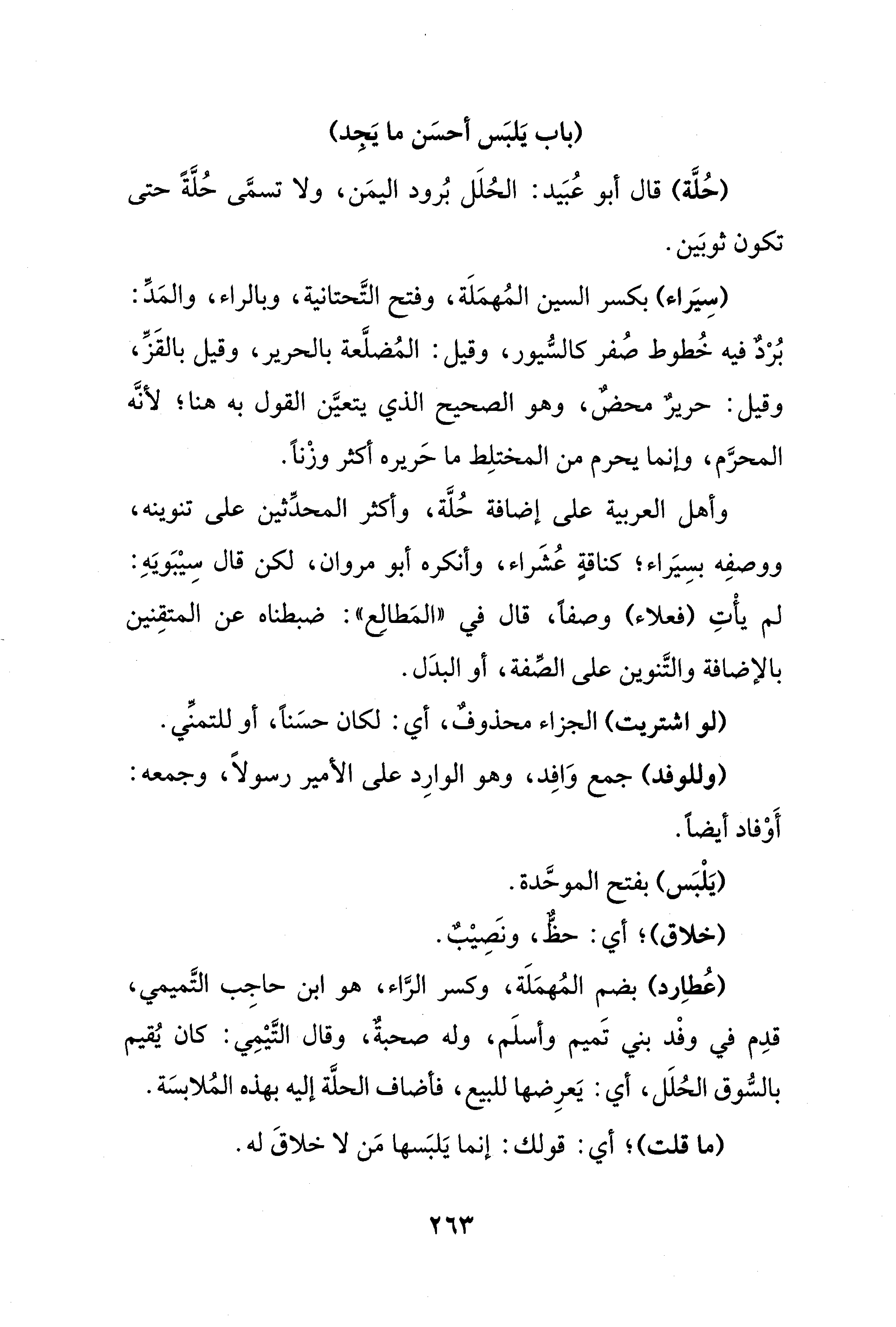 وأهل العربية على إضافة حُلَّة، وأكثر المحدثين على تنوينه، ووصفِه بسِيَراء؛ كناقةٍ عُشَراء، وأنكره أبو مروان، لكن قال سِيْبَويَهِ: لم يأْتِ (فعلاء) وصفًا، قال في "المَطالِع": ضبطناه عن المتقِنين بالإضافة والتَّنوين على الصِّفة، أو البدَل.