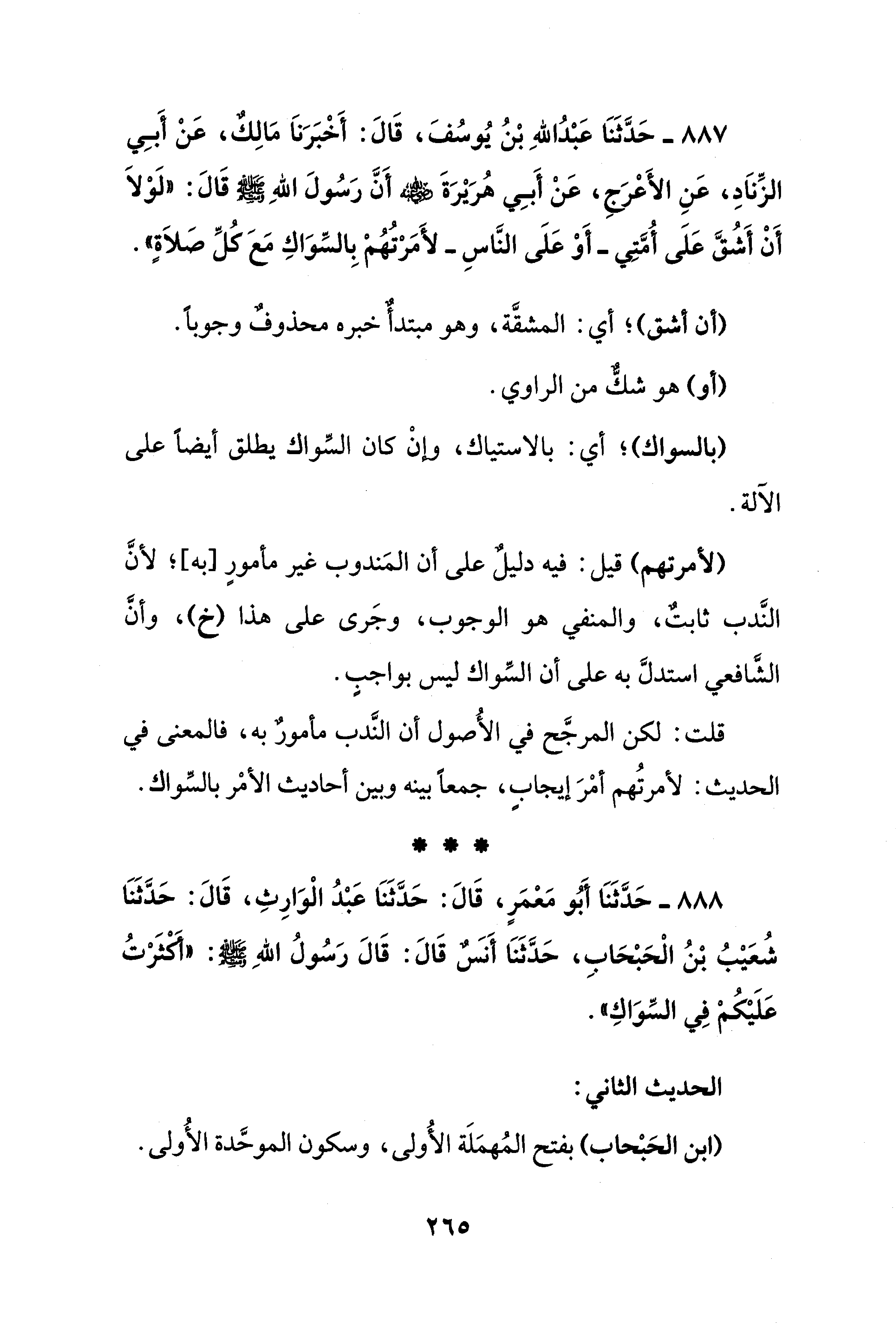 887 - حَدَّثَنَا عَبْدُ اللهِ بْنُ يُوسُفَ، قَالَ: أَخْبَرَناَ مَالِك، عَنْ أَبِي الزِّناَدِ، عَنِ الأَعْرَج، عَنْ أَبِي هُرَيْرَةَ - رضي الله عنه - أَنَّ رَسُولَ اللهِ - صلى الله عليه وسلم - قَالَ: "لَوْلاَ أَنْ أَشُقَّ عَلَى أُمَّتي -أَوْ عَلَى النَّاسِ- لأَمَرتُهُمْ بِالسّوَاكِ مَعَ كُلّ صَلاَةٍ".