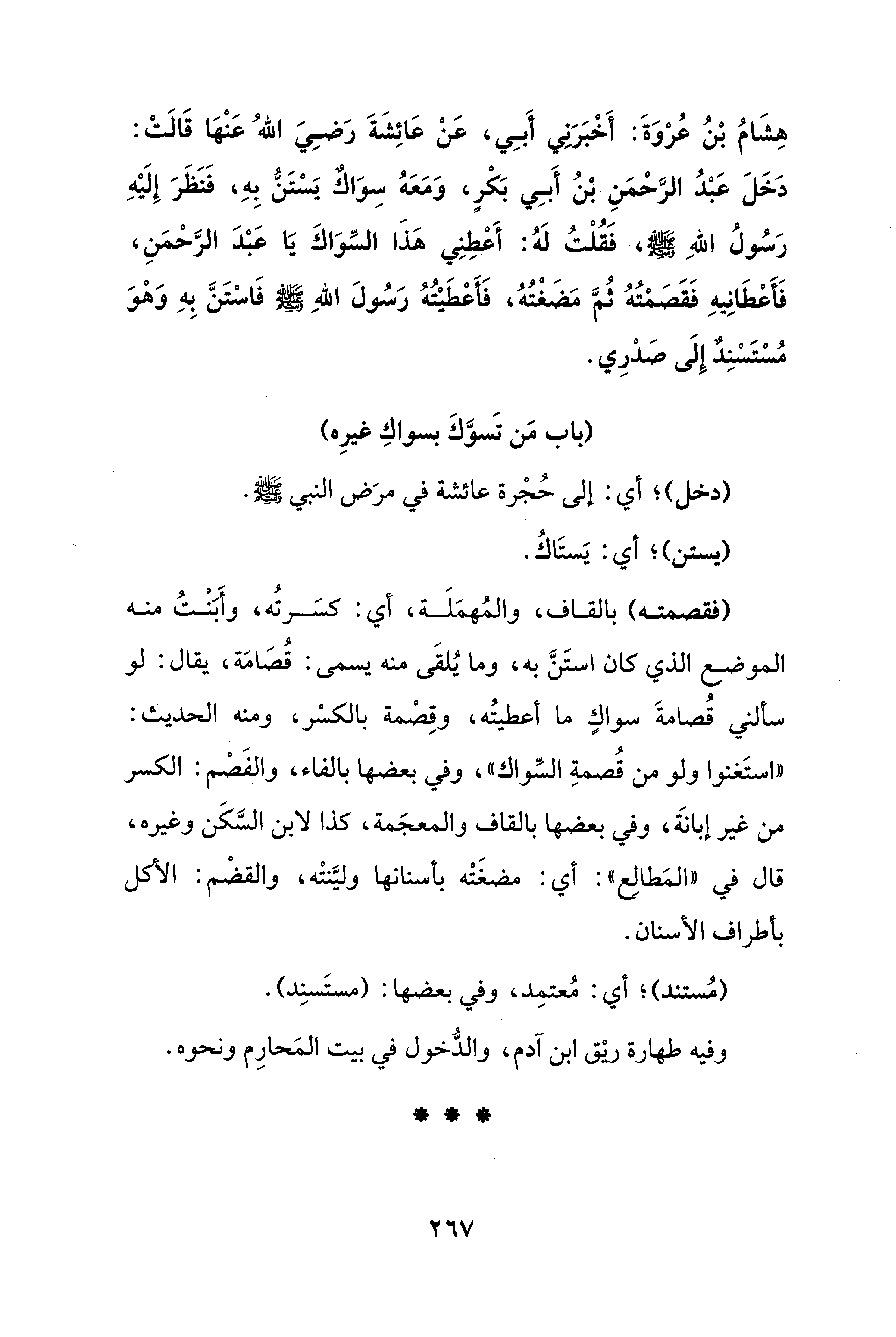 هِشَامُ بْنُ عُرْوَةَ: أَخْبَرني أَبِي، عَنْ عَائِشَةَ رَضِيَ اللهُ عَنْهَا قَالَتْ: دَخَلَ عَبْدُ الرَّحْمَنِ بْنُ أَبِي بَكْرٍ، وَمَعَهُ سِوَاكٌ يَسْتَنُّ بِهِ، فَنَظَرَ إِلَيْهِ رَسُولُ اللهِ - صلى الله عليه وسلم -، فَقُلْتُ لَهُ: أَعْطِنِي هَذَا السِّوَاكَ يَا عَبْدَ الرَّحْمَنِ، فَأعْطَانِيهِ فَقَصَمْتُهُ ثُمَّ مَضَغْتُهُ، فَأَعْطَيْتُهُ رَسُولَ اللهِ - صلى الله عليه وسلم - فَاسْتَنَّ بِهِ وَهْوَ مُسْتَسْنِدٌ إِلَى صَدْرِي.