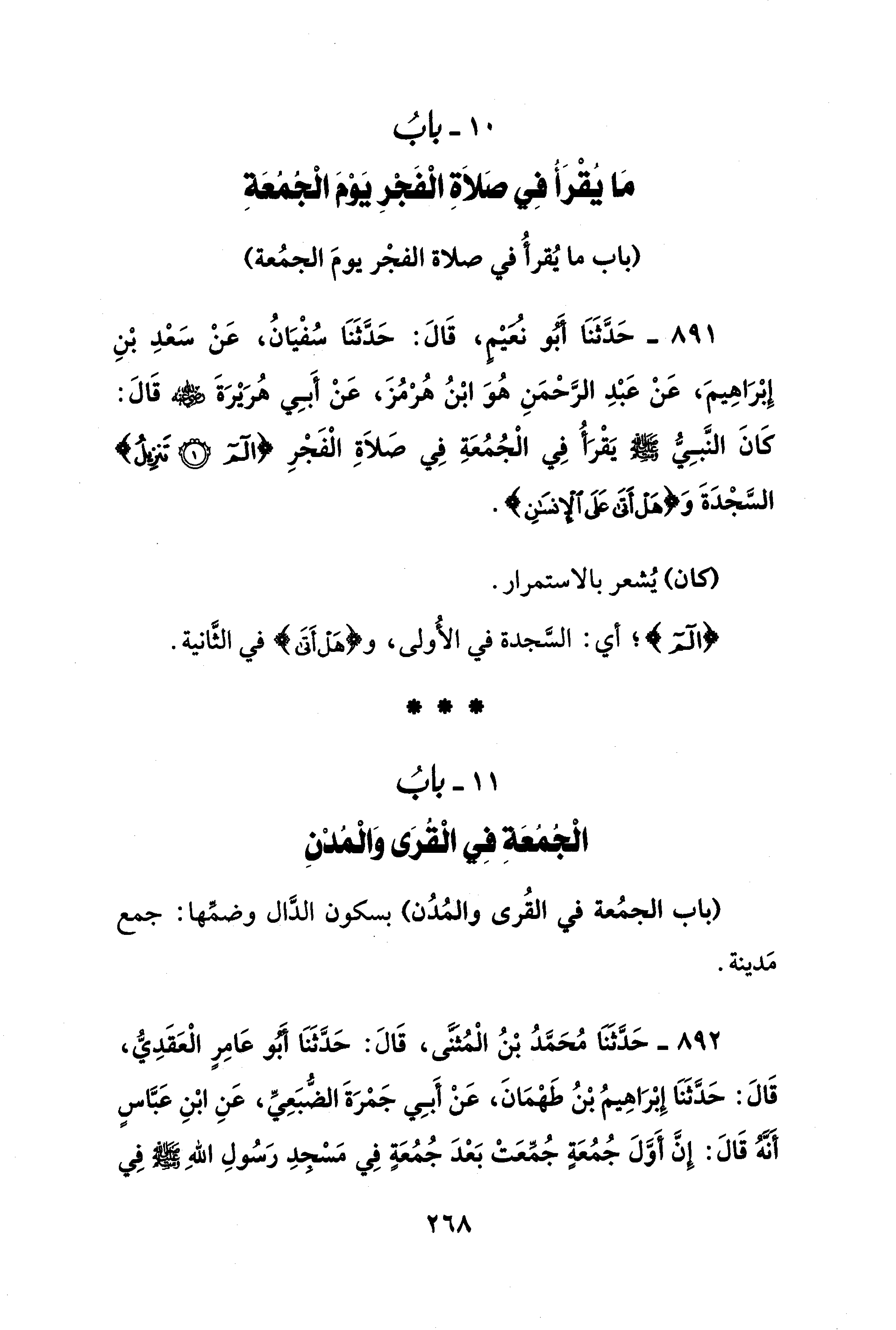 891 - حَدَّثَنَا أبو نُعَيْمٍ، قَالَ: حَدَّثَنَا سُفْيَانُ، عَنْ سَعْدِ بْنِ إِبْرَاهِيمَ، عَنْ عَبْدِ الرَّحْمَنِ هُوَ ابْنُ هُرْمُزَ، عَنْ أَبِي هُرَيْرَةَ - رضي الله عنه - قَالَ: كَانَ النَّبِيُّ - صلى الله عليه وسلم - يَقْرَأُ فِي الْجُمُعَةِ فِي صَلاَةِ الْفَجْرِ {الم (1) تَنْزِيلُ} السَّجْدَةَ وَ {هَلْ أَتَى عَلَى الْإِنْسَانِ}.