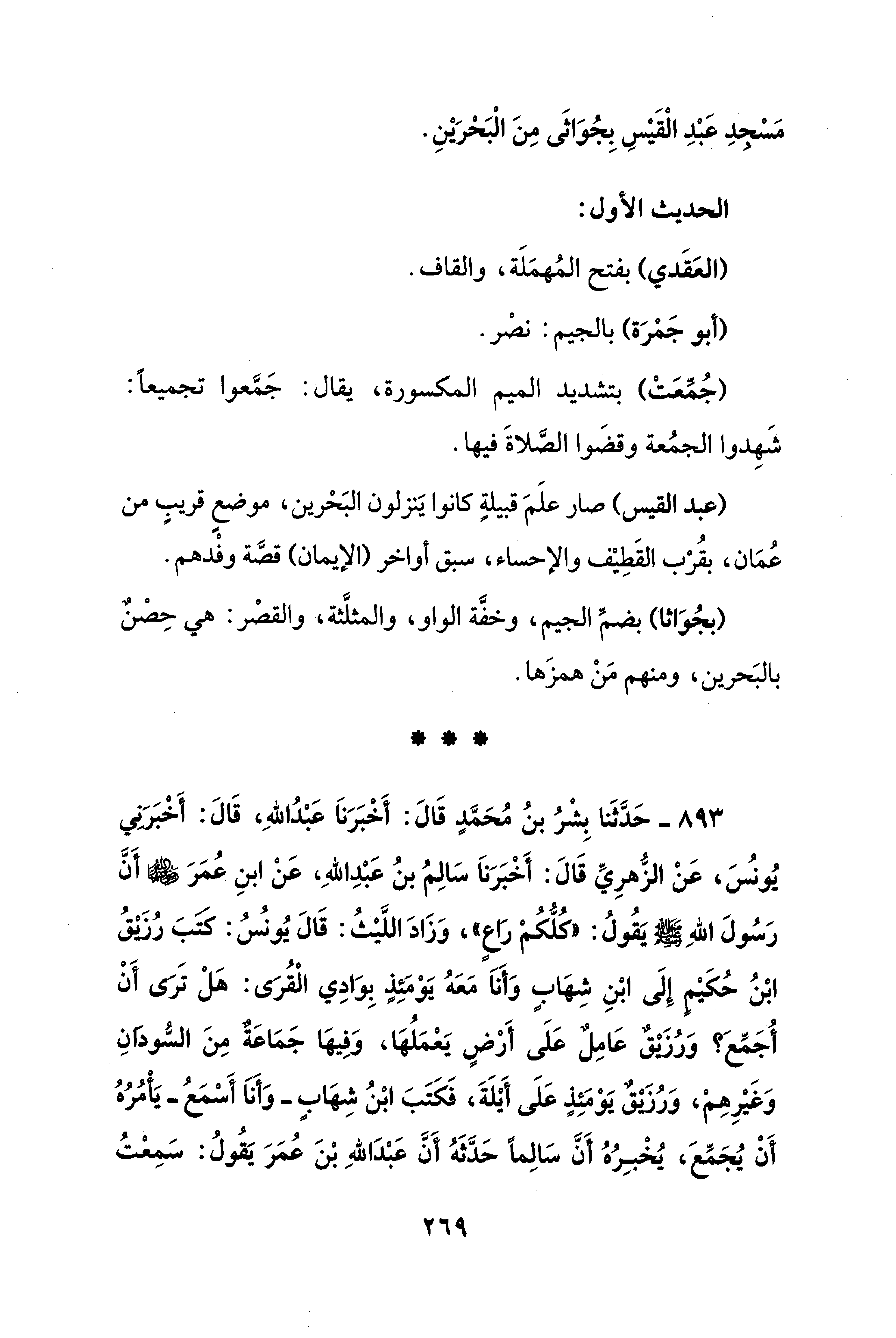 893 - حَدَّثَنا بِشْرُ بنُ مُحَمَّدٍ قَالَ: أَخْبَرَناَ عَبْدُ اللهِ، قَالَ: أَخْبَرَني يُونسُ، عَنْ الزُّهرِيِّ قَالَ: أَخْبَرَناَ سَالِمُ بنُ عَبْدِ اللهِ، عَنْ ابنِ عُمَرَ أَنَّ رَسُولَ اللهِ - صلى الله عليه وسلم - يَقولُ: "كُلُّكُمْ رَاعٍ"، وَزَادَ اللَّيْثُ: قَالَ يُونسٌ: كتَبَ رُزيقُ ابْنُ حُكَيْم إِلَى ابْنِ شِهَابٍ وَأَناَ مَعَهُ يَوْمَئِذٍ بِوَادِي الْقُرَى: هَلْ تَرَى أَنْ أُجَمِّعَ؟ وَرُزيقٌ عَامِلٌ عَلَى أَرْضٍ يَعْمَلُهَا، وَفيهَا جَمَاعَةٌ مِنَ السُّودانِ وَغَيْرِهِمْ، وَرُزيقٌ يَوْمَئِذٍ عَلَى أَيْلَةَ، فَكَتَبَ ابْنُ شِهَابٍ -وَأَناَ أَسْمَعُ- يَأمُرُهُ أَنْ يُجَمِّعَ، يُخْبِرُهُ أَنَّ سَالِمًا حَدَّثَهُ أَنَّ عَبْدَ اللهِ بْنَ عُمَرَ يَقُولُ: سَمِعْتُ