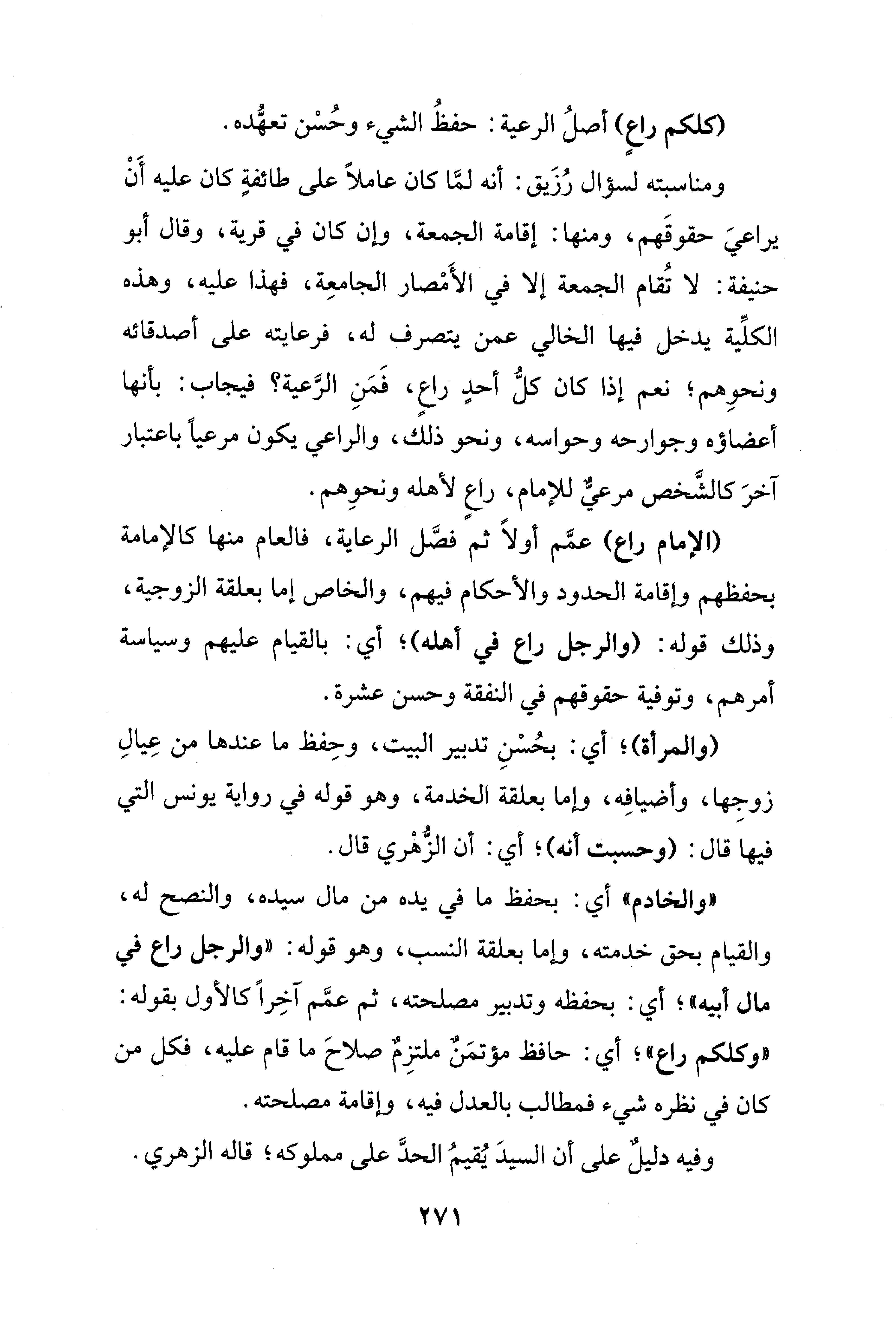 كلكم راعٍ) أصلُ الرعية: حفظُ الشيء وحُسْن تعهُّده.
