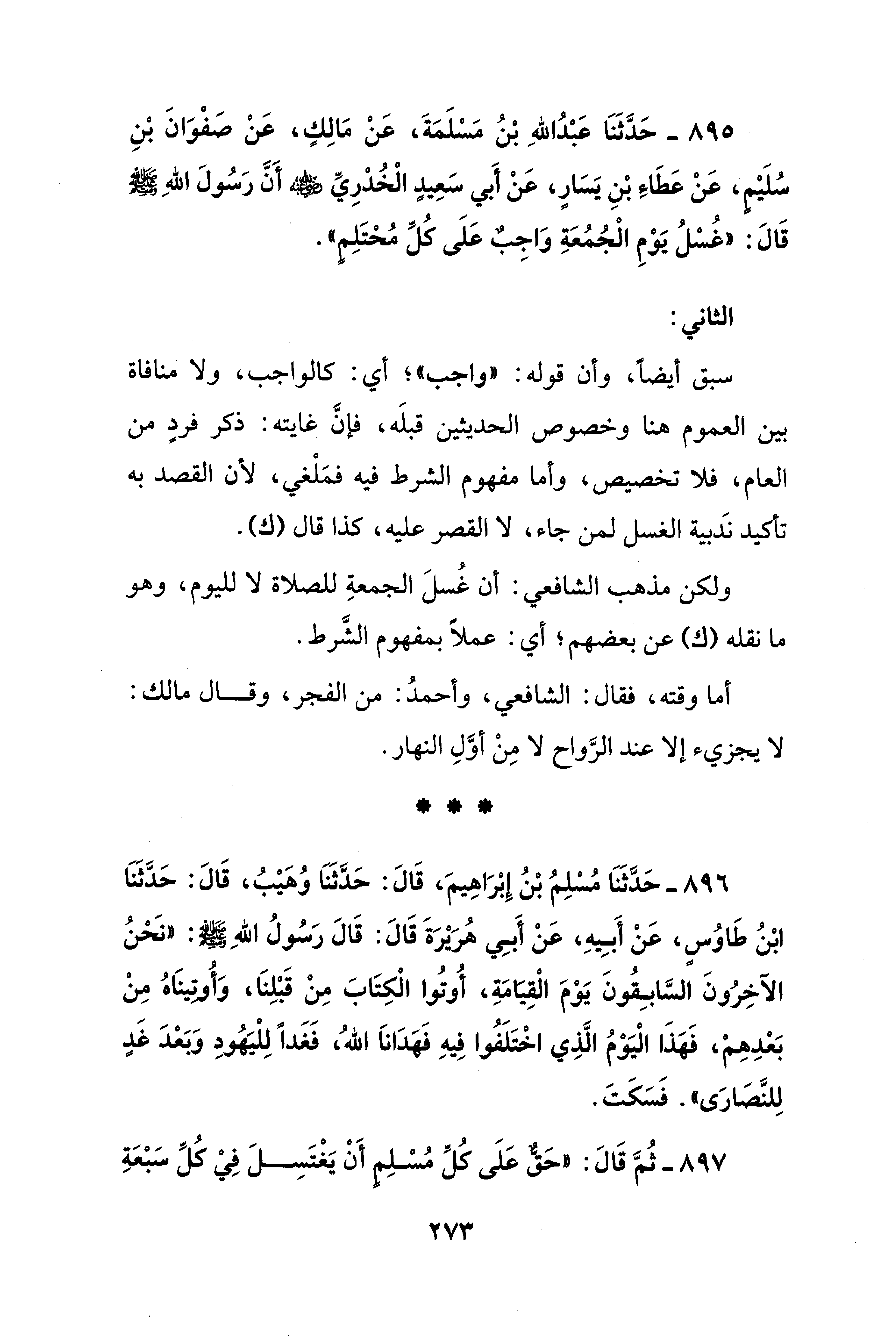 895 - حَدَّثَنَا عَبْدُ اللهِ بْنُ مَسْلَمَةَ، عَنْ مَالِكٍ، عَنْ صَفْوَانَ بْنِ سُلَيْم، عَنْ عَطَاءِ بْنِ يَسَارٍ، عَنْ أَبي سَعِيدٍ الْخُدْرِيِّ - رضي الله عنه - أَنَّ رَسُولَ اللهِ - صلى الله عليه وسلم - قَالَ: "غُسْلُ يَوْمِ الْجُمُعَةِ وَاجِبٌ عَلَى كُلِّ مُحْتَلِمٍ".