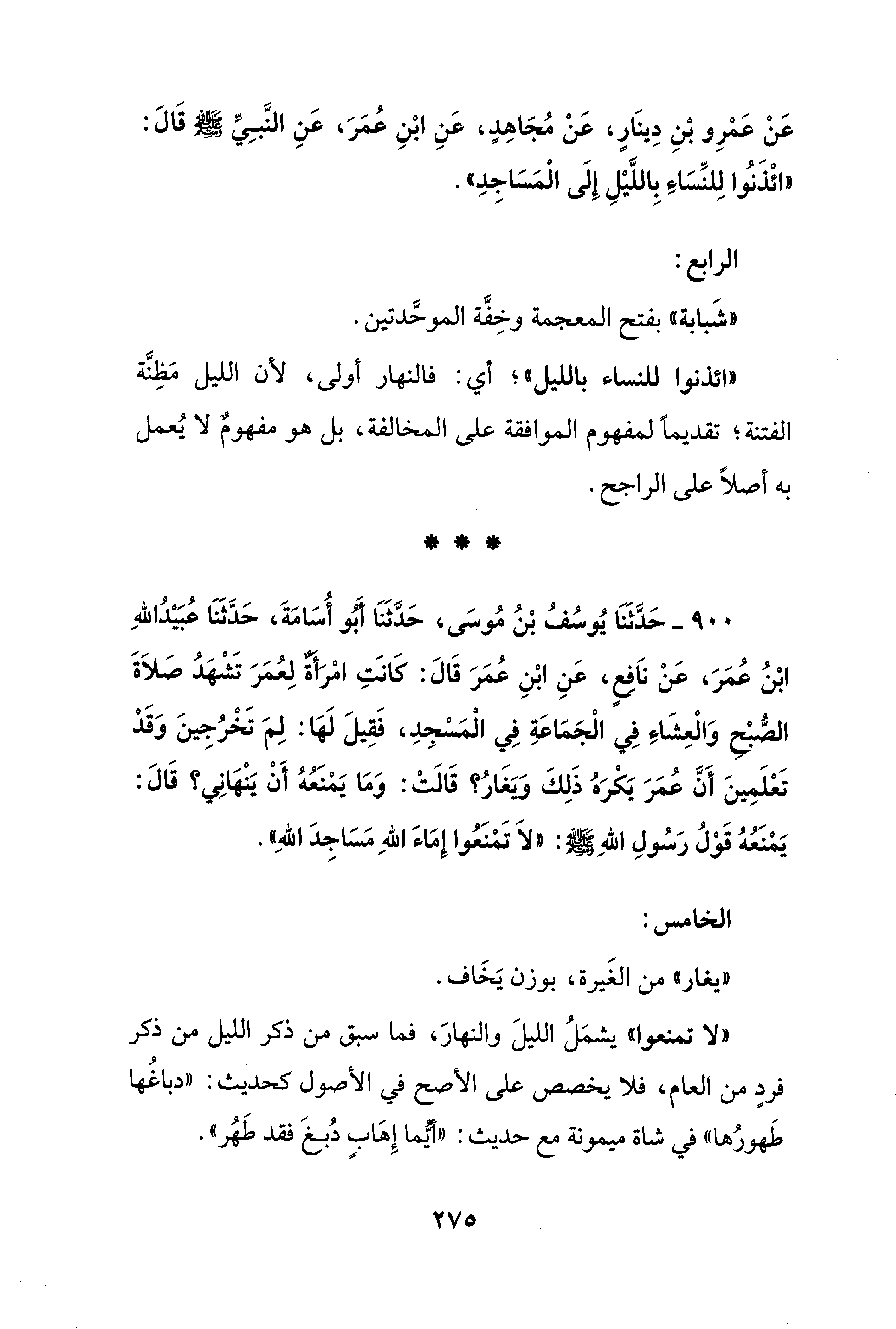 900 - حَدَّثَنَا يُوسُفُ بْنُ مُوسَى، حَدَّثَنَا أبو أُسَامَةَ، حَدَّثَنَا عُبَيْدُ اللهِ ابْنُ عُمَرَ، عَنْ ناَفِعٍ، عَنِ ابْنِ عُمَرَ قَالَ: كَانَتِ امْرَأةٌ لِعُمَرَ تَشْهَدُ صَلاَةَ الصُّبْح وَالْعِشَاءَ فِي الْجَمَاعَةِ فِي الْمَسْجدِ، فَقِيلَ لَهَا: لِمَ تَخْرُجِينَ وَقَدْ تَعْلَمِينَ أَنَّ عُمَرَ يَكْرَهُ ذَلِكَ وَيَغَارُ؟ قَالَتْ: وَمَا يَمْنَعُهُ أَنْ يَنْهَانِي؟ قَالَ: يَمْنَعُهُ قَوْلُ رَسُولِ اللهِ - صلى الله عليه وسلم -: "لاَ تَمْنَعُوا إِمَاءَ اللهِ مَسَاجِدَ اللهِ".
