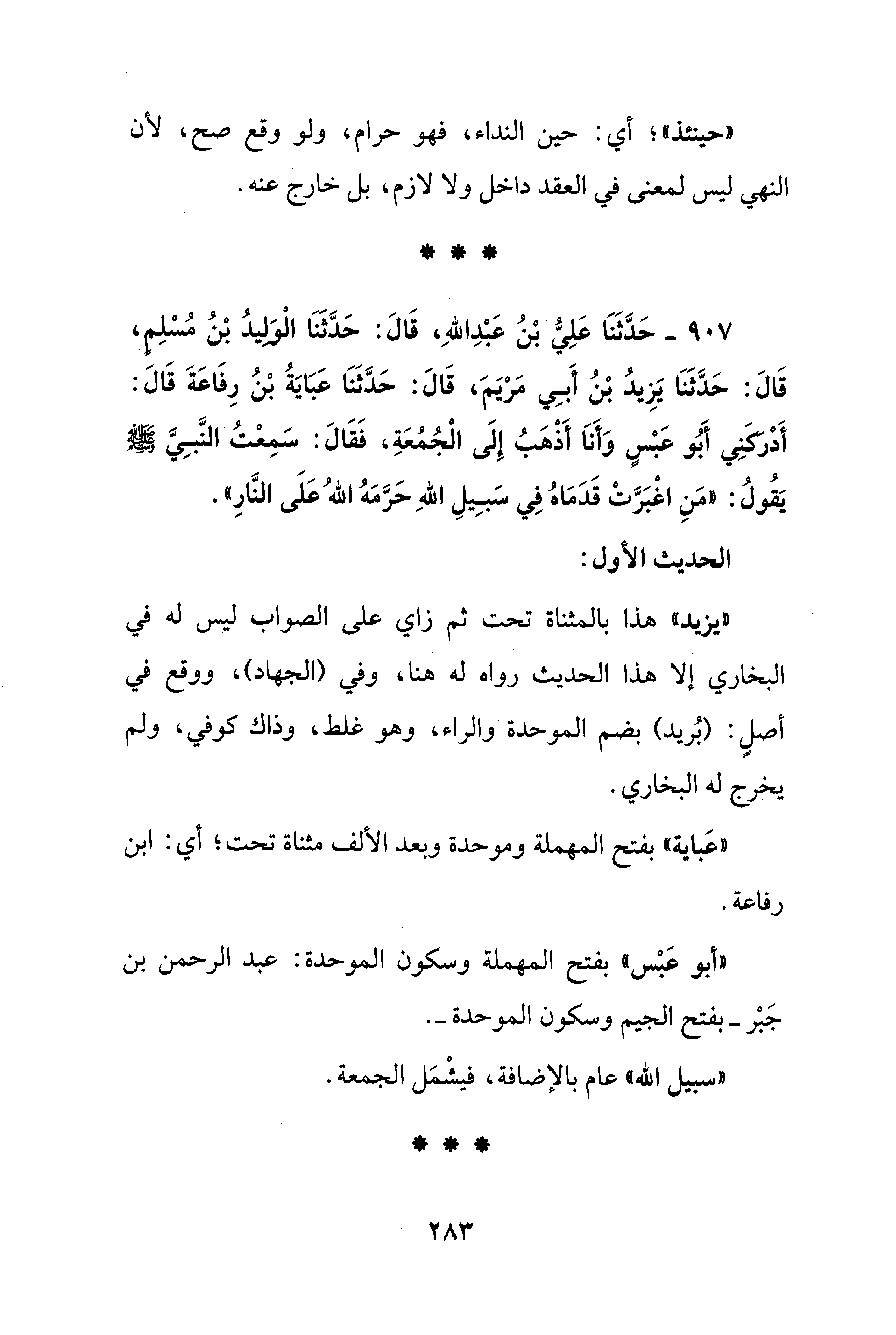 907 - حَدَّثَنَا عَلِيُّ بْنُ عَبْدِ اللهِ، قَالَ: حَدَّثَنَا الْوَلِيدُ بْنُ مُسْلِم، قَالَ: حَدَّثَنَا يَزِيدُ بْنُ أَبِي مَرْيَمَ، قَالَ: حَدَّثَنَا عَبَايَةُ بْنُ رِفَاعَةَ قَالَ: أَدْرَكنِي أَبُو عَبْسٍ وَأَناَ أَذْهَبُ إِلَى الْجُمُعَةِ، فَقَالَ: سَمِعْتُ النَّبِيَّ - صلى الله عليه وسلم - يَقُولُ: "مَنِ اغْبَرَّتْ قَدَمَاهُ فِي سَبِيلِ اللهِ حَرَّمَهُ اللهُ عَلَى النَّارِ".