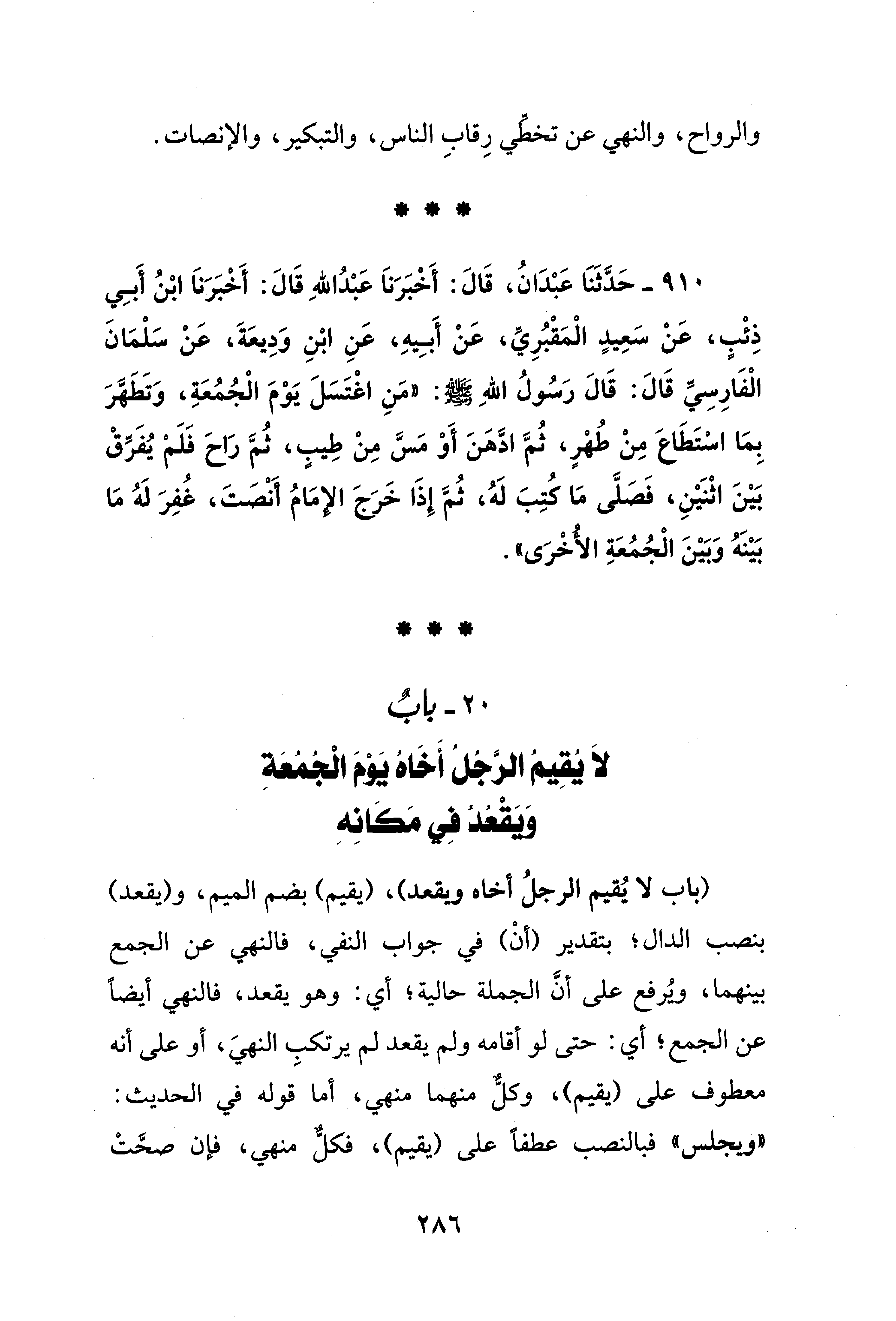 20 - بابٌ لاَ يُقِيمُ الرَّجُلُ أَخَاهُ يَوْمَ الْجُمُعَةِ وَيَقْعُدُ فِي مَكَانِهِ