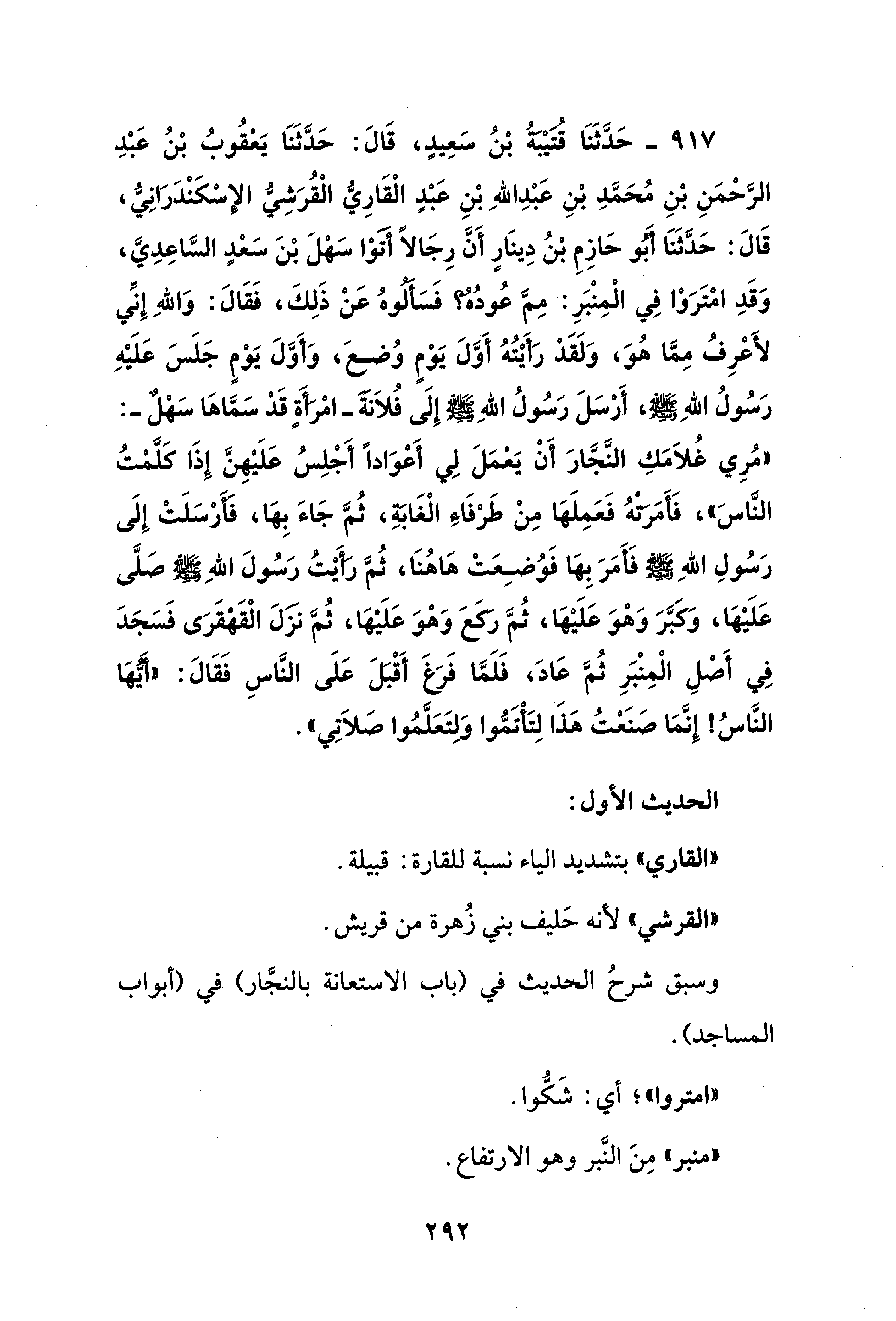 917 - حَدَّثَنَا قُتَيْبَةُ بْنُ سَعِيدٍ، قَالَ: حَدَّثَنَا يَعْقُوبُ بْنُ عَبْدِ الرَّحْمَنِ بْنِ مُحَمَّدِ بْنِ عَبْدِ اللهِ بْنِ عَبْدٍ الْقَارِيُّ الْقُرَشِيُّ الإسْكَنْدَرَانِيُّ، قَالَ: حَدَّثَنَا أَبُو حَازِمِ بْنُ دِينَارٍ أَنَّ رِجَالًا أتوْا سَهْلَ بْنَ سَعْدٍ السَّاعِدِيَّ، وَقَدِ امْتَرَوْا فِي الْمِنْبَرِ: مِمَّ عُودُه؟ فَسَأَلُوهُ عَنْ ذَلِكَ، فَقَالَ: وَاللهِ إِنِّي لأَعْرِفُ مِمَّا هُوَ، وَلَقَدْ رَأَيْتُهُ أَوَّلَ يَوْمٍ وُضِعَ، وَأَوَّلَ يَوْمٍ جَلَسَ عَلَيْهِ رَسُولُ اللهِ - صلى الله عليه وسلم -، أَرْسَلَ رَسُولُ اللهِ - صلى الله عليه وسلم - إِلَى فُلاَنةَ -امْرَأَةٍ قَدْ سَمَّاهَا سَهْلٌ-: "مُرِي غُلاَمَكِ النَّجَّارَ أَنْ يَعْمَلَ لِي أَعْوَادًا أَجْلِسُ عَلَيْهِنَّ إِذَا كَلَّمْتُ النَّاسَ"، فَأَمَرتْهُ فَعَمِلَهَا مِنْ طَرْفَاءَ الْغَابَةِ، ثُمَّ جَاءَ بِهَا، فَأَرْسَلَتْ إِلَى رَسُولِ اللهِ - صلى الله عليه وسلم - فَأَمَرَ بِهَا فَوُضِعَتْ هَاهُنَا، ثُمَّ رَأَيْتُ رَسُولَ اللهِ - صلى الله عليه وسلم - صَلَّى عَلَيْهَا، وَكبَّرَ وَهْوَ عَلَيْهَا، ثُمَّ ركعَ وَهْوَ عَلَيْهَا، ثُمَّ نزلَ الْقَهْقَرَى فَسَجَدَ فِي أَصْلِ الْمِنْبَرِ ثُمَّ عَادَ، فَلَمَّا فَرَغَ أَقْبَلَ عَلَى النَّاسِ فَقَالَ: "أَيُّهَا النَّاسُ! إِنَّمَا صَنَعْتُ هَذَا لِتَأْتَمُّوا وَلِتَعَلَّمُوا صَلاَتِي".