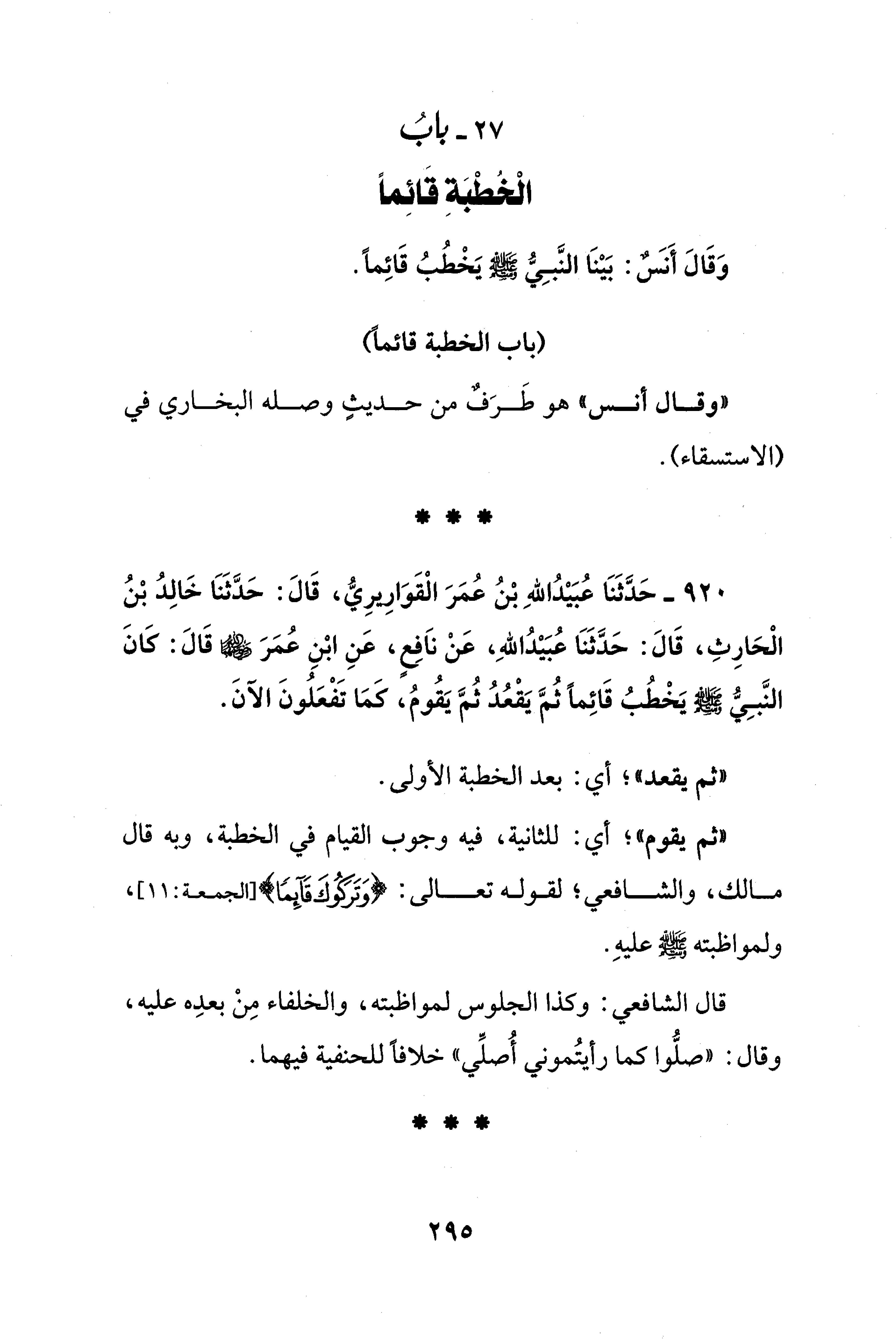 920 - حَدَّثَنَا عُبَيْدُ اللهِ بْنُ عُمَرَ الْقَوَارِيرِيُّ، قَالَ: حَدَّثَنَا خَالِدُ بْنُ الْحَارِثِ، قَالَ: حَدَّثَنَا عُبَيْدُ اللهِ، عَنْ ناَفِعٍ، عَنِ ابْنِ عُمَرَ - رضي الله عنهما - قَالَ: كَانَ النَّبِيُّ - صلى الله عليه وسلم - يَخْطُبُ قَائِمًا ثُمَّ يَقْعُدُ ثُمَّ يَقُومُ، كَمَا تَفْعَلُونَ الآنَ.