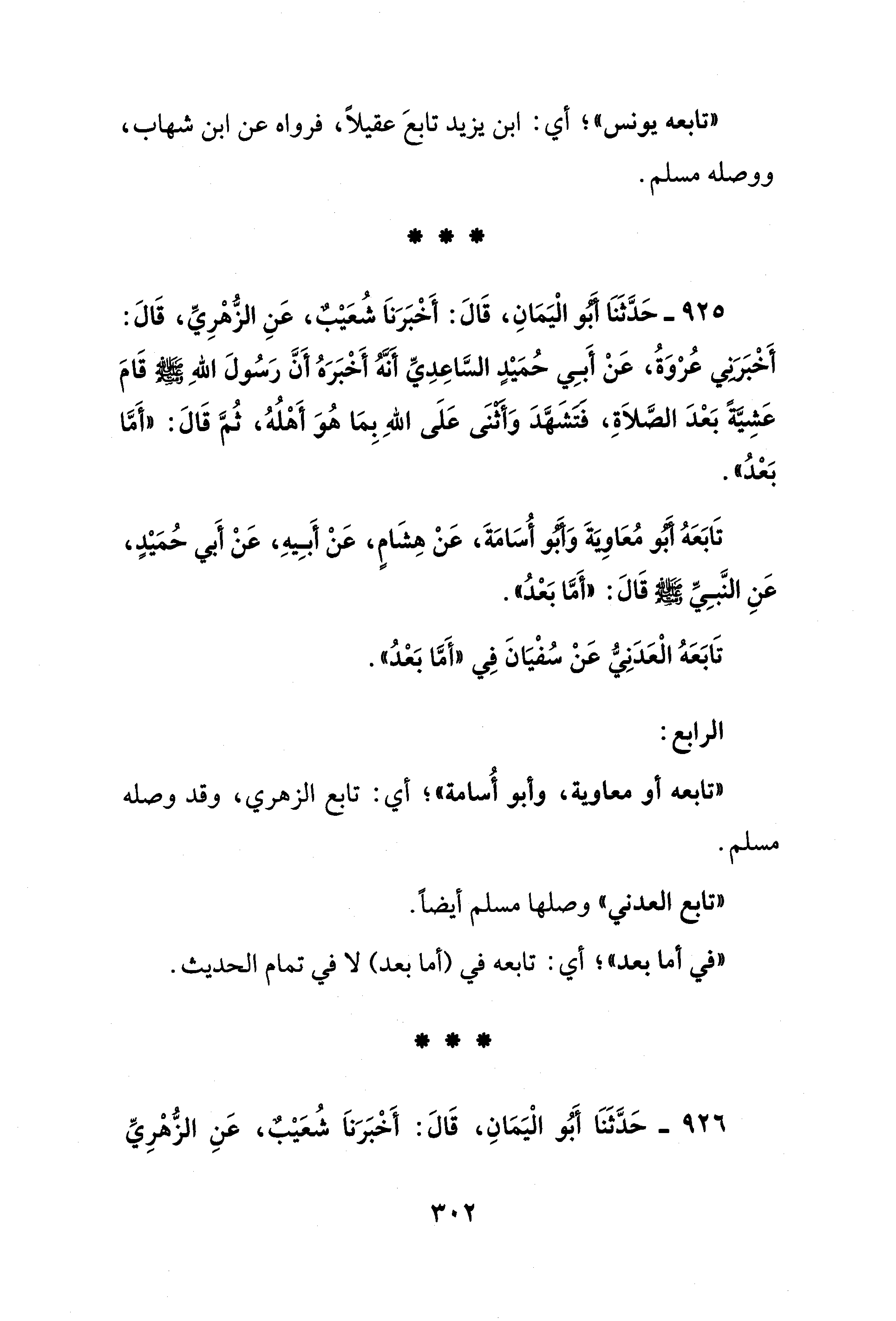 925 - حَدَّثَنَا أَبُو الْيَمَانِ، قَالَ: أَخْبَرَناَ شُعَيْبٌ، عَنِ الزُّهْرِيِّ، قَالَ: أَخْبَرَنِي عُرْوَةُ، عَنْ أبي حُمَيْدٍ السَّاعِدِيِّ أنَّهُ أَخْبَرَهُ أَنَّ رَسُولَ اللهِ - صلى الله عليه وسلم - قَامَ عَشِيَّةً بَعد الصَّلاةِ، فَتَشَهَّدَ وَأثْنَى عَلى اللهِ بِمَا هُوَ أهْلهُ، ثمَّ قالَ: "أمَّا بَعْدُ".