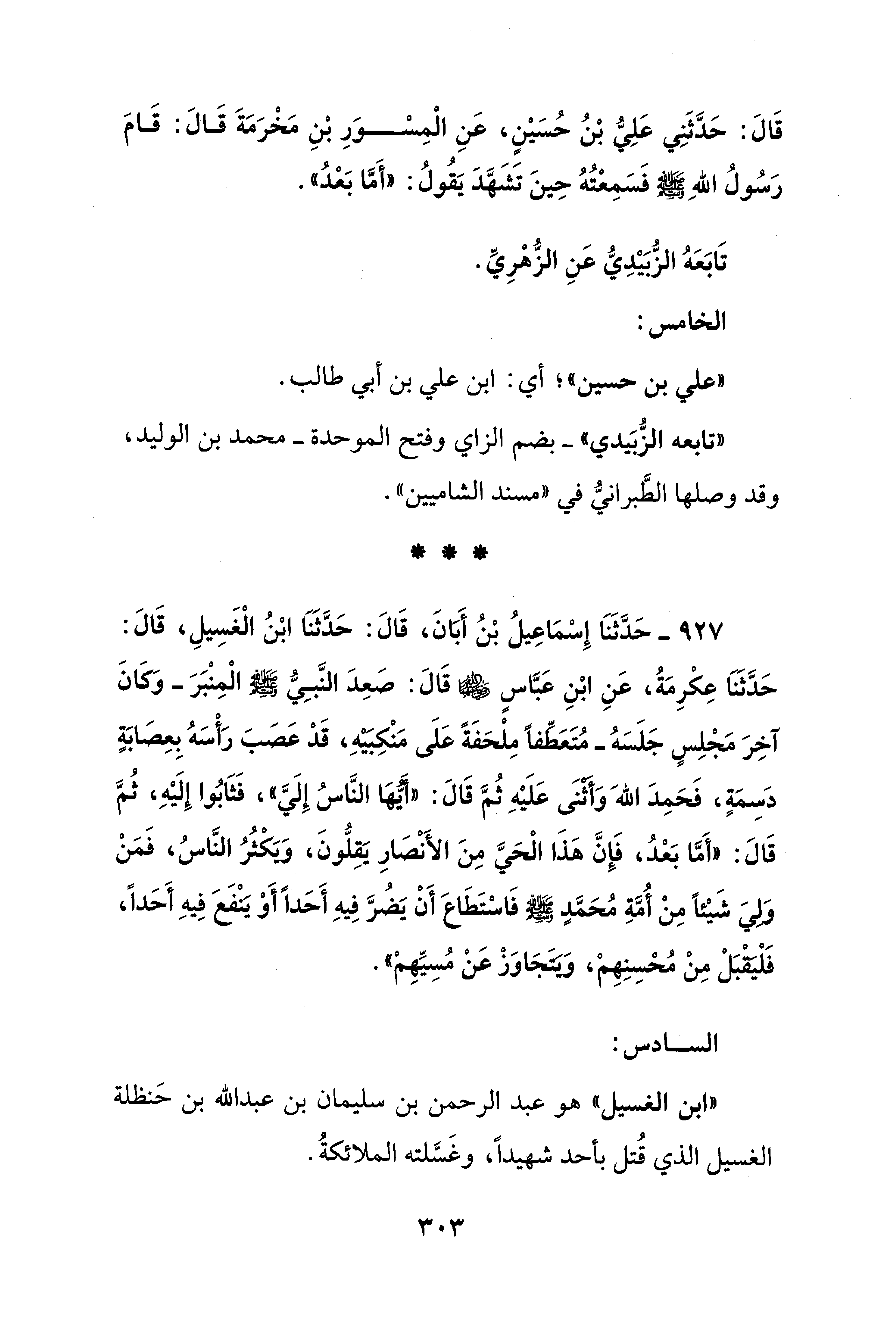 قَالَ: حَدَّثَنِي عَلِيُّ بْنُ حُسَيْنٍ، عَنِ الْمِسْوَرِ بْنِ مَخْرَمَةَ قَالَ: قَامَ رَسُولُ اللهِ - صلى الله عليه وسلم - فَسَمِعْتُهُ حِينَ تَشَهَّدَ يَقُولُ: "أَمَّا بَعْدُ".