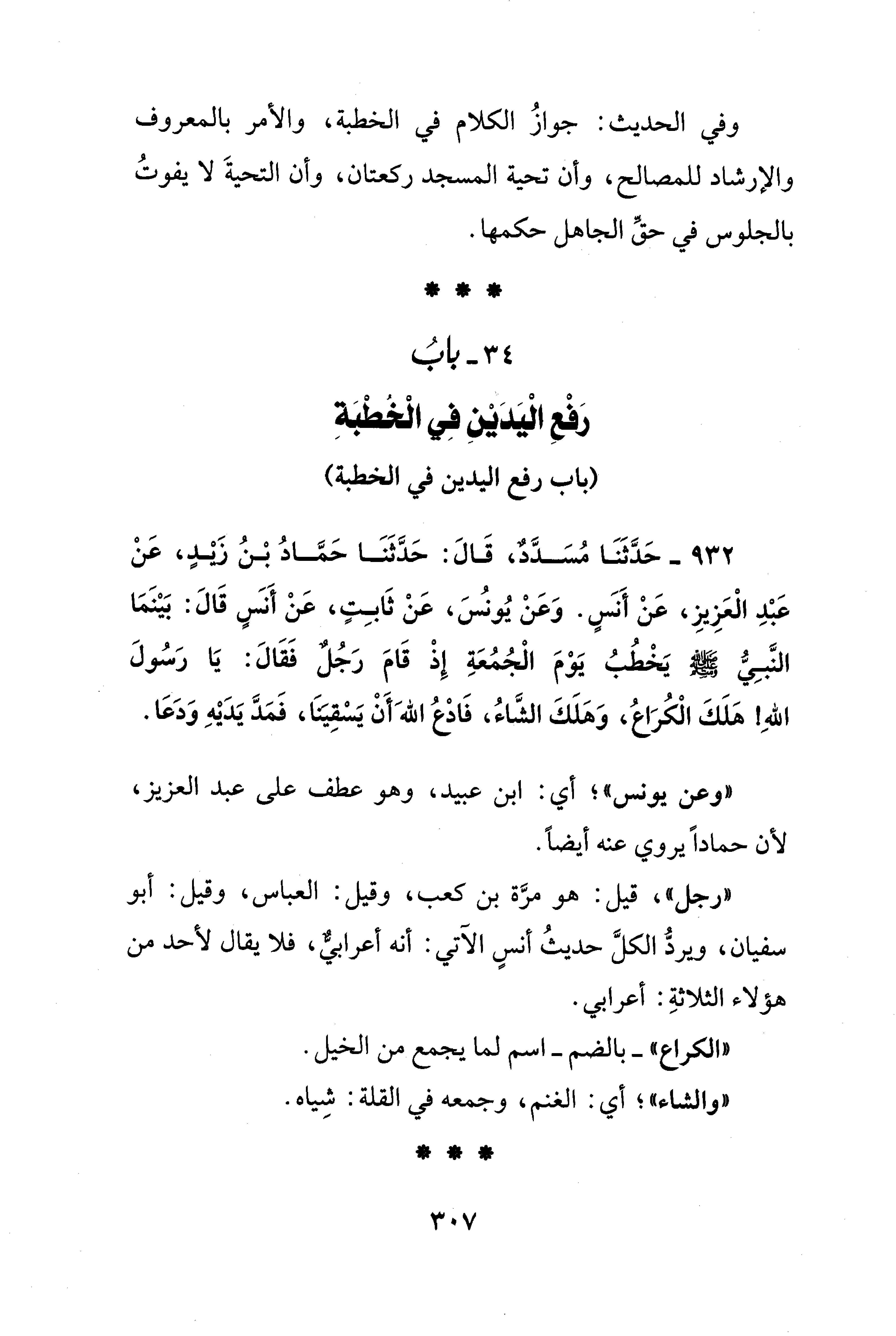 932 - حَدَّثَنَا مُسَدَّدٌ، قَالَ: حَدَّثَنَا حَمَّادُ بْنُ زيدٍ، عَنْ عَبْدِ الْعَزِيزِ، عَنْ أَنسٍ. وَعَنْ يُونسُ، عَنْ ثَابِتٍ، عَنْ أَنسٍ قَالَ: بَيْنَمَا النَّبِيُّ - صلى الله عليه وسلم - يَخْطُبُ يَوْمَ الْجُمُعَةِ إِذْ قَامَ رَجُلٌ فَقَالَ: يَا رَسُولَ اللهِ! هَلَكَ الْكُرَاعُ، وَهَلَكَ الشَّاءُ، فَادْع اللهَ أَنْ يَسْقِيَنَا، فَمَدَّ يَدَيْهِ وَدَعَا.