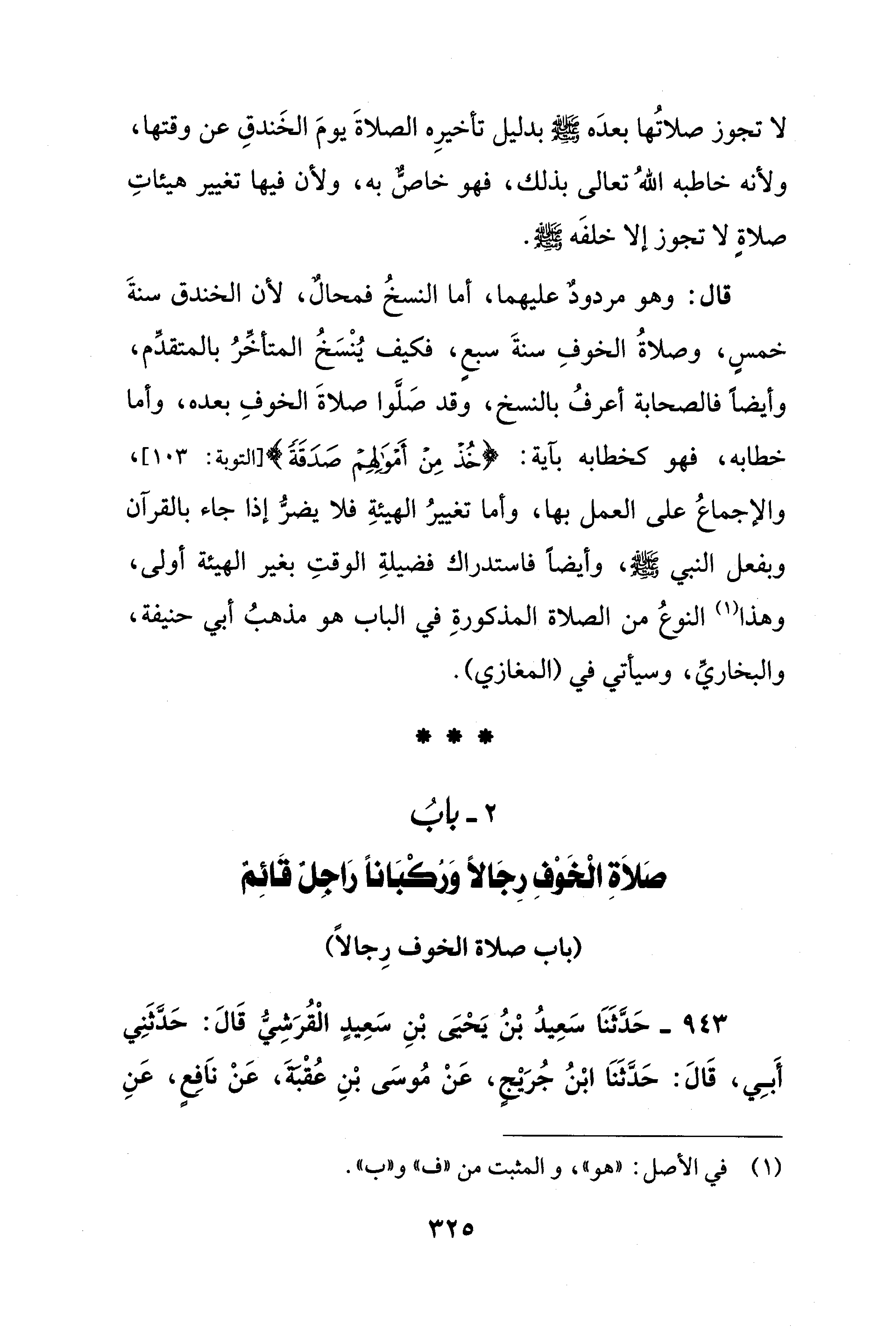 قال: وهو مردودٌ عليهما، أما النسخُ فمحالٌ، لأن الخندق سنةَ خمسٍ، وصلاةُ الخوفِ سنةَ سبعٍ، فكيف يُنْسَخُ المتأخِّرُ بالمتقدِّم، وأيضًا فالصحابة أعرفُ بالنسخ، وقد صَلَّوا صلاةَ الخوفِ بعده، وأما خطابه، فهو كخطابه بآية: {خُذْ مِنْ أَمْوَالِهِمْ صَدَقَةً} [التوبة: 103]، والإجماعُ على العمل بها، وأما تغييرُ الهيئةِ فلا يضرُّ إذا جاء بالقرآن وبفعل النبي - صلى الله عليه وسلم -، وأيضًا فاستدراك فضيلةِ الوقتِ بغير الهيئة أولى، وهذا (¬1) النوعُ من الصلاة المذكورةِ في الباب هو مذهبُ أبي حنيفة، والبخاريِّ، وسيأتي في (المغازي).