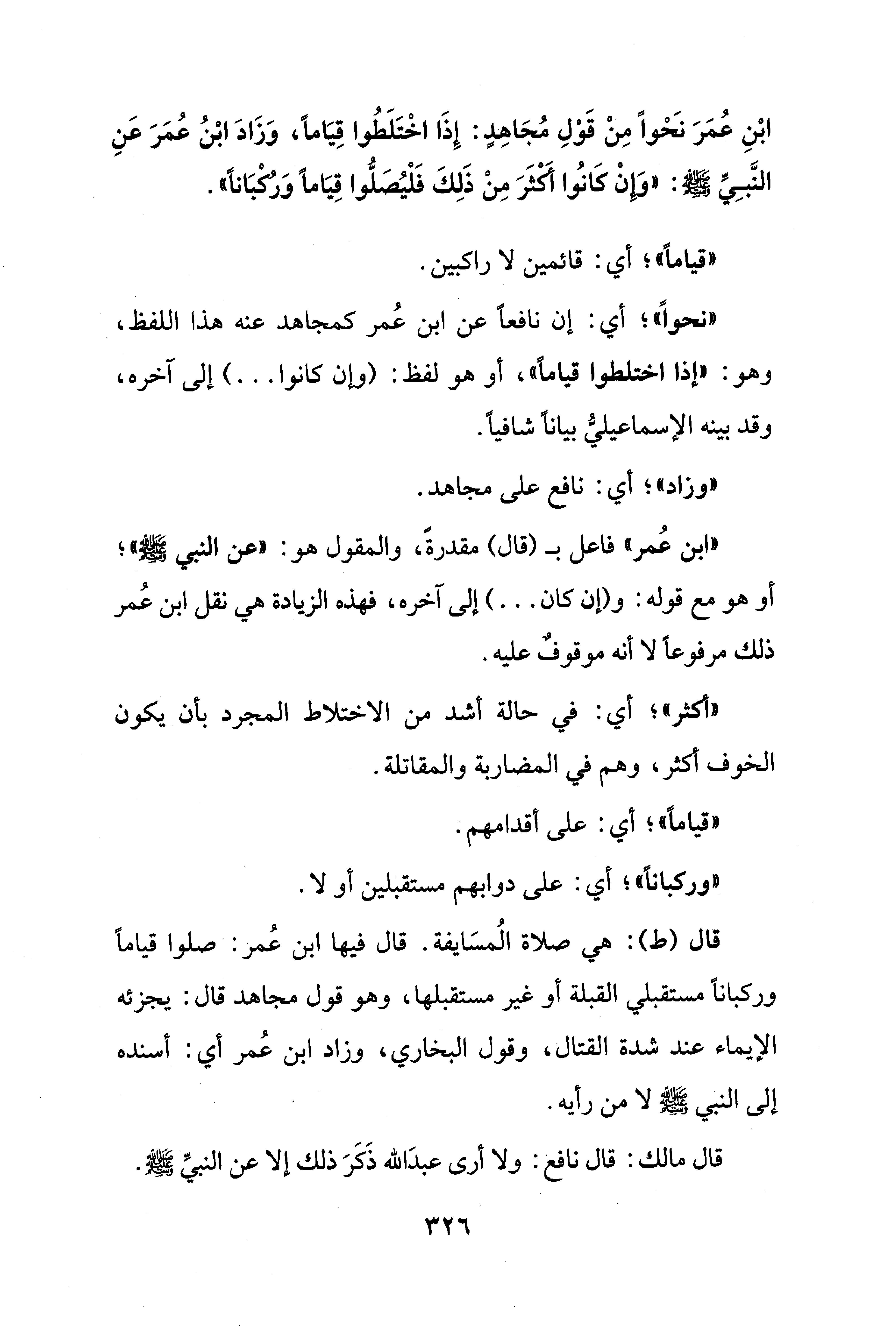 ابْنِ عُمَرَ نَحْوًا مِنْ قَوْلِ مُجَاهِدٍ: إِذَا اخْتَلَطُوا قِيَامًا، وَزَادَ ابْنُ عُمَرَ عَنِ النَّبِيِّ - صلى الله عليه وسلم -: "وَإِنْ كَانُوا أَكْثَرَ مِنْ ذَلِكَ فَلْيُصَلُّوا قِيَامًا وَرُكْبَانًا".