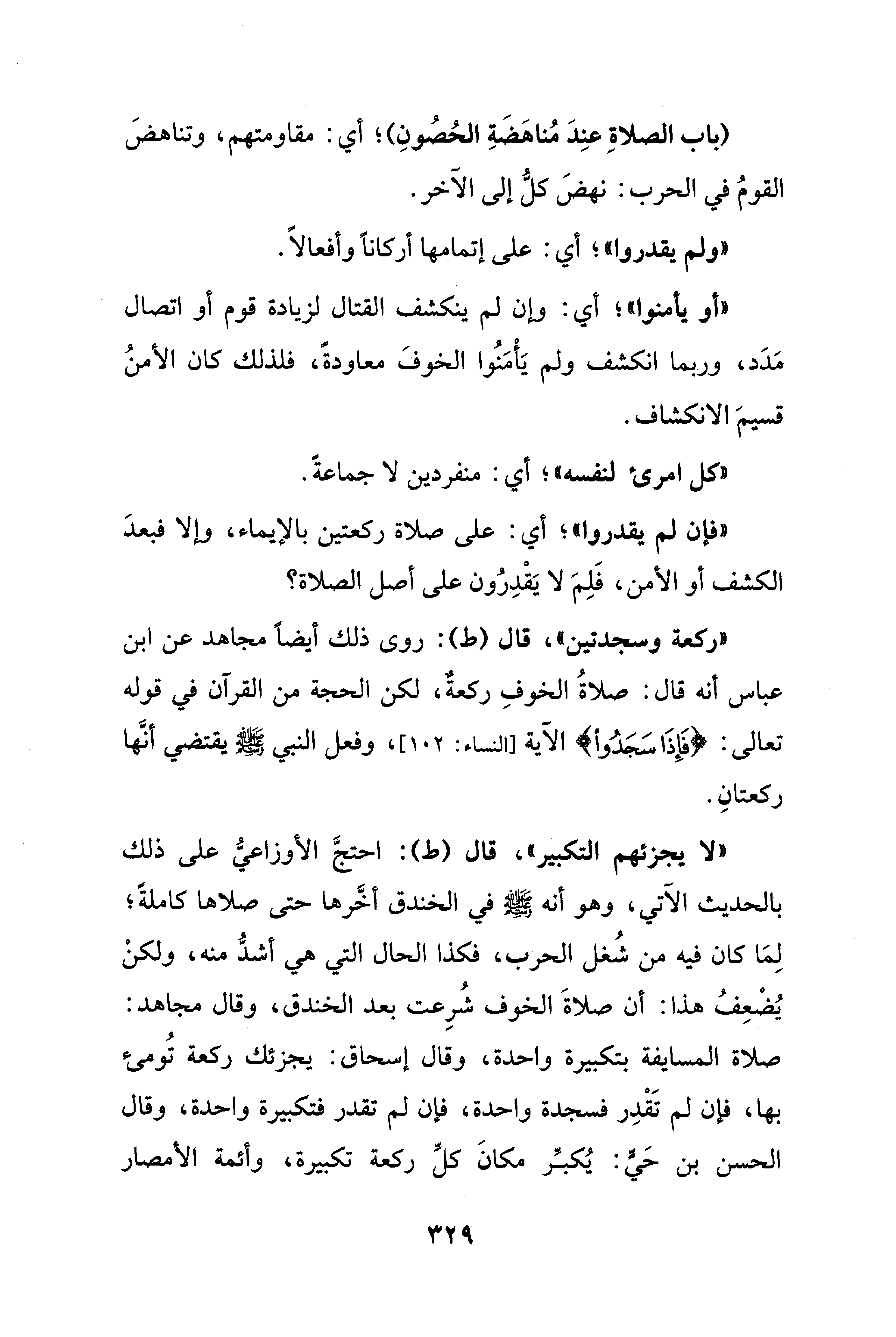"لا يجزئهم التكبير"، قال (ط): احتجَّ الأوزاعيُّ على ذلك بالحديث الآتي، وهو أنه - صلى الله عليه وسلم - في الخندق أخَّرها حتى صلاها كاملةً؛ لِمَا كان فيه من شُغل الحرب، فكذا الحال التي هي أشدُّ منه، ولكنْ يُضْعِفُ هذا: أن صلاةَ الخوف شُرِعت بعد الخندق، وقال مجاهد: صلاة المسايفة بتكبيرة واحدة، وقال إسحاق: يجزئك ركعة تُومئ بها، فإن لم تَقْدِر فسجدة واحدة، فإن لم تقدر فتكبيرة واحدة، وقال الحسن بن حَيٍّ: يُكبِّر مكانَ كلِّ ركعة تكبيرة، وأئمة الأمصار