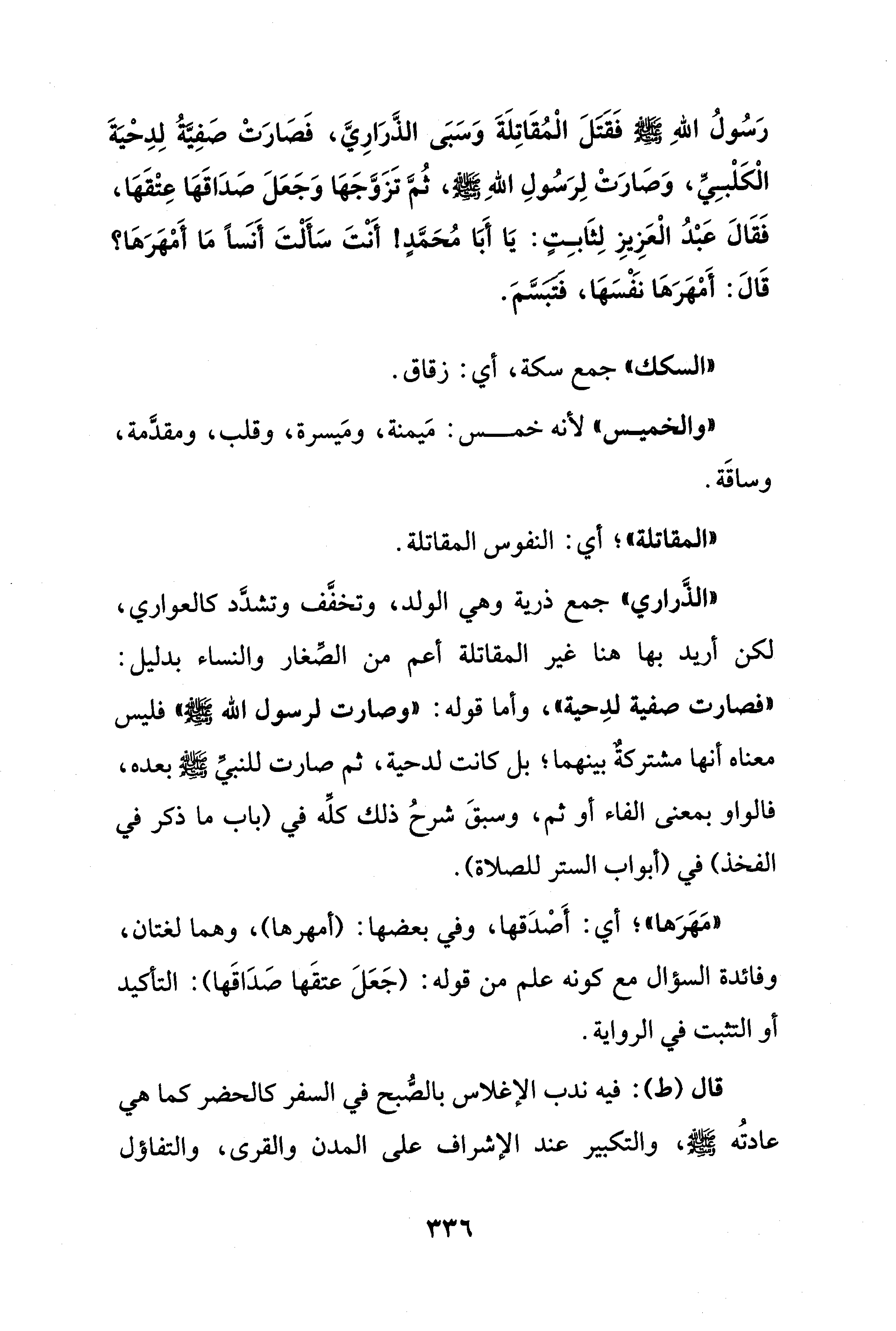 رَسُولُ اللهِ - صلى الله عليه وسلم - فَقَتَلَ الْمُقَاتِلَةَ وَسَبَى الذَّرَارِيَّ، فَصَارَتْ صَفِيَّةُ لِدِحْيَةَ الْكَلْبِيِّ، وَصَارَتْ لِرَسُولِ اللهِ - صلى الله عليه وسلم -، ثُمَّ تَزَوَّجَهَا وَجَعَلَ صَدَاقَهَا عِتْقَهَا، فَقَالَ عَبْدُ الْعَزِيزِ لِثَابِتٍ: يَا أَبَا مُحَمَّدٍ! أَنْتَ سَأَلْتَ أَنسًا مَا أَمْهَرَهَا؟ قَالَ: أَمْهَرَهَا نفسَهَا، فتبسَّمَ.