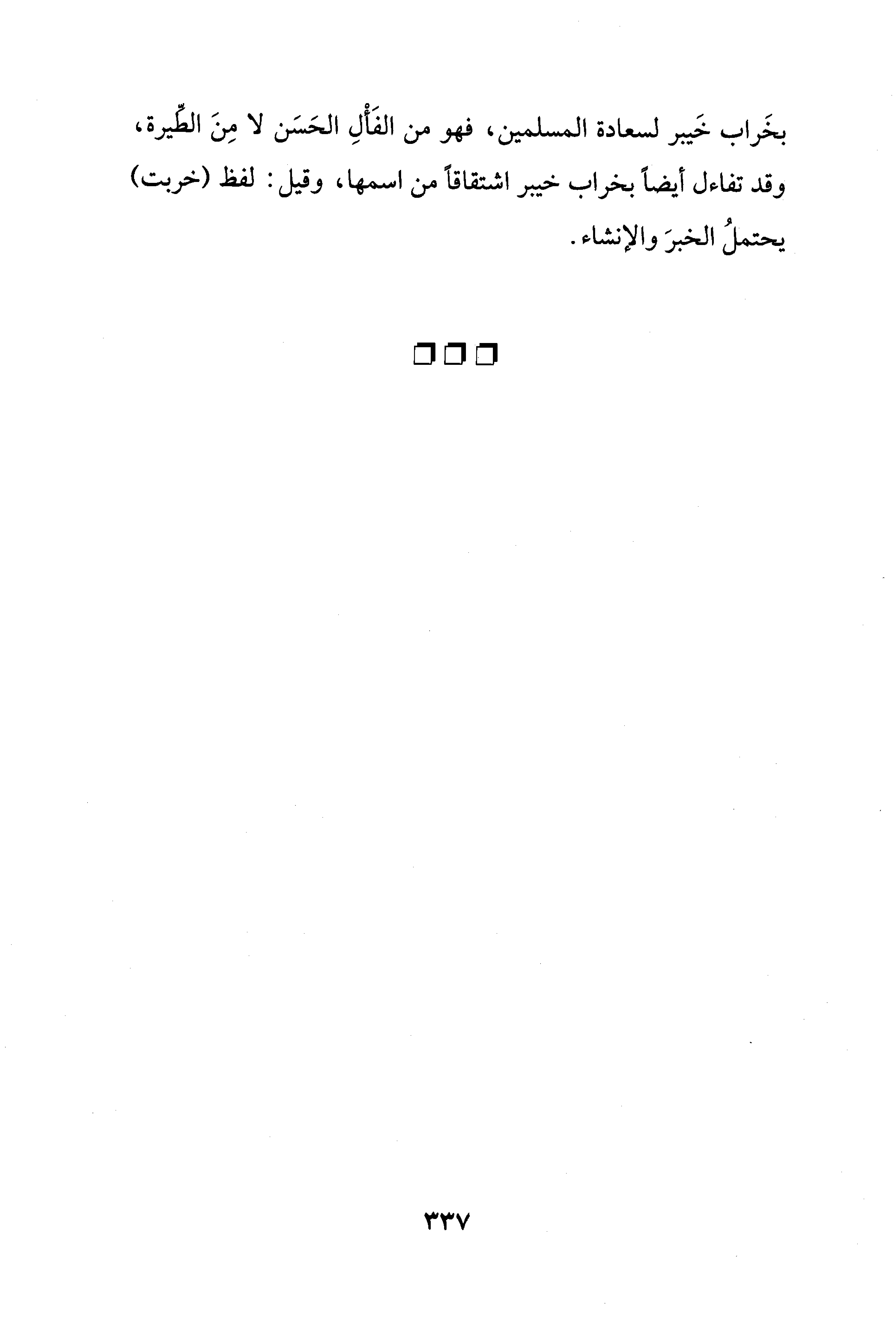 بخَراب خَيبر لسعادة المسلمين، فهو من الفَأْلِ الحَسَن لا مِنَ الطِّيرة، وقد تفاءل أيضًا بخراب خيبر اشتقاقًا من اسمها، وقيل: لفظ (خربت) يحتملُ الخبرَ والإنشاء.