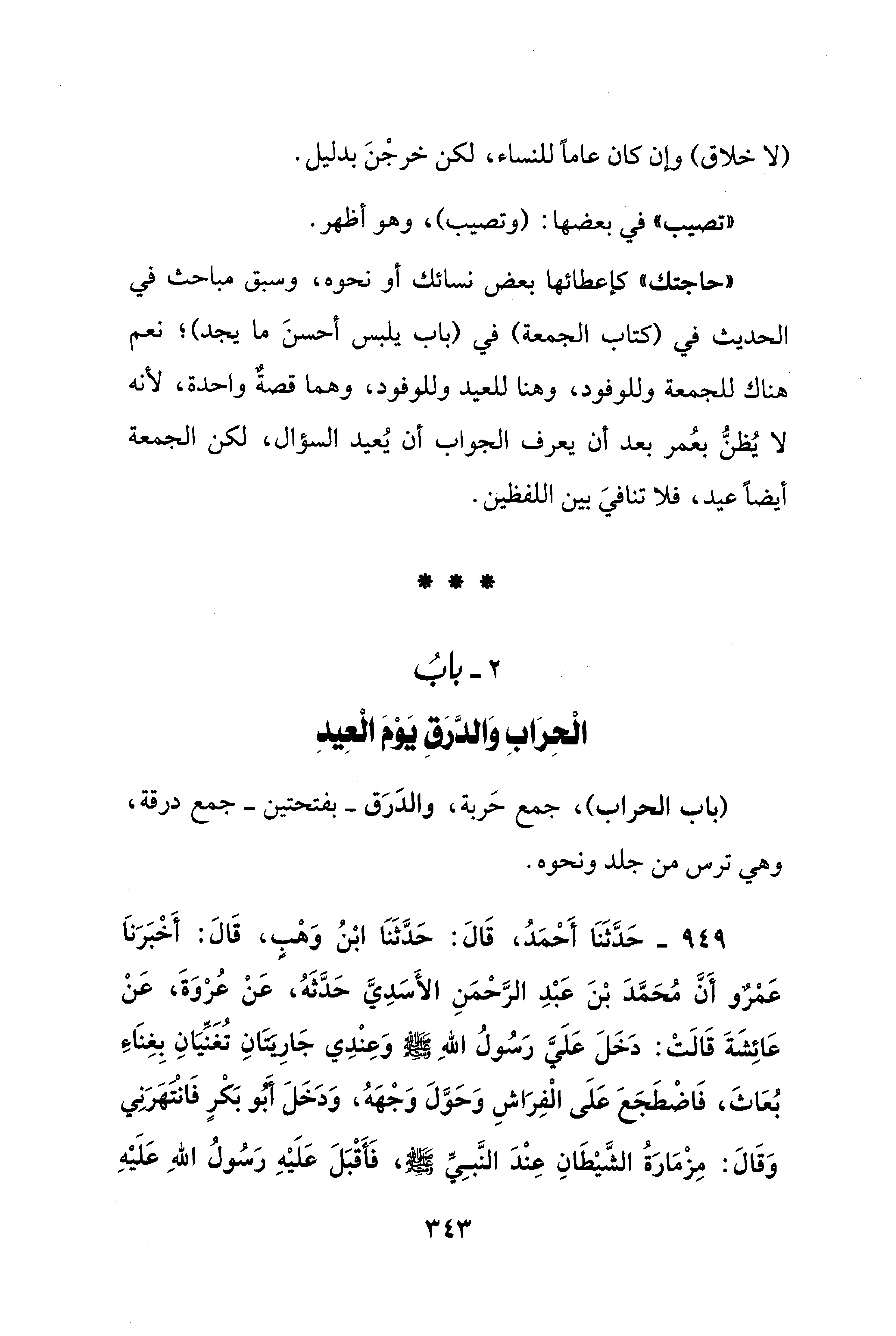 949 - حَدَّثَنَا أَحْمَدُ، قَالَ: حَدَّثَنَا ابْنُ وَهْبٍ، قَالَ: أَخْبَرَناَ عَمْرٌو أَنَّ مُحَمَّدَ بْنَ عَبْدِ الرَّحْمَنِ الأَسَدِيَّ حَدَّثَهُ، عَنْ عُرْوَةَ، عَنْ عَائِشَةَ قَالَتْ: دَخَلَ عَلَيَّ رَسُولُ اللهِ - صلى الله عليه وسلم - وَعِنْدِي جَارِيَتَانِ تُغَنِّيَانِ بِغِنَاءِ بُعَاثَ، فَاضْطَجَعَ عَلَى الْفِرَاشِ وَحَوَّلَ وَجْهَهُ، وَدَخَلَ أَبُو بَكْرٍ فَانتهَرَنِي وَقَالَ: مِزْمَارَةُ الشَّيْطَانِ عِنْدَ النَّبِيِّ - صلى الله عليه وسلم -، فَأَقْبَلَ عَلَيْهِ رَسُولُ اللهِ عَلَيْهِ