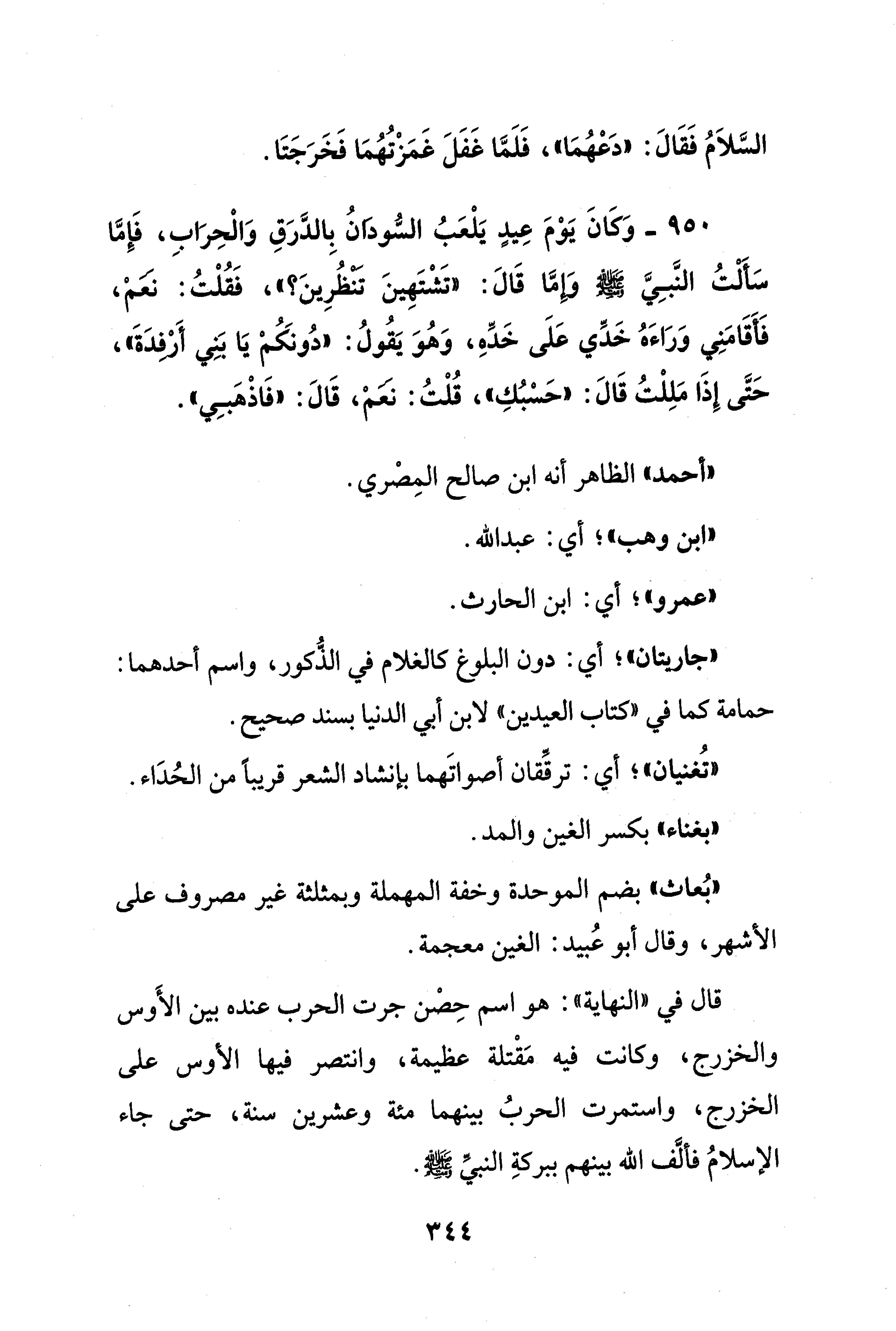950 - وَكَانَ يَوْمَ عِيدٍ يَلْعَبُ السُّودَانُ بِالدَّرَقِ وَالْحِرَابِ، فَإِمَّا سَأَلْتُ النَّبِيَّ - صلى الله عليه وسلم - وَإِمَّا قَالَ: "تَشْتَهِينَ تنظُرِينَ؟ "، فَقُلْتُ: نعمْ، فَأَقَامَنِي وَرَاءَهُ خَدِّي عَلَى خَدِّهِ، وَهُوَ يَقُولُ: "دُونكُمْ يَا بَنِي أَرْفِدَةَ"، حَتَّى إِذَا مَلِلْتُ قَالَ: "حَسْبُكِ"، قُلْتُ: نعمْ، قَالَ: "فَاذْهَبِي".
