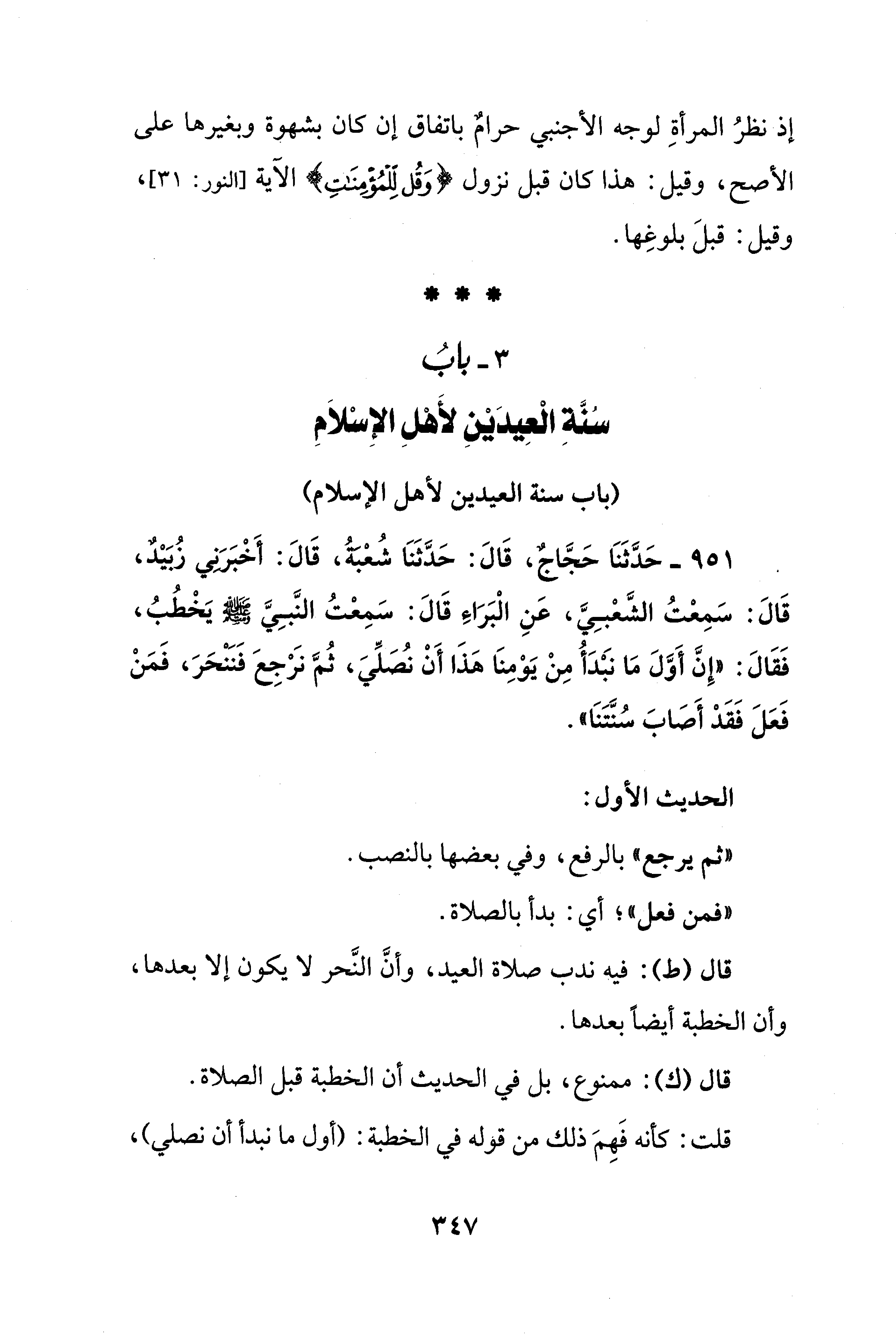 951 - حَدَّثَنَا حَجَّاجٌ، قَالَ: حَدَّثَنَا شُعْبَةُ، قَالَ: أَخْبَرَنِي زُبَيْدٌ، قَالَ: سَمِعْتُ الشَّعْبِيَّ، عَنِ الْبَرَاءِ قَالَ: سَمِعْتُ النَّبِيَّ - صلى الله عليه وسلم - يَخْطُبُ، فَقَالَ: "إِنَّ أَوَّلَ مَا نبدَأُ مِنْ يَوْمِنَا هَذَا أَنْ نُصَلِّيَ، ثُمَّ نَرْجِعَ فَنَنْحَرَ، فَمَنْ فَعَلَ فَقَدْ أَصَابَ سُنَّتَنَا".