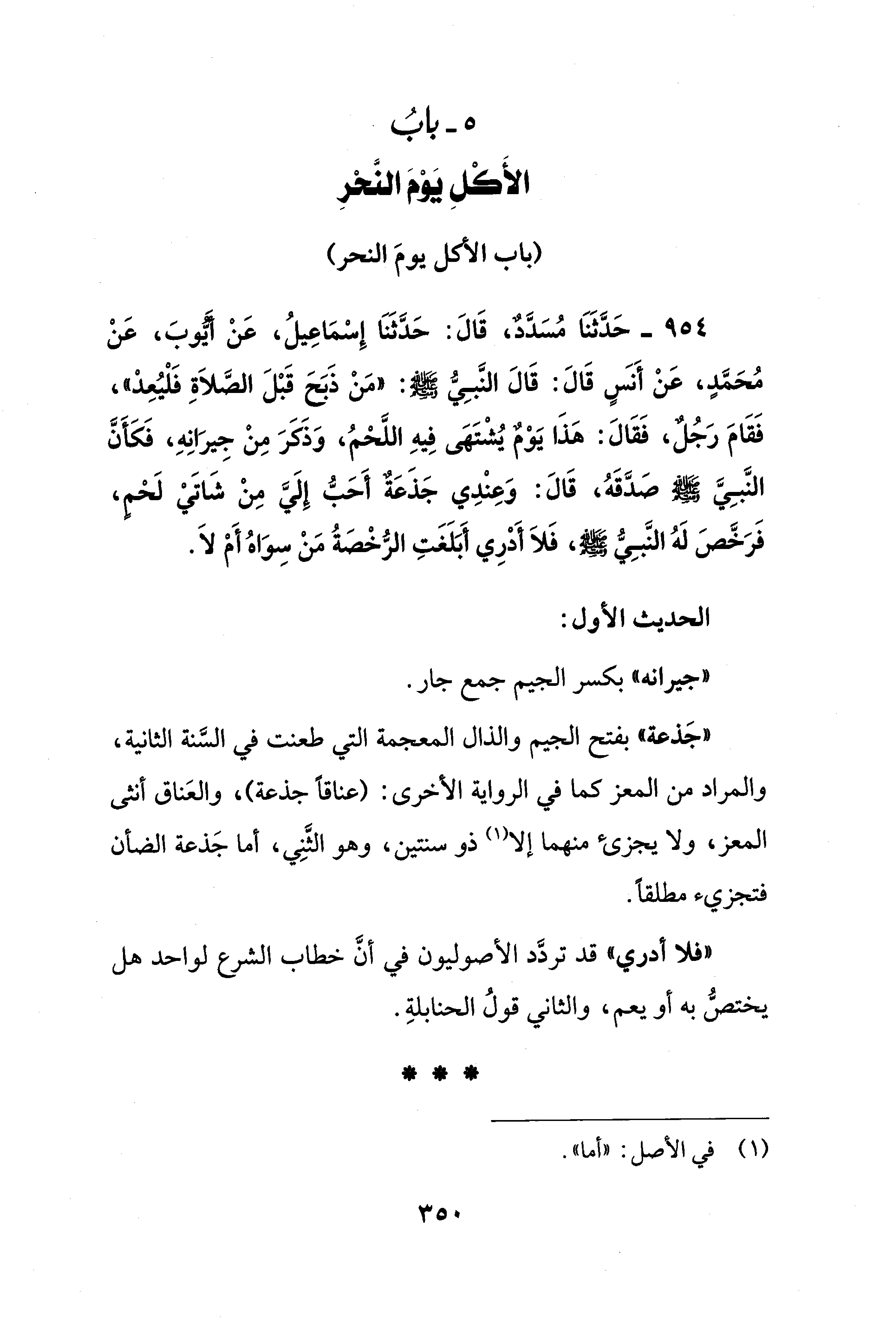 954 - حَدَّثَنَا مُسَدَّدٌ، قَالَ: حَدَّثَنَا إِسْمَاعِيلُ، عَنْ أَيُّوبَ، عَنْ مُحَمَّدٍ، عَنْ أَنسٍ قَالَ: قَالَ النَّبِيُّ - صلى الله عليه وسلم -: "مَنْ ذَبَحَ قَبْلَ الصَّلاَةِ فَلْيُعِدْ"، فَقَامَ رَجُلٌ، فَقَالَ: هَذَا يَوْمٌ يُشْتَهَى فِيهِ اللَّحْمُ، وَذَكَرَ مِنْ جِيرَانِهِ، فَكَأَنَّ النَّبِيَّ - صلى الله عليه وسلم - صَدَّقَهُ، قَالَ: وَعِنْدِي جَذَعَةٌ أَحَبُّ إِلَيَّ مِنْ شَاتَيْ لَحْمٍ، فَرَخَّصَ لَهُ النَّبِيُّ - صلى الله عليه وسلم -، فَلاَ أَدْرِي أَبَلَغَتِ الرُّخْصَةُ مَنْ سِوَاهُ أَمْ لاَ.