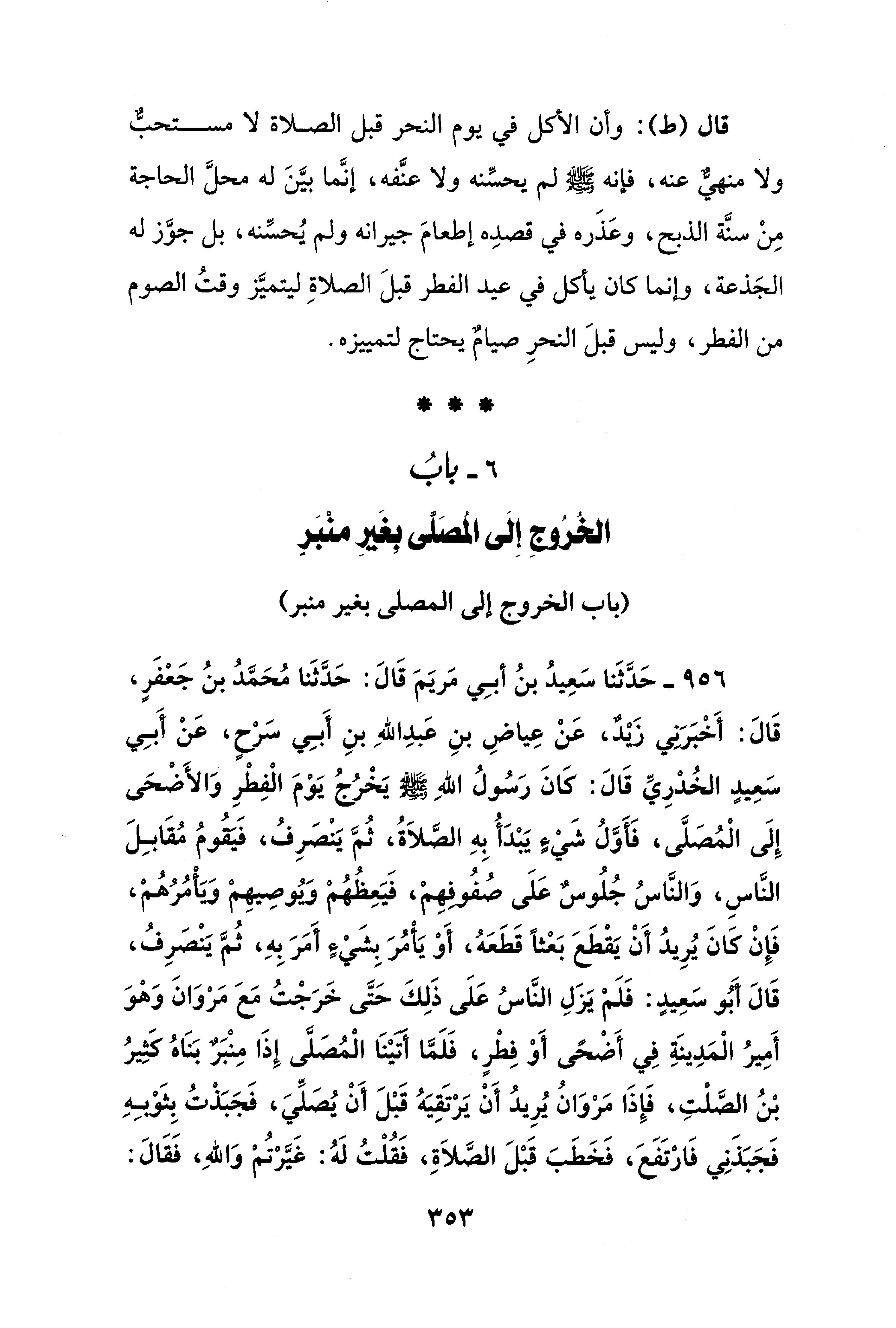 قال (ط): وأن الأكل في يوم النحر قبل الصلاة لا مستحبٌّ ولا منهيٌّ عنه، فإنه - صلى الله عليه وسلم - لم يحسِّنه ولا عنَّفه، إنَّما بيَّنَ له محلَّ الحاجة مِنْ سنَّة الذبح، وعَذَره في قصدِه إطعامَ جيرانه ولم يُحسِّنه، بل جوَّز له الجَذعة، وإنما كان يأكل في عيد الفطر قبلَ الصلاةِ ليتميَّز وقتُ الصوم من الفطر، وليس قبلَ النحرِ صيامٌ يحتاج لتمييزه.