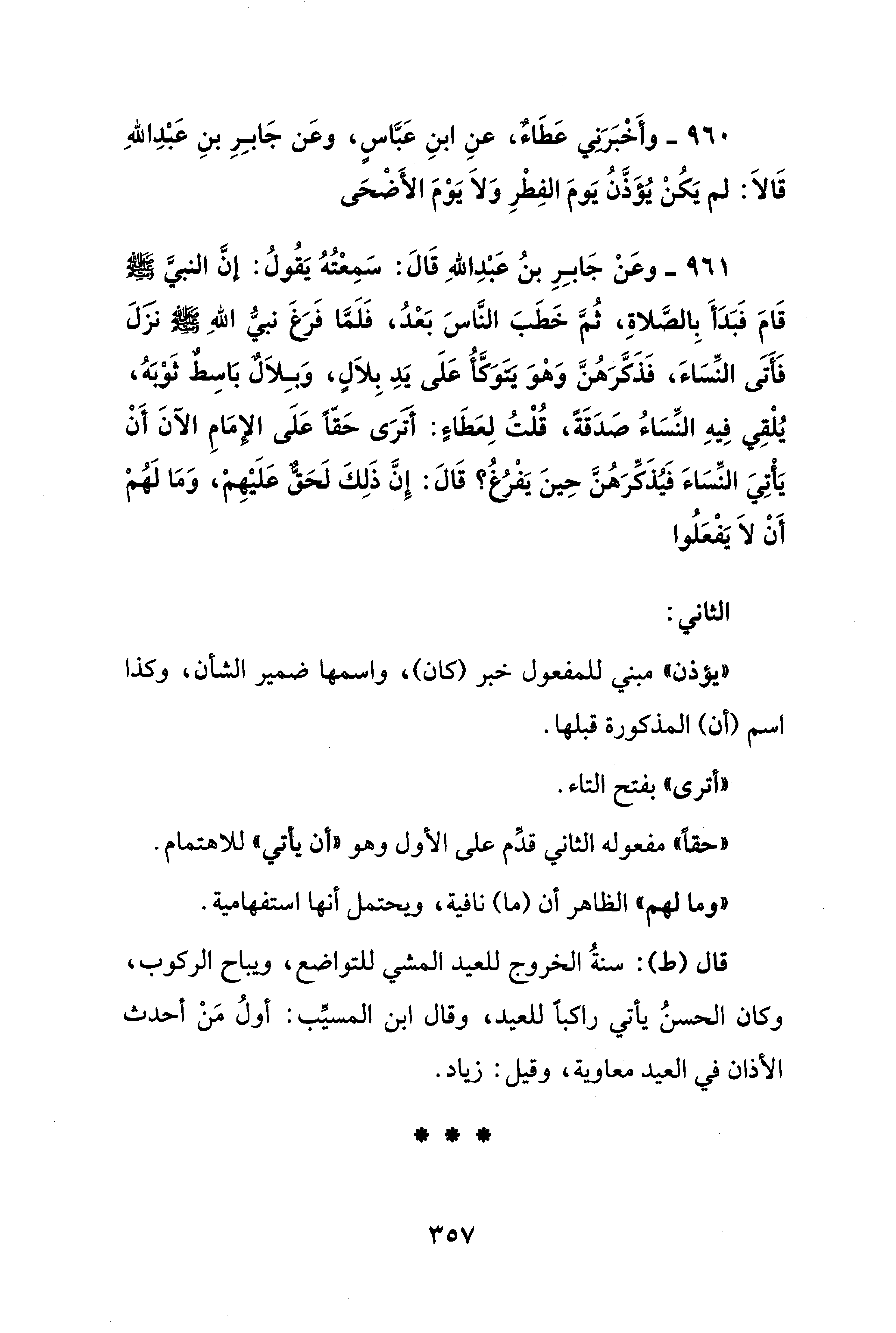 961 - وعَنْ جَابِرِ بنُ عَبْدِ اللهِ قَالَ: سَمِعْتُهُ يَقُولُ: إنَّ النبيَّ - صلى الله عليه وسلم - قَامَ فَبَدَأَ بِالصَّلاةِ، ثُمَّ خَطَبَ النَّاسَ بَعْدُ، فَلَمَّا فَرَغَ نبيُّ اللهِ - صلى الله عليه وسلم - نزَلَ فَأَتَى النِّسَاءَ، فَذَكَّرَهُنَّ وَهْوَ يَتَوَكَّأُ عَلَى يَدِ بِلاَلٍ، وَبِلاَلٌ بَاسِطٌ ثَوْبَهُ، يُلْقِي فِيهِ النِّسَاءُ صَدَقَةً، قُلْتُ لِعَطَاءٍ: أتَرَى حَقًّا عَلَى الإمَامِ الآنَ أَنْ يَأْتِيَ النِّسَاءَ فَيُذَكِّرَهُنَّ حِينَ يَفْرُغُ؟ قَالَ: إِنَّ ذَلِكَ لَحَقٌّ عَلَيْهِمْ، وَمَا لَهُمْ أَنْ لاَ يَفْعَلُوا.