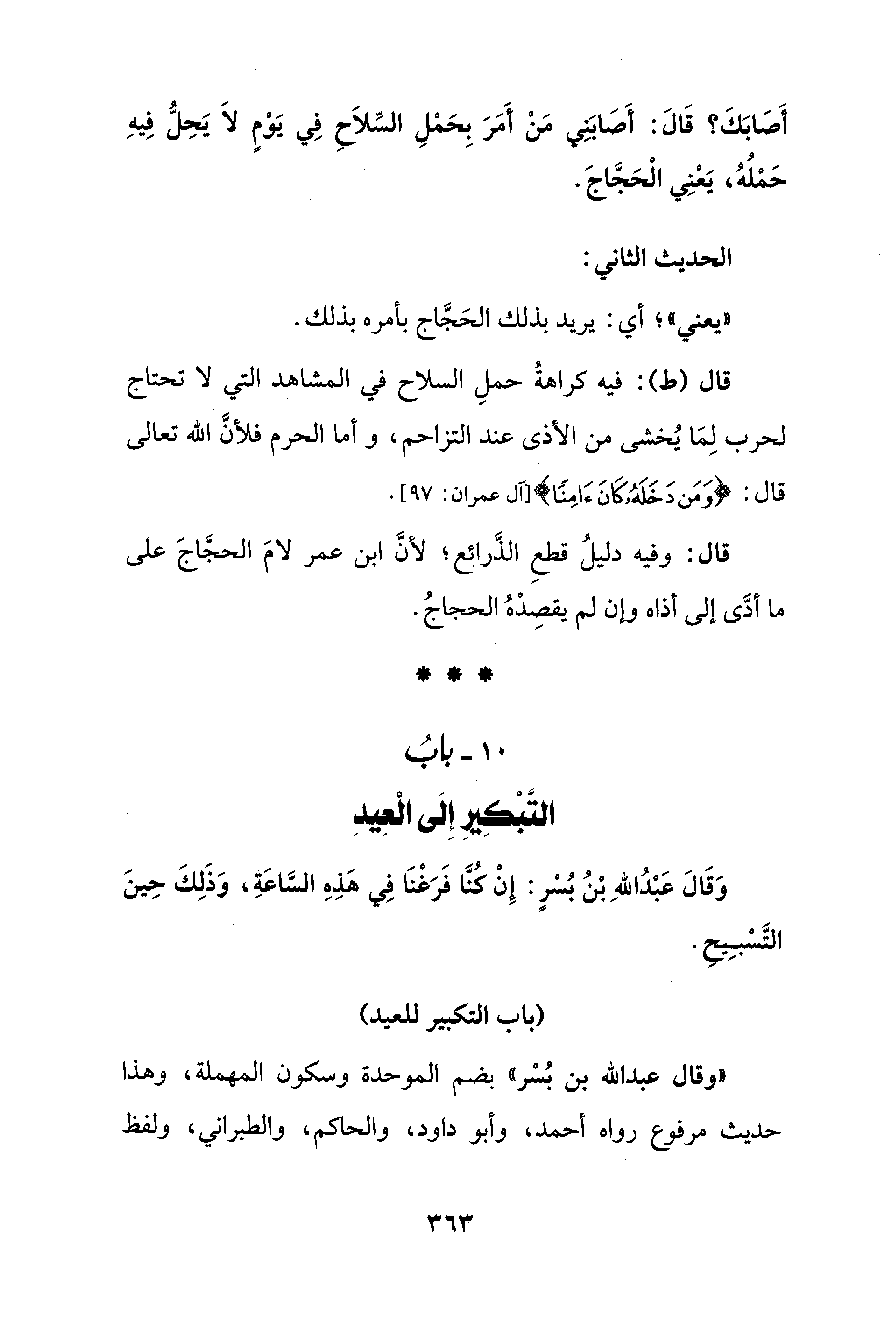 أَصَابَكَ؟ قَالَ: أَصَابَنِي مَنْ أَمَرَ بِحَمْلِ السِّلاَحِ فِي يَوْمٍ لاَ يَحِلُّ فِيهِ حَمْلُهُ، يَعْنِي الْحَجَّاجَ.