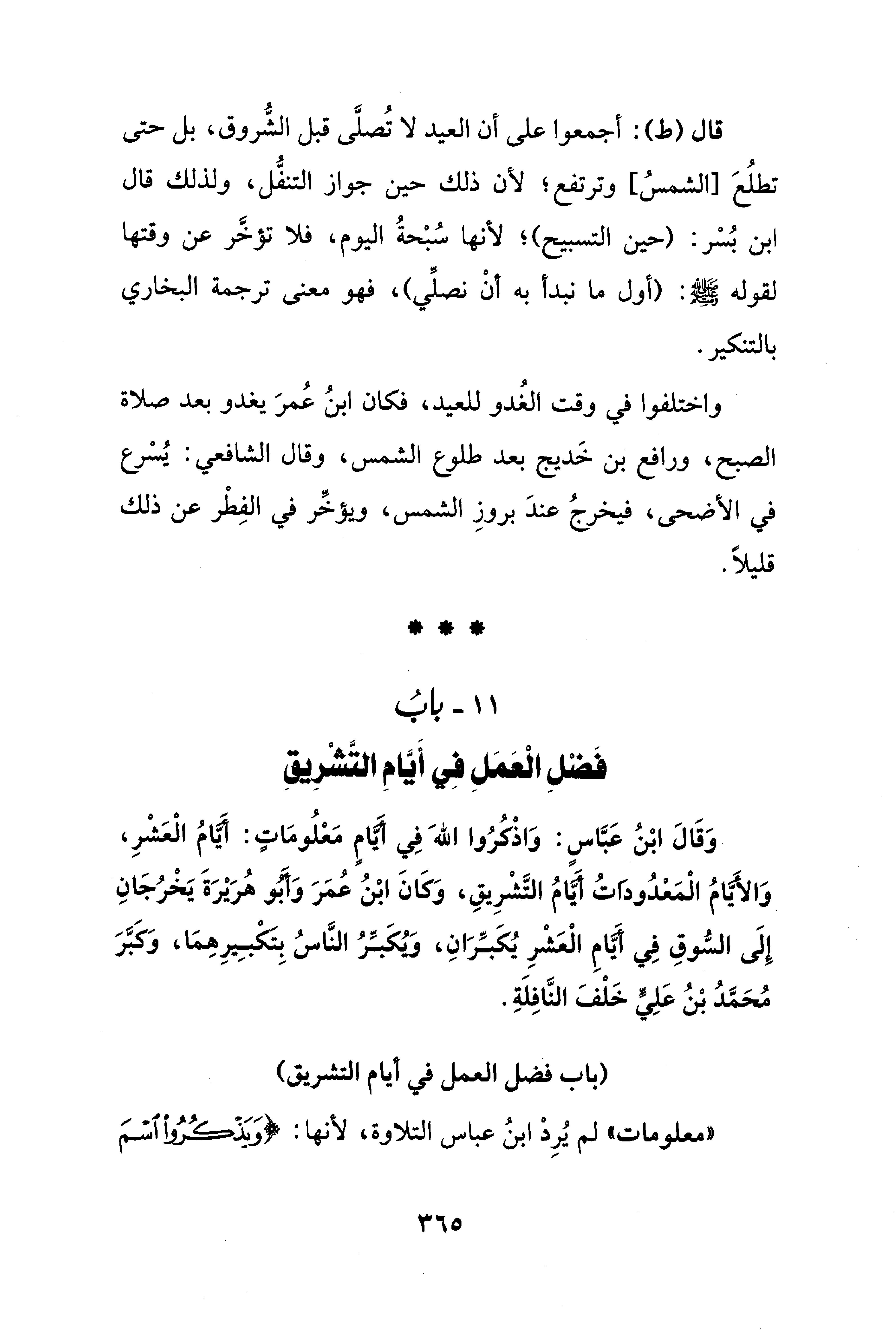 قال (ط): أجمعوا على أن العيد لا تُصلَّى قبل الشُّروق، بل حتى تطلُعَ [الشمسُ] وترتفع؛ لأن ذلك حين جواز التنفُّل، ولذلك قال ابن بُسْر: (حين التسبيح)؛ لأنها سُبْحةُ اليوم، فلا تؤخَّر عن وقتها لقوله - صلى الله عليه وسلم -: (أول ما نبدأ به أنْ نصلِّي)، فهو معنى ترجمة البخاري بالتنكير.