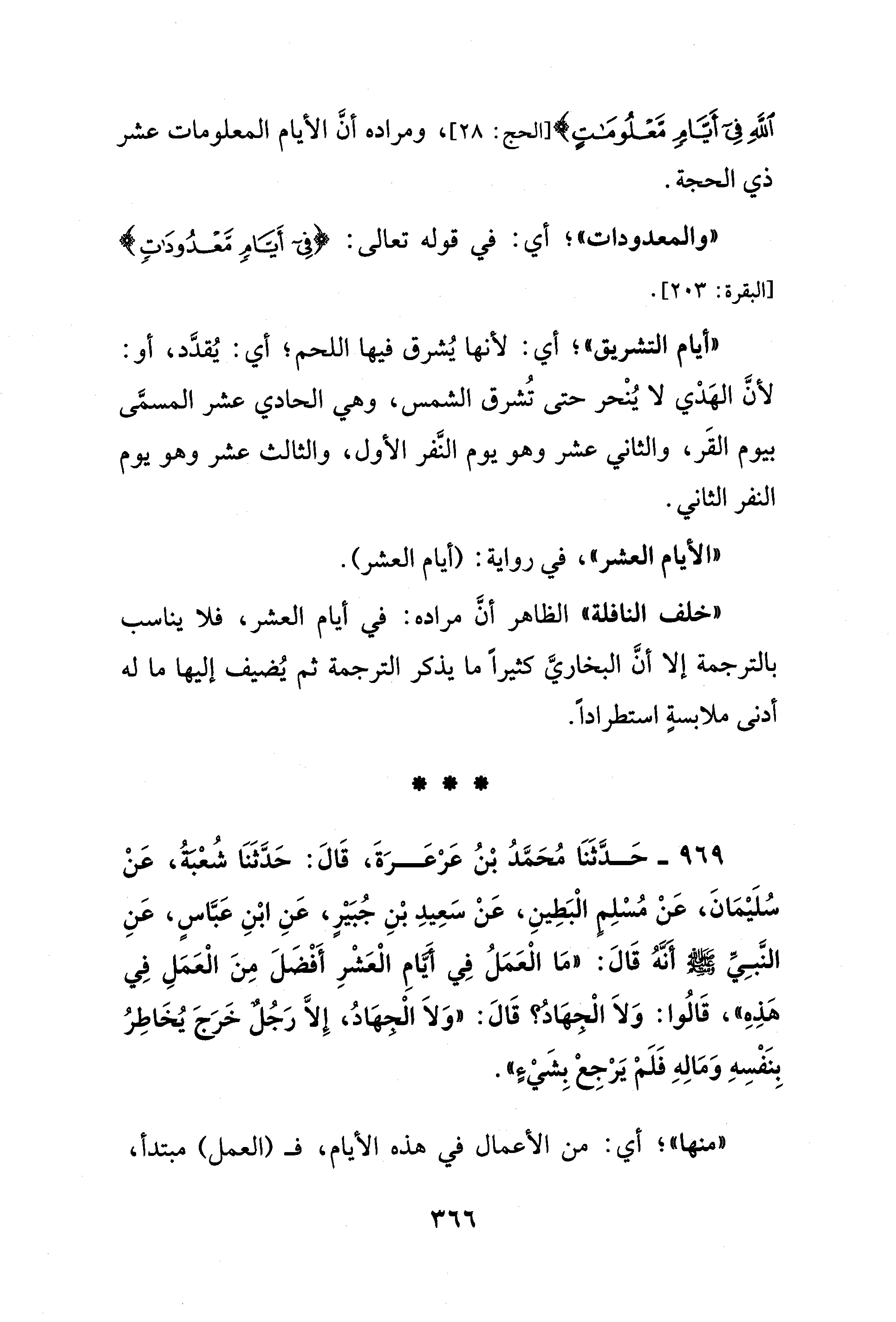 969 - حَدَّثَنَا مُحَمَّدُ بْنُ عَرْعَرَةَ، قَالَ: حَدَّثَنَا شُعْبَةُ، عَنْ سُلَيْمَانَ، عَنْ مُسْلِمٍ الْبَطِينِ، عَنْ سَعِيدِ بْنِ جُبَيْرٍ، عَنِ ابْنِ عَبَّاسٍ، عَنِ النَّبِيِّ - صلى الله عليه وسلم - أنَّهُ قَالَ: "مَا الْعَمَلُ فِي أَيَّامِ الْعَشْرِ أَفْضَلَ مِنَ الْعَمَلِ فِي هَذِهِ"، قَالُوا: وَلاَ الْجِهَادُ؟ قَالَ: "وَلاَ الْجهَادُ، إِلَّا رَجُلٌ خَرَجَ يُخَاطِرُ بِنَفْسِهِ وَمَالِهِ فَلَمْ يَرْجِعْ بِشَيْءٍ".
