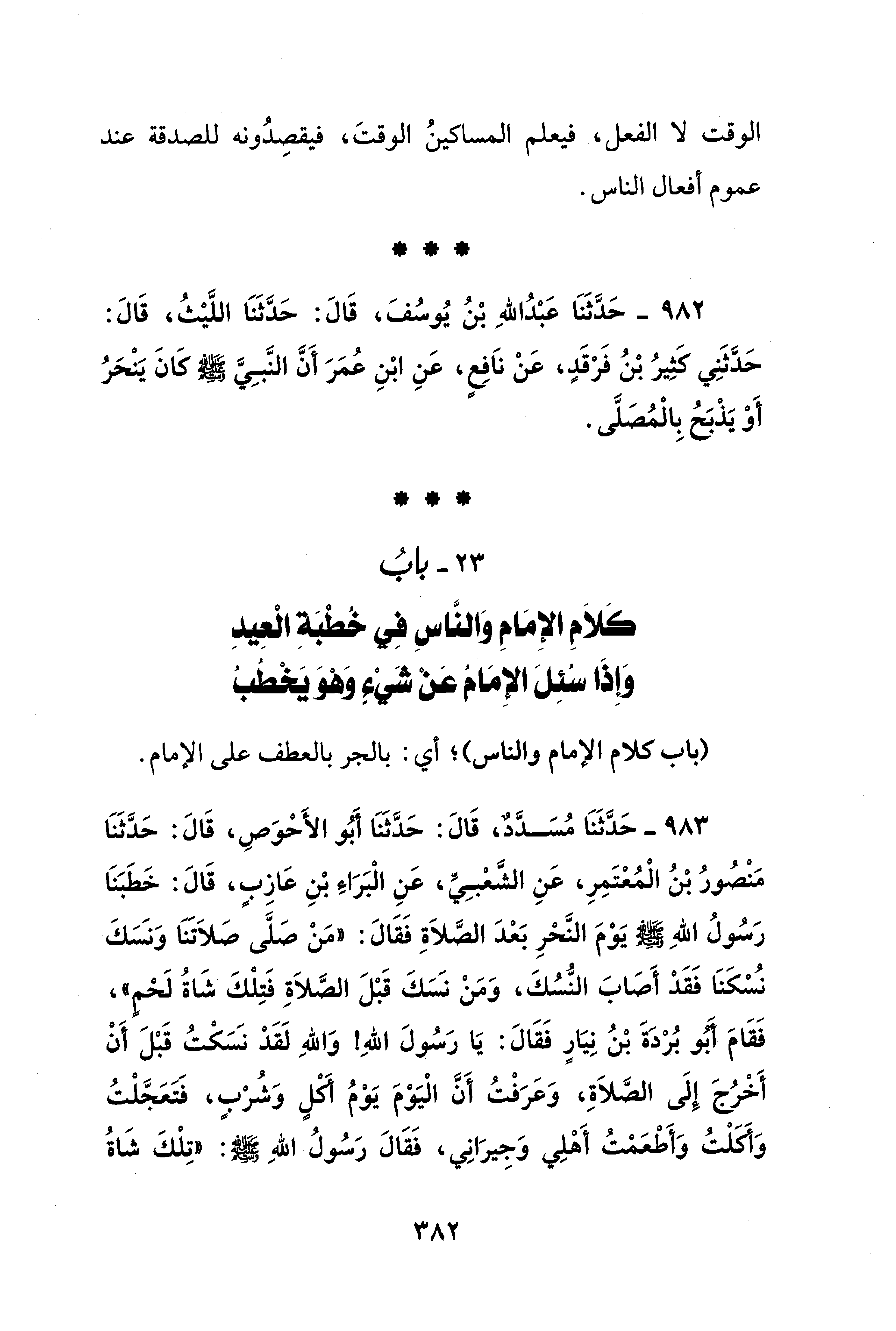 983 - حَدَّثَنَا مُسَدَّدٌ، قَالَ: حَدَّثَنَا أَبُو الأَحْوَصِ، قَالَ: حَدَّثَنَا مَنْصُورُ بْنُ الْمُعْتَمِرِ، عَنِ الشَّعْبِيِّ، عَنِ الْبَرَاءِ بْنِ عَازِبٍ، قَالَ: خَطَبَنَا رَسُولُ اللهِ - صلى الله عليه وسلم - يَوْمَ النَّحْرِ بَعْدَ الصَّلاَةِ فَقَالَ: "مَنْ صَلَّى صَلاَتنا وَنَسَكَ نُسْكَنَا فَقَدْ أَصَابَ النُّسُكَ، وَمَنْ نَسَكَ قَبْلَ الصَّلاَةِ فَتِلْكَ شَاةُ لَحْمٍ"، فَقَامَ أَبُو بُرْدَةَ بْنُ نِيَارٍ فَقَالَ: يَا رَسُولَ اللهِ! وَاللهِ لَقَدْ نَسَكْتُ قَبْلَ أَنْ أَخْرُجَ إِلَى الصَّلاَةِ، وَعَرَفْتُ أَنَّ الْيَوْمَ يَوْمُ أكل وَشُرْبٍ، فتعَجَّلْتُ وَأَكَلْتُ وَأَطْعَمْتُ أَهْلِي وَجِيرَانِي، فَقَالَ رَسُولُ اللهِ - صلى الله عليه وسلم -: "تِلْكَ شَاةُ