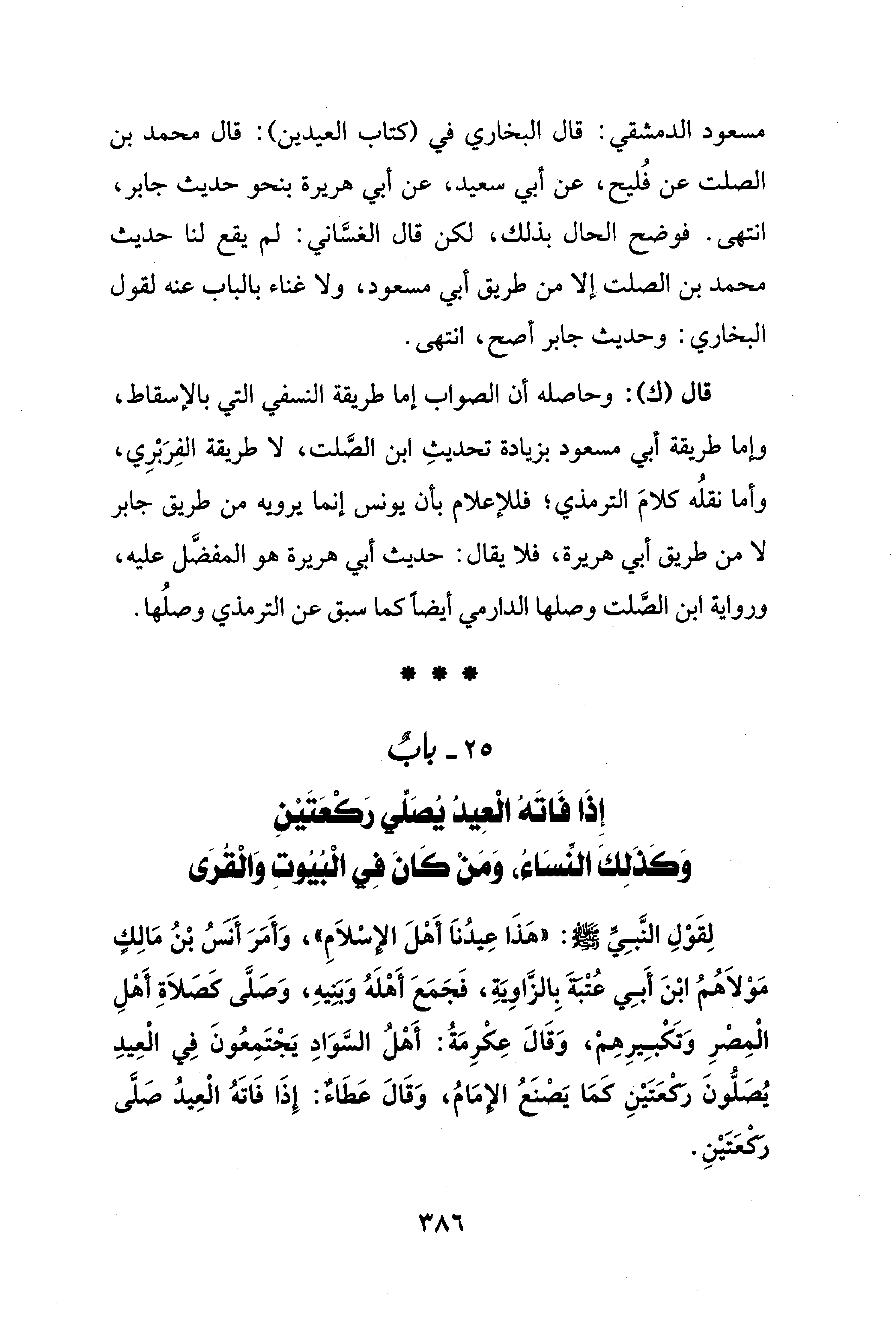 مسعود الدمشقي: قال البخاري في (كتاب العيدين): قال محمد بن الصلت عن فُليح، عن أبي سعيد، عن أبي هريرة بنحو حديث جابر، انتهى. فوضح الحال بذلك، لكن قال الغسَّاني: لم يقع لنا حديث محمد بن الصلت إلا من طريق أبي مسعود، ولا غناء بالباب عنه لقول البخاري: وحديث جابر أصح، انتهى.