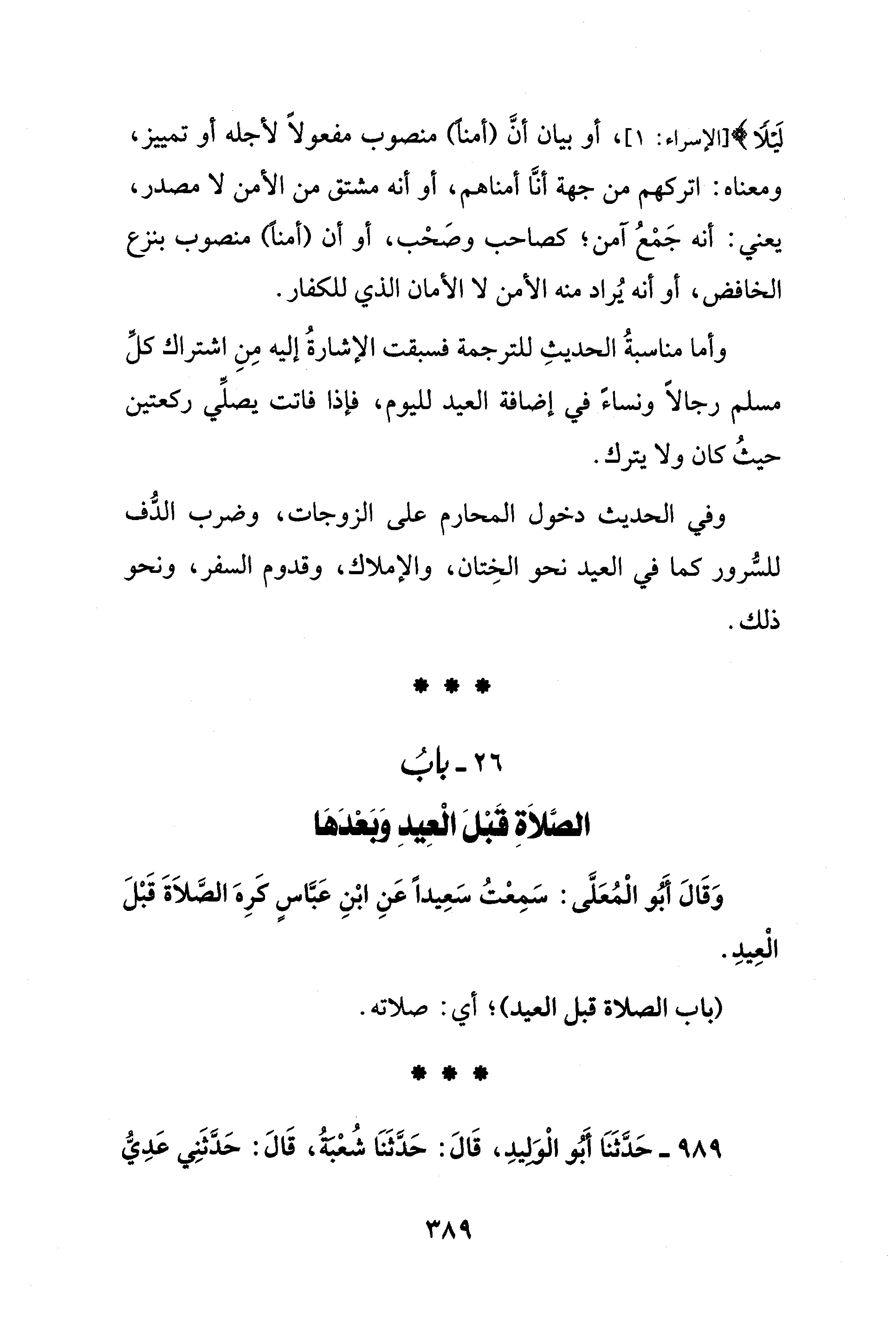 وأما مناسبةُ الحديثِ للترجمة فسبقت الإشارةُ إليه مِنِ اشتراك كلِّ مسلم رجالًا ونساءً في إضافة العيد لليوم، فإذا فاتت يصلِّي ركعتين حيثُ كان ولا يترك. وفي الحديث دخول المحارم على الزوجات، وضرب الدُّف للسُّرور كما في العيد نحو الخِتان، والإملاك، وقدوم السفر، ونحو ذلك.